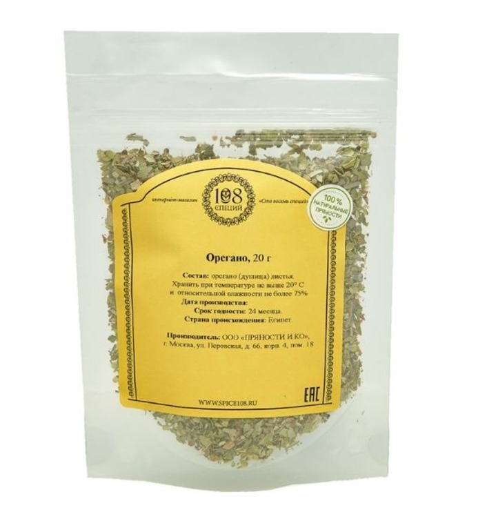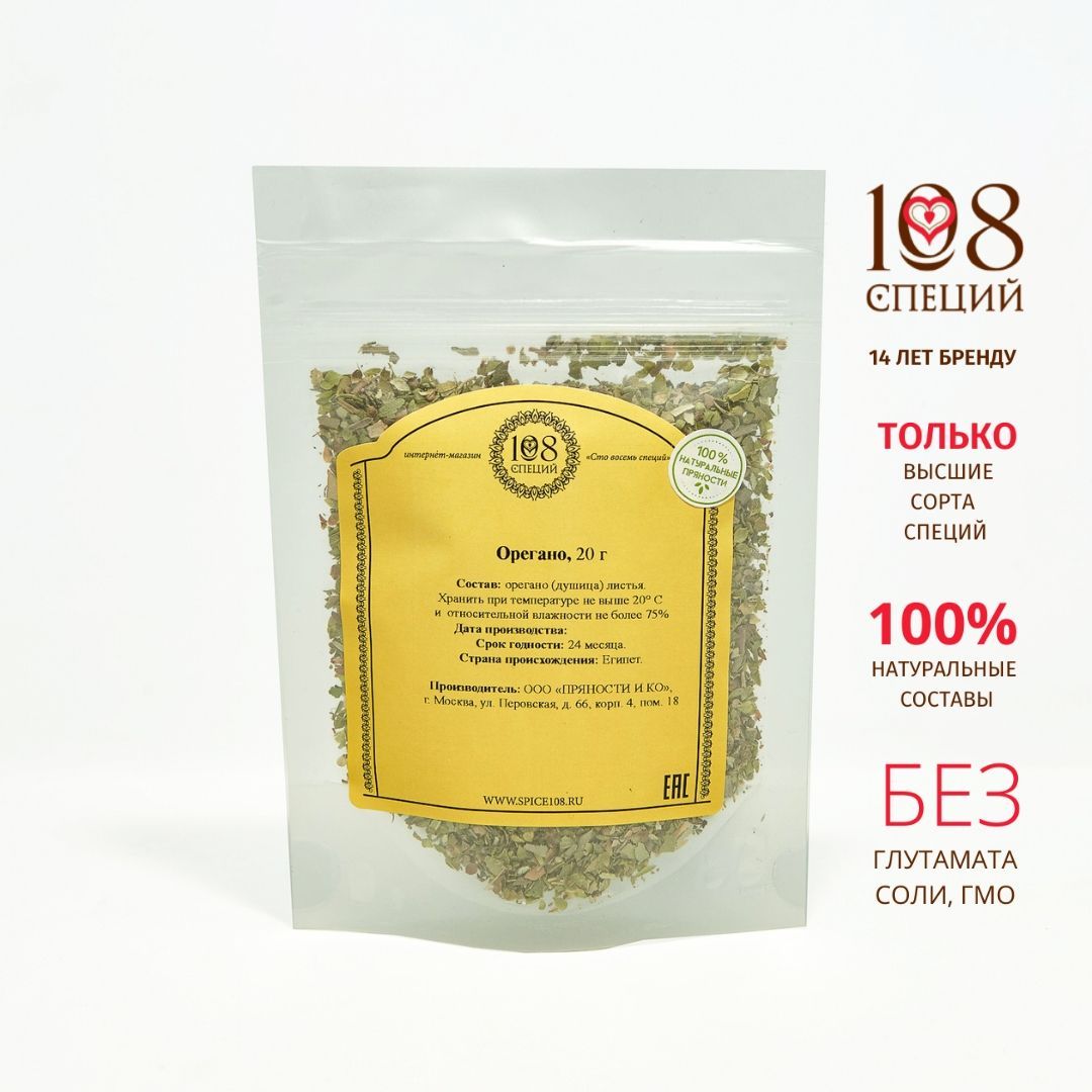 Орегано душица сушеные резаные листья и стебли высший сорт, 108 специй дой-пак с зипом 20 г, приправа для пиццы и сыра, для свежих салатов и блюд из картофеля, для антистресс-чая