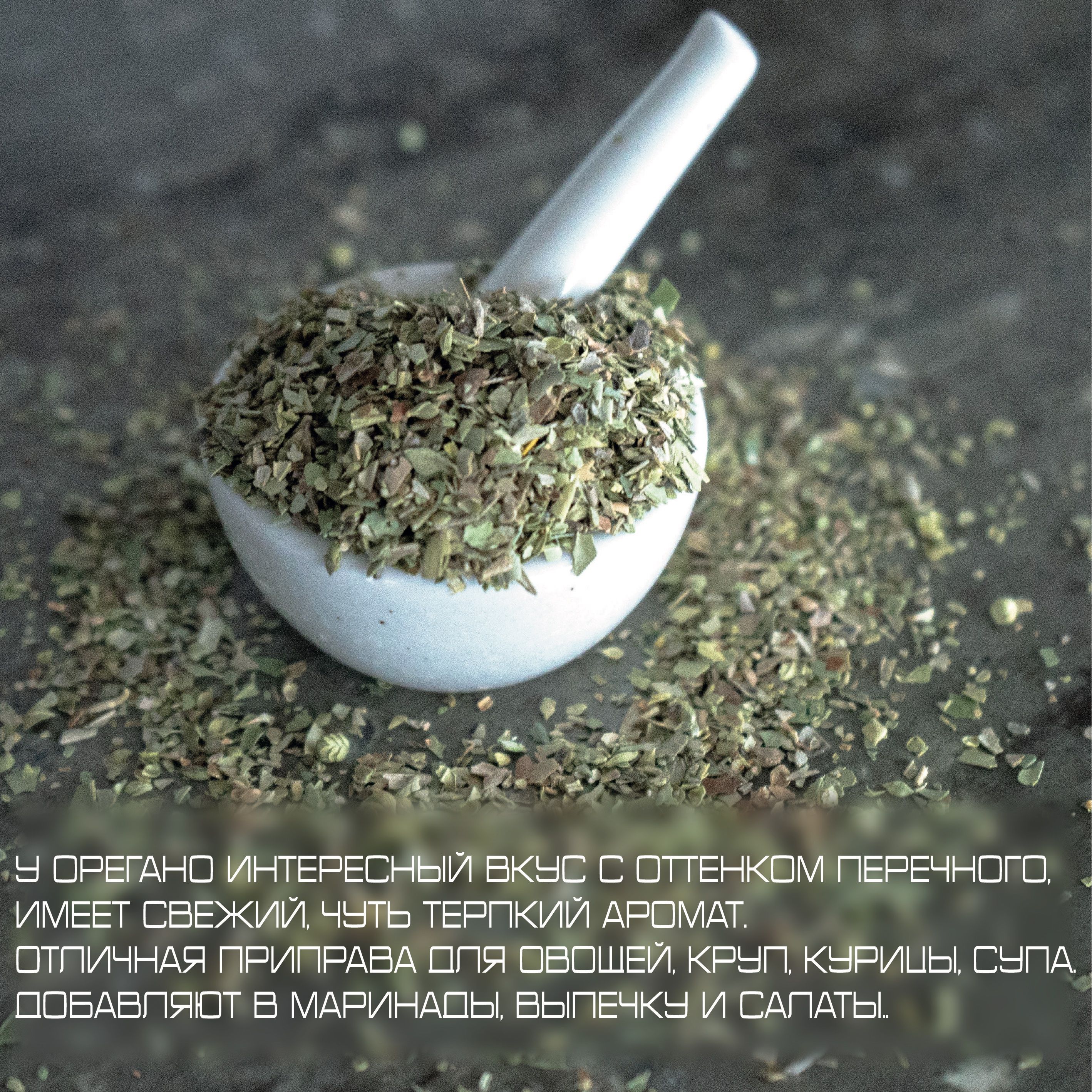 Описание: Текст при отключенной в браузере загрузке изображенийО специи сушеный ореганоПопулярная приправа, которую также называют душица. У орегано интересный вкус с оттенком перечного, имеет свежий, чуть терпкий аромат. Чай с орегано любят многие за великолепие вкуса, а также успокаивающий эффект. Это главная приправа для пиццы. Сушеная приправа часто применяется в блюдах средиземноморской кухни. Орегано – отличная приправа для овощей, круп. Душица хороша как приправа для курицы или приправа для супа. Не редко ее добавляют в маринады, выпечку и салаты. Сушеный резаный орегано используют для придания аромата растительным маслам.Текст при отключенной в браузере загрузке изображенийПолезные свойстваСпеция богата полезными веществами, калием, магнием, бета-каротином, фолиевой кислотой. Сушеная душица оказывает благоприятное влияние на работу ЖКТ, укрепляет эндокринную и сердечно-сосудистую системы. Дубильные вещества, содержащиеся в орегано эффективно очищают от шлаков и токсинов. Орегано станет незаменимой приправой на Вашей кухне, укрепит здоровье и придаст блюдам удивительный терпкий вкус и аромат.Текст при отключенной в браузере загрузке изображенийУдобная упаковкаНаши приправы, специи и пряности приходят к Вам в удобной упаковке Дой-пак с многоразовой застежкой zip lock. Вы всегда можете закрыть упаковку, чтобы сохранить все вкусы и ароматы Ваших специй, приправ и пряностей.