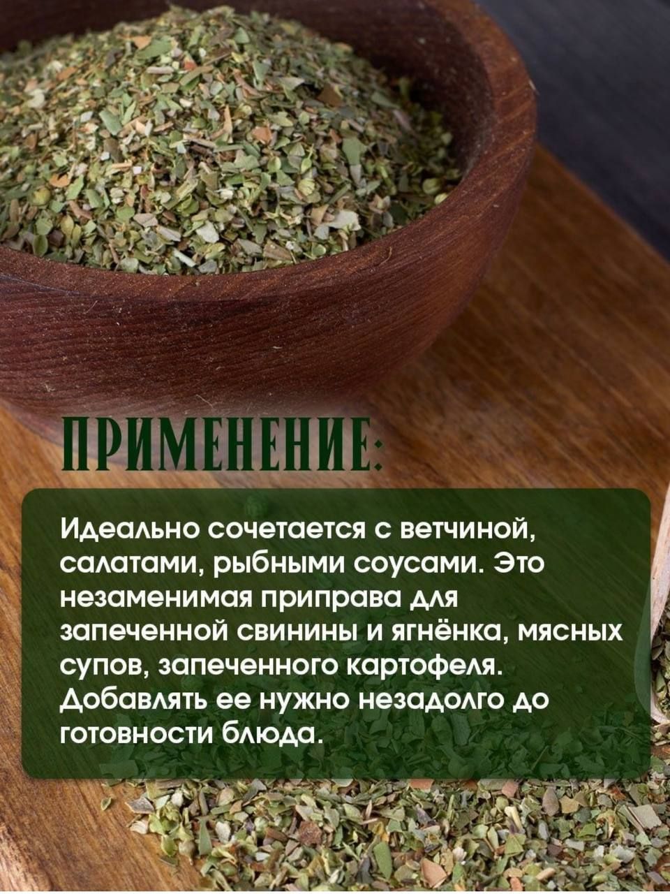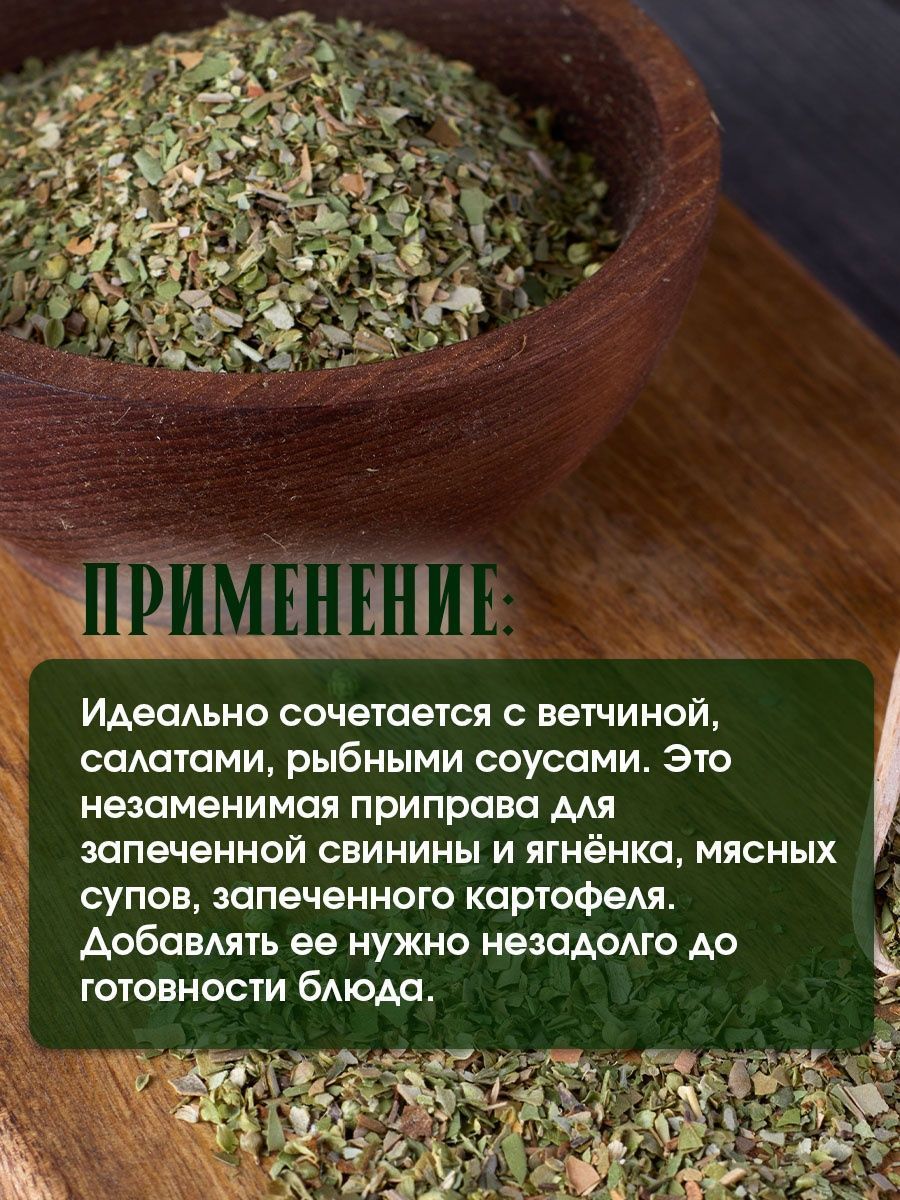 Описание: Орегано - это сушеная приправа, которая используется в кулинарии. Орегано идеально сочетается с ветчиной, салатами, рыбными соусами. Это незаменимая приправа для запечённой свинины и ягнятины, мясных супов, запечённого картофеля. Добавлять ее нужно незадолго до готовности блюда. По вкусу орегано сравнивают с майораном.Крупными листьями приправляют супы, рыбные блюда, крабов и яйца. Полезные свойства: дезинфицирующее, противовоспалительное, мочегонное средство, а также антисептик. Регулирует работу органов пищеварения, лечит болезни желудка. Орегано используют для лечения дыхательных путей, при вздутии живота, при отравлениях.Дополнительно, орегано входит в линейку разновидности душицы, что делает еще привлекательнее для кулинаров. Душица принцесса пряности и ароматного вкуса, и добавление в составе орегано делает приправу привлекательной для использования в рецептах кулинарии.Орегано специя и приправа, которая дает утонченный вкус блюдам и напитана полезными свойствами. Такая пряность насыщена антиоксидантами, которые помогают защитить организм от вредных свободных радикалов. Орегано также содержит ряд витаминов и минералов, которые укрепляет иммунитет и поддерживает здоровье.Выводя наше описание орегано специи и приправы из списка бакалеи, подмечаем, что oreganos незаменимый ингредиент в кулинарии и блюда становятся неповторимого аромата и вкуса. Будь то мясо или салаты, орегано сушеный и душица с легкостью поднимут кулинарную игру на новый уровень.