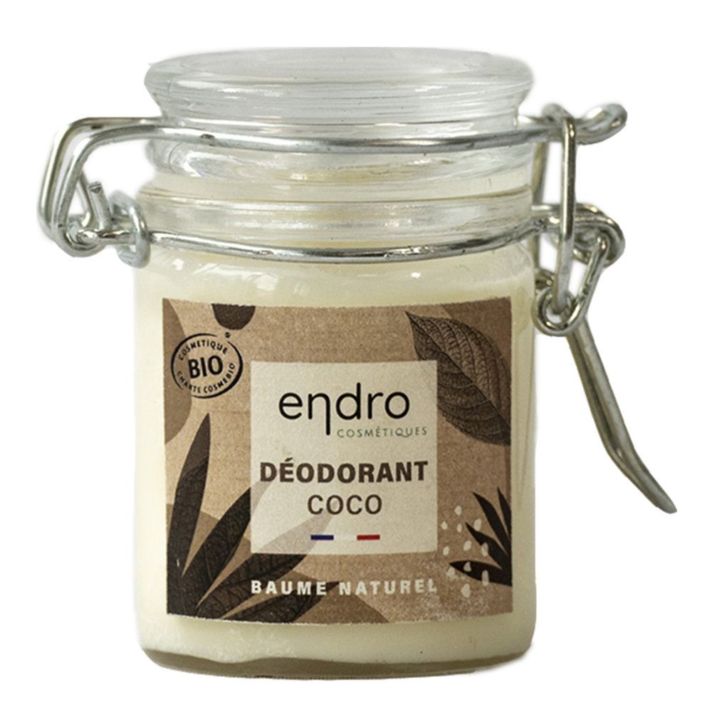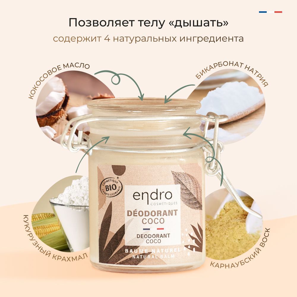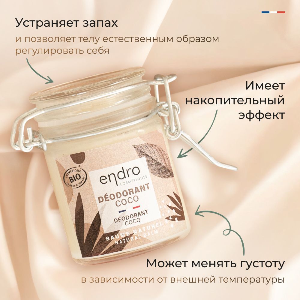 Органический бальзам-дезодорант с кокосовым маслом Endro Coconut Deodorant, 50 мл, в стеклянной банке, 100% натуральная формула, с ароматом кокоса, сделано во Франции