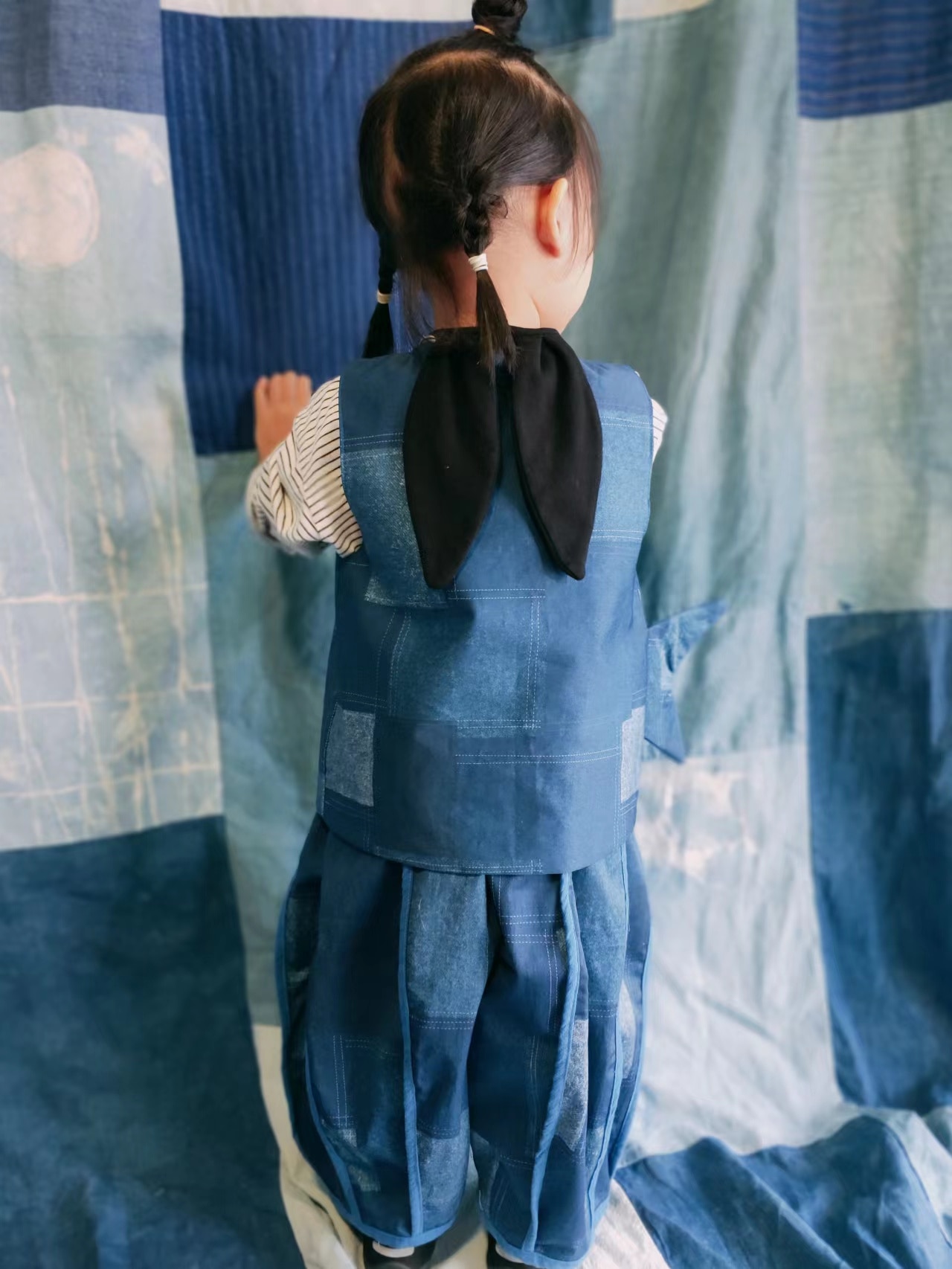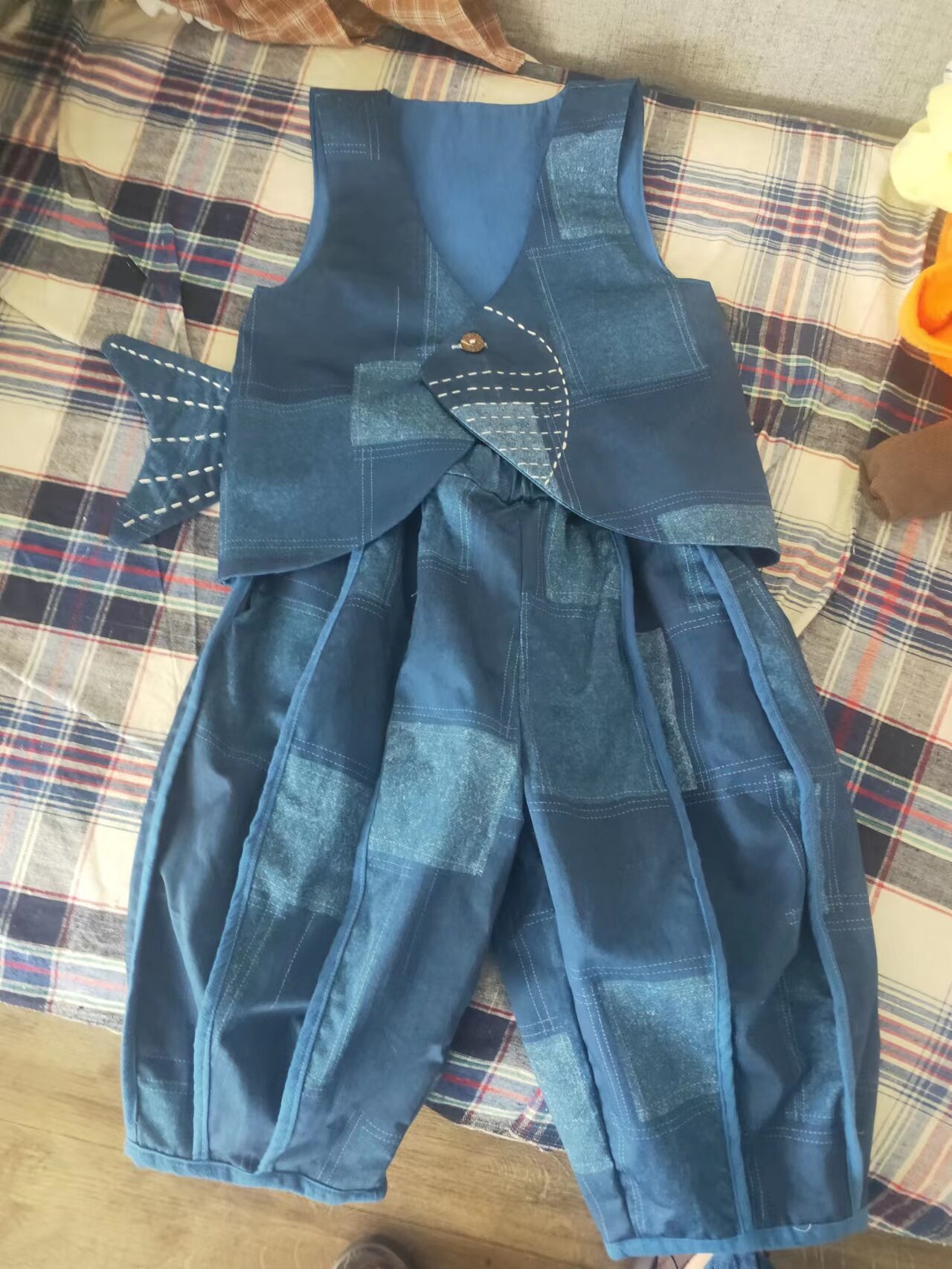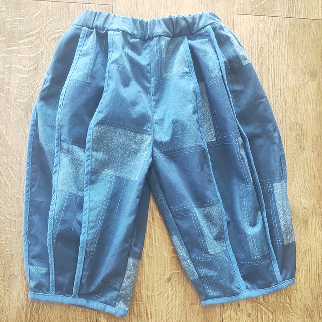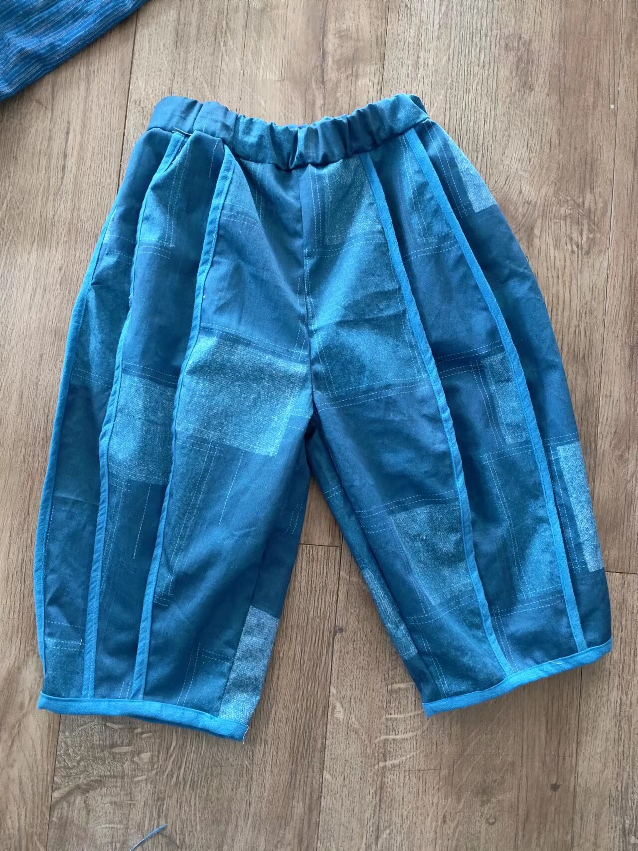 Изделие изготовлено из хлопковой ткани темно-синего и синего цветов в стиле пэчворк. Брюки выглядят как бутоны.