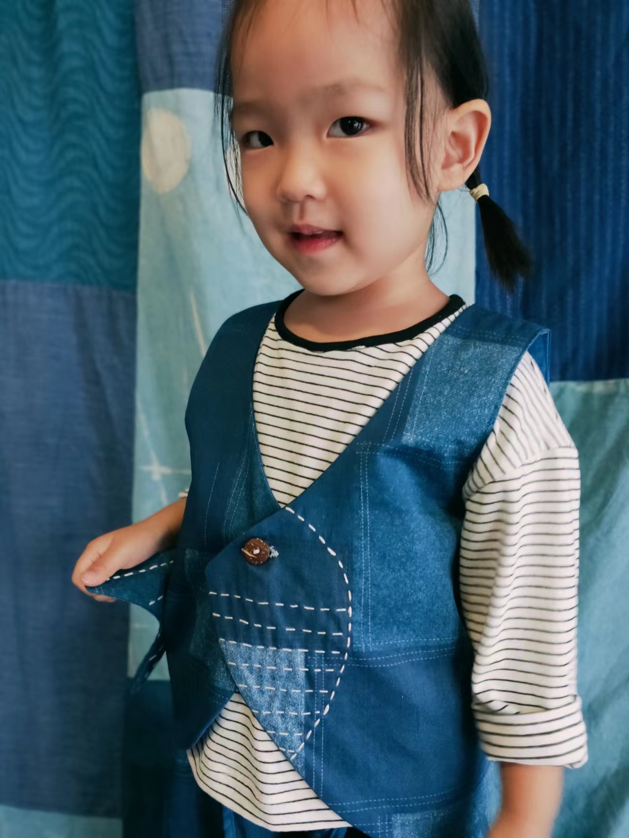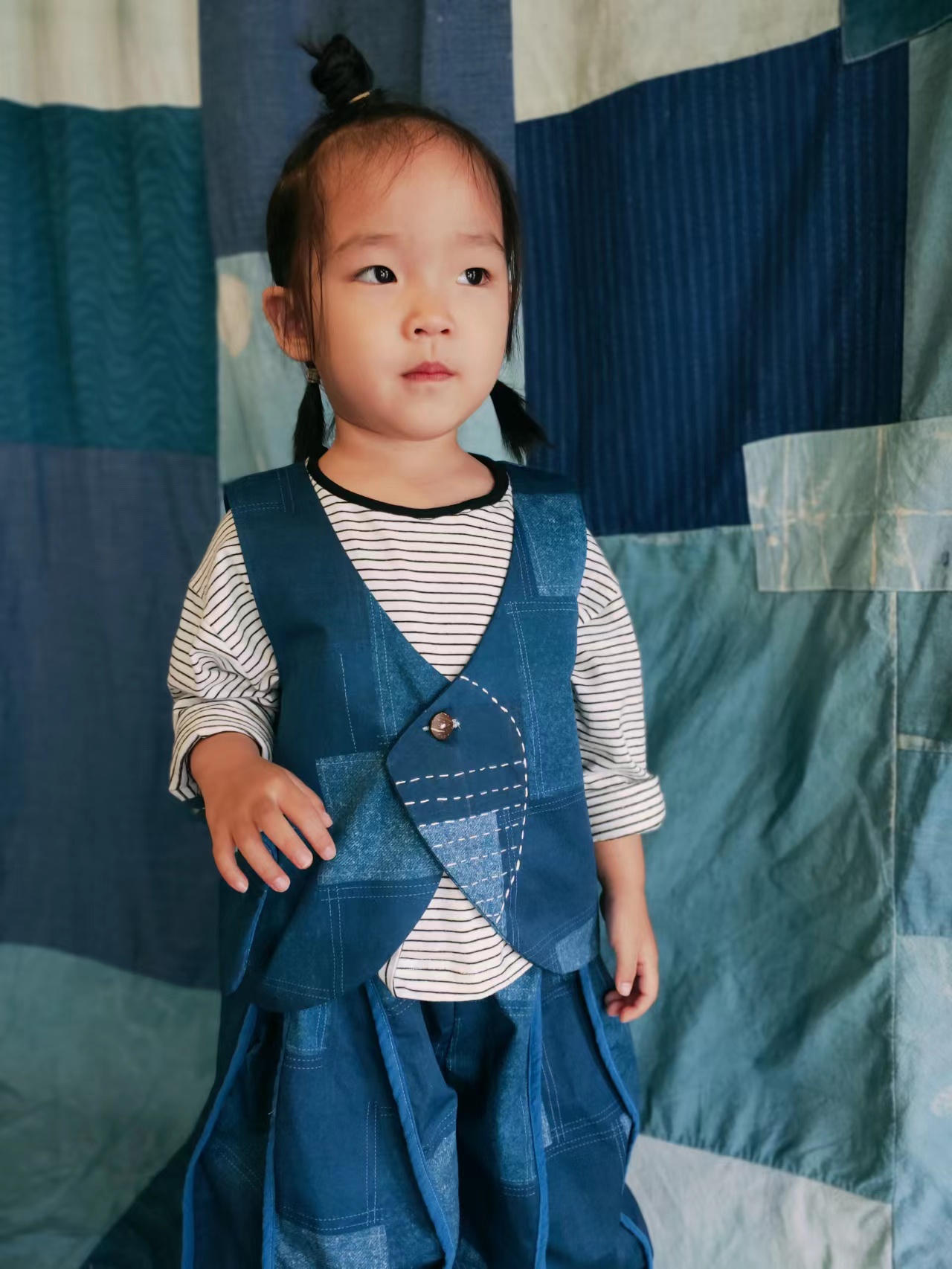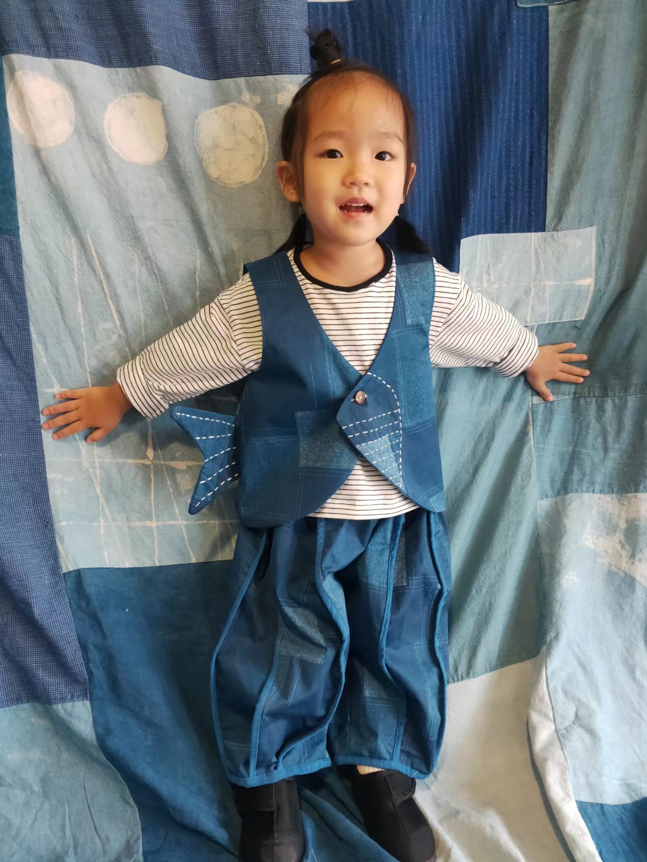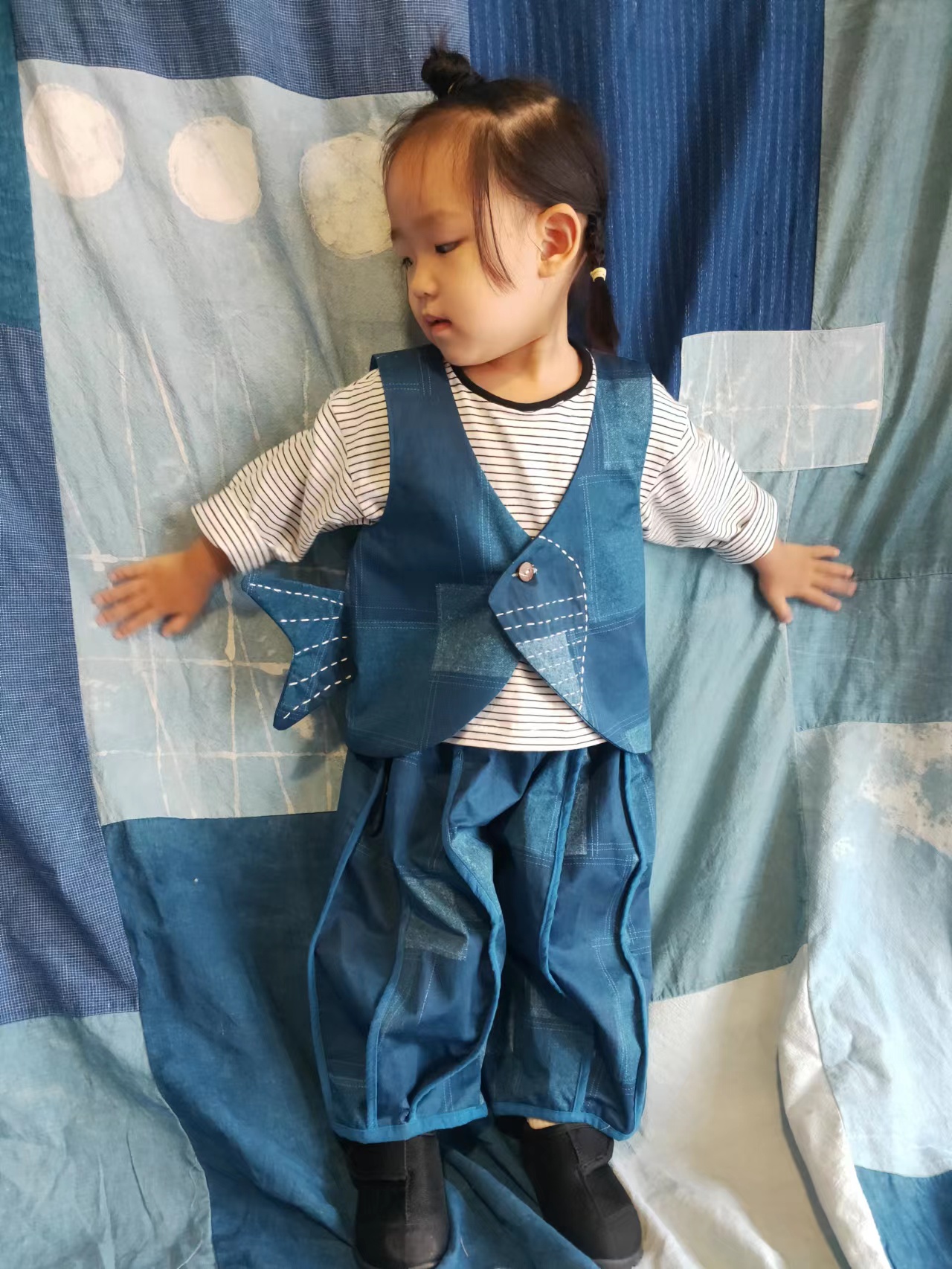 Изделие изготовлено из хлопковой ткани темно-синего и синего цветов в стиле пэчворк. Брюки выглядят как бутоны.