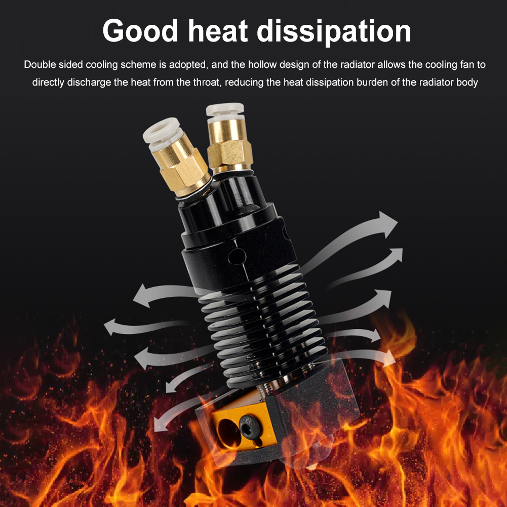 4. Хорошее рассеивание тепла:Этот двухцветный экструдер «Два в одном» использует двустороннюю схему охлаждения, а Полая Конструкция радиатора позволяет охлаждающему вентилятору напрямую отвести тепло из горловины. Таким образом, уменьшается тепловыделение корпуса радиатора. Эта конструкция не только обладает высоким тепловыделением, но и снижает засорение.