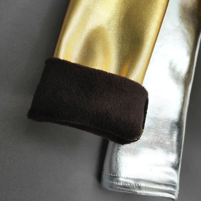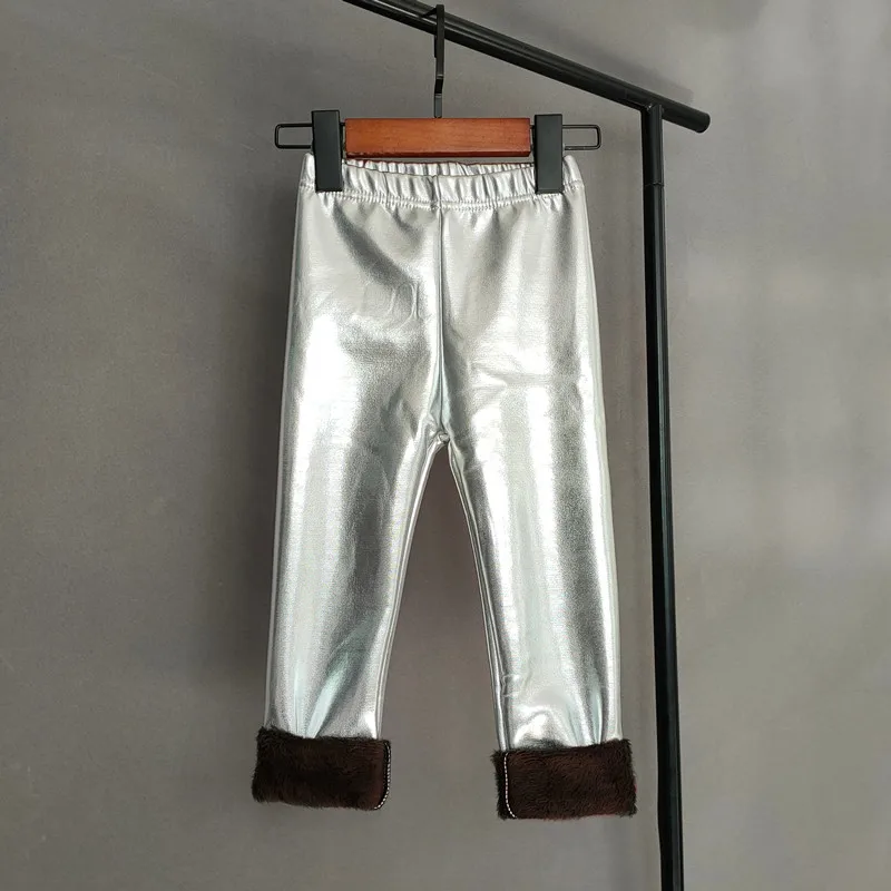 Осенне-зимние детские брюки, золотистые, серебристые, из искусственной кожи, плюшевые, бархатные брюки для девочек, блестящие теплые брюки, детские леггинсы