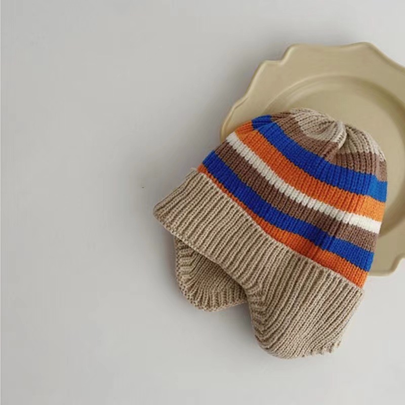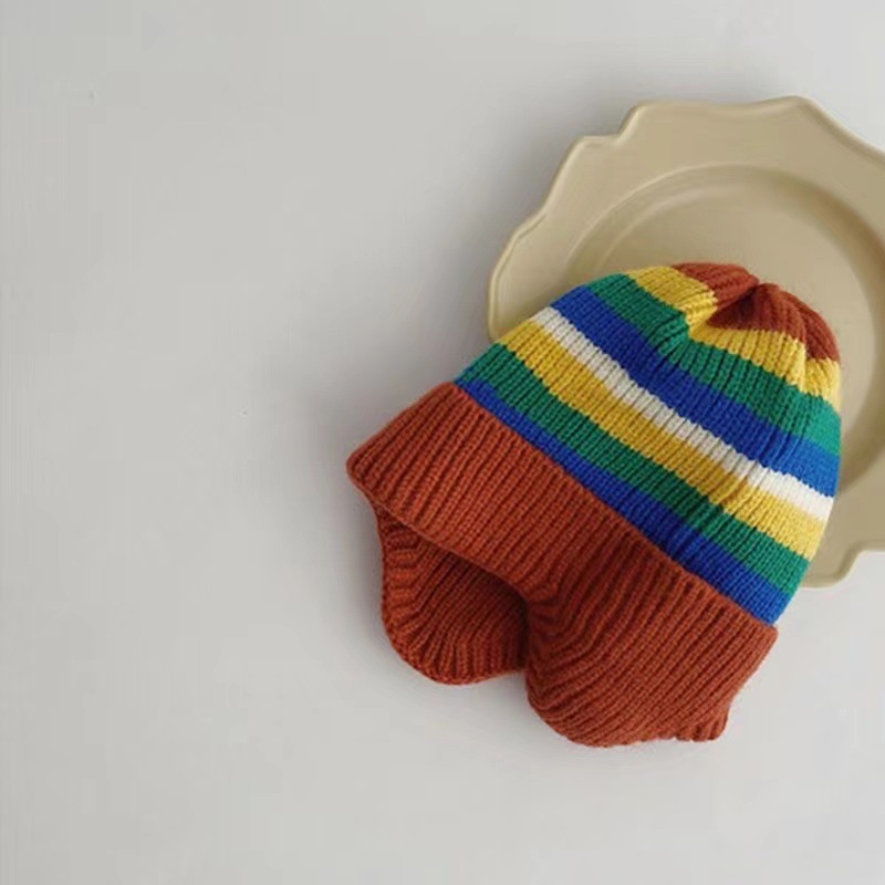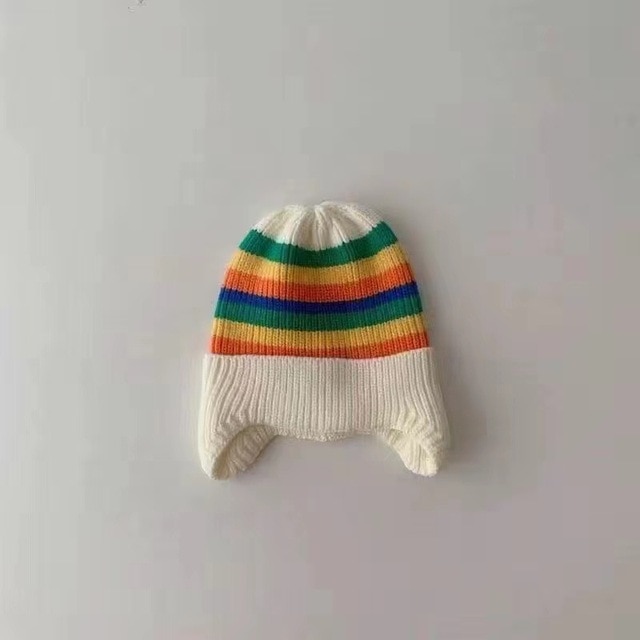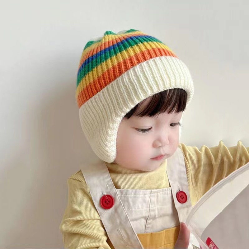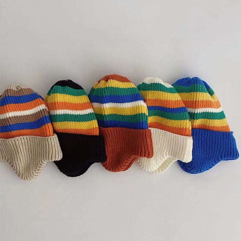 Осенне-зимняя вязаная шапка для детей корейская модная полосатая Радужная детская шапка с защитой ушей эластичная детская шапочка для младенцев