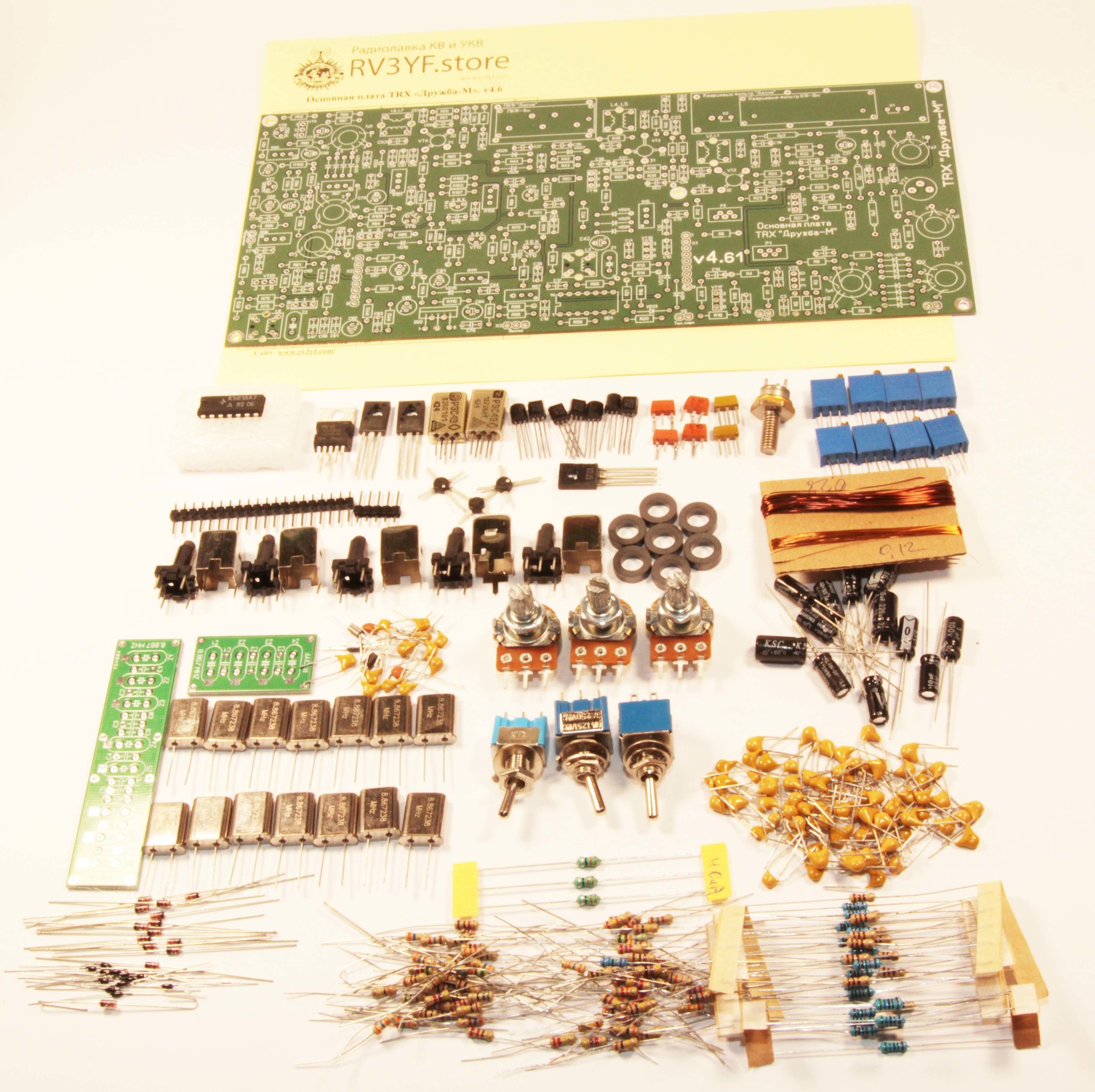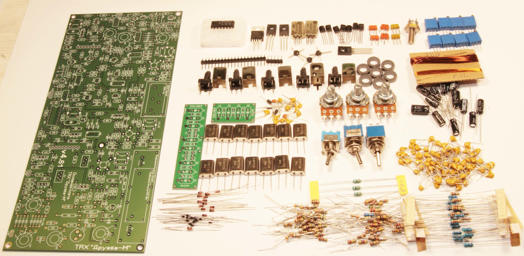 Состав набора: двухсторонняя печатная плата v4.61 с металлизацией отверстий, все радиоэлементы необходимые для монтажа: набор для самостоятельного изготовления кварцевых фильтров «Десна», микросхемы, транзисторы, диоды, каркасы контуров, провод, реле, разъемы, конденсаторы и резисторы.