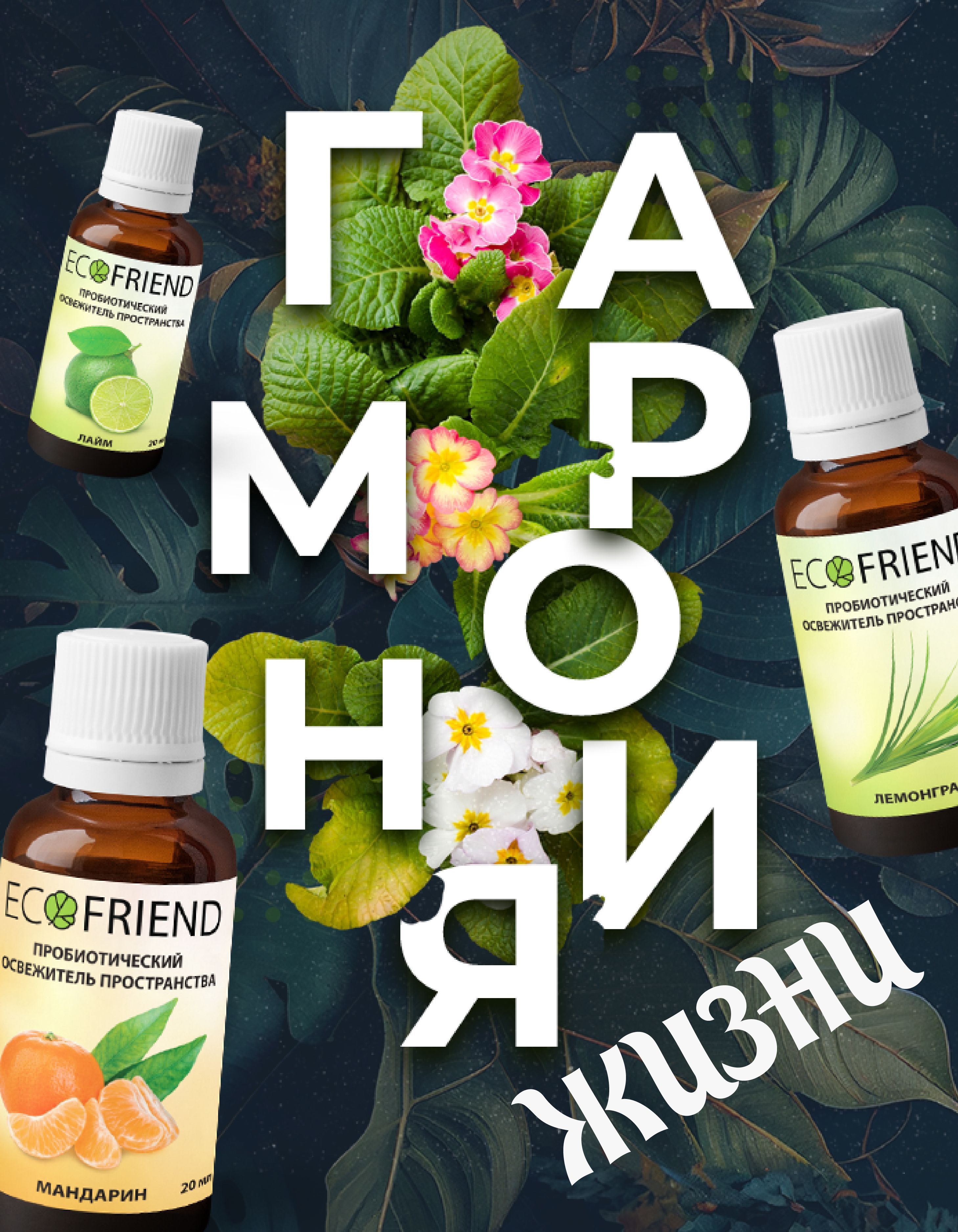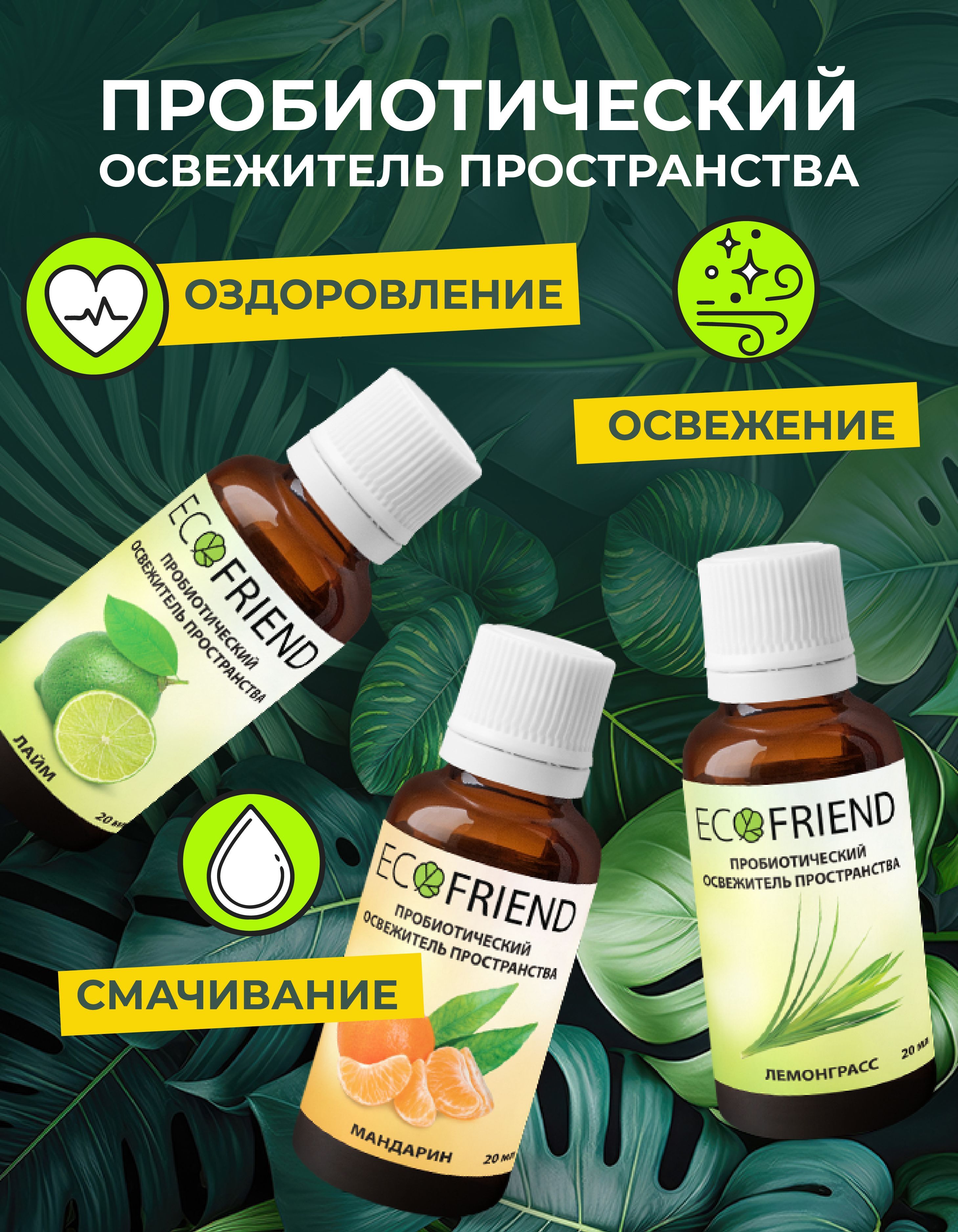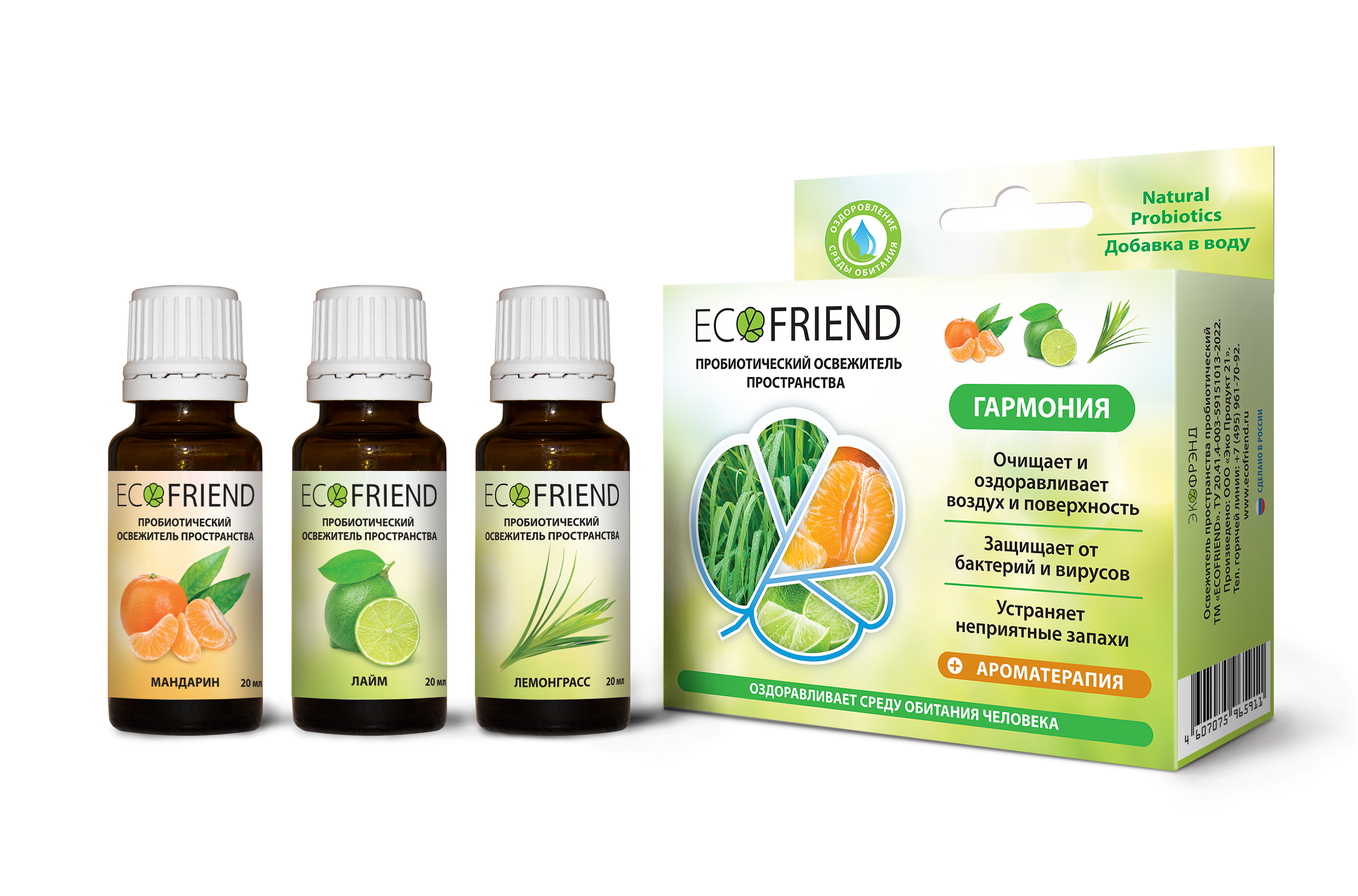 Пробиотический освежитель пространства т.м «ECOFRIEND» - друг в каждой семье. Состав: Экстракт растительных масел, АПАВ<10, НПАВ<10, АмфПАВ <5, пробиотик<0.1, вода