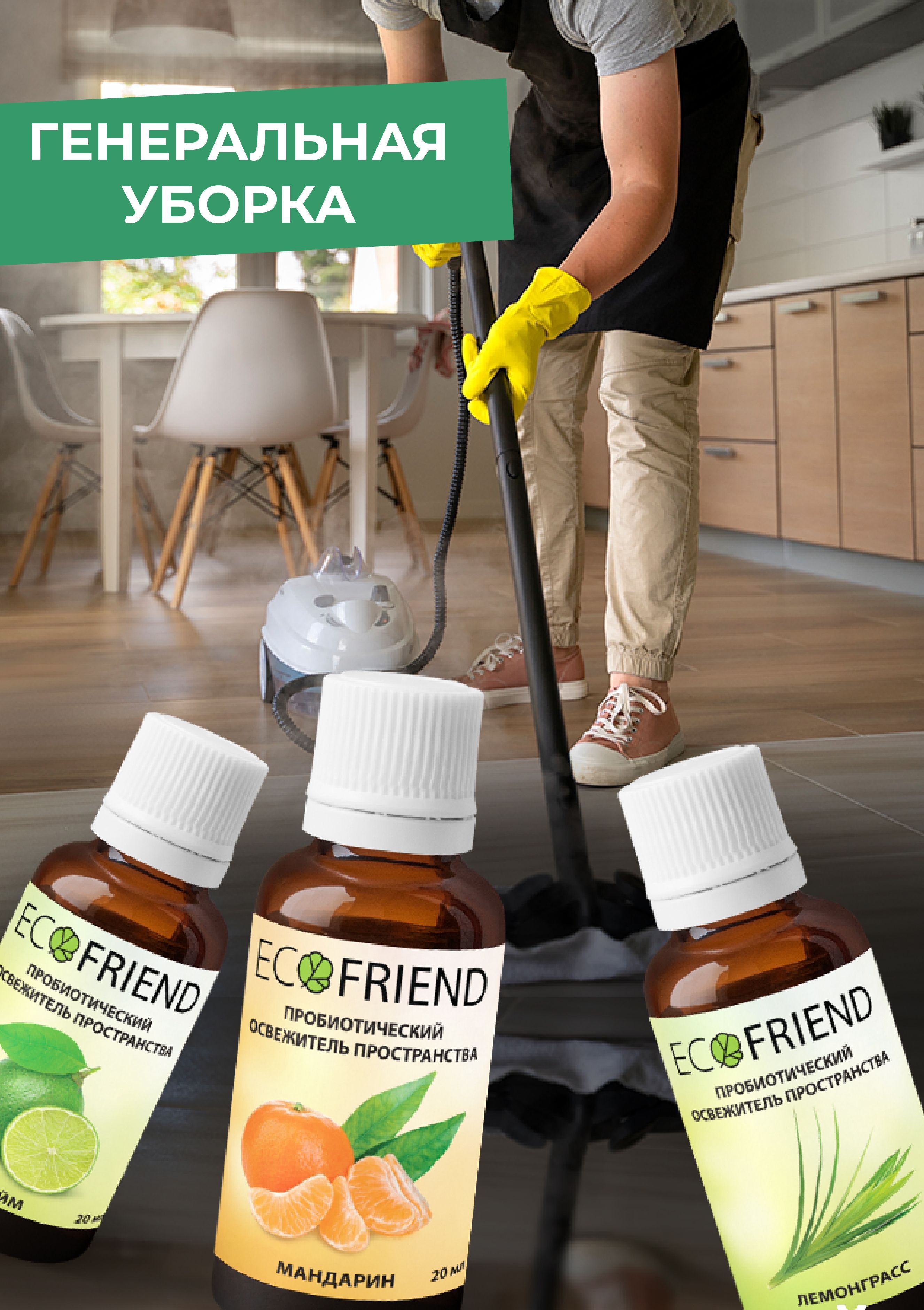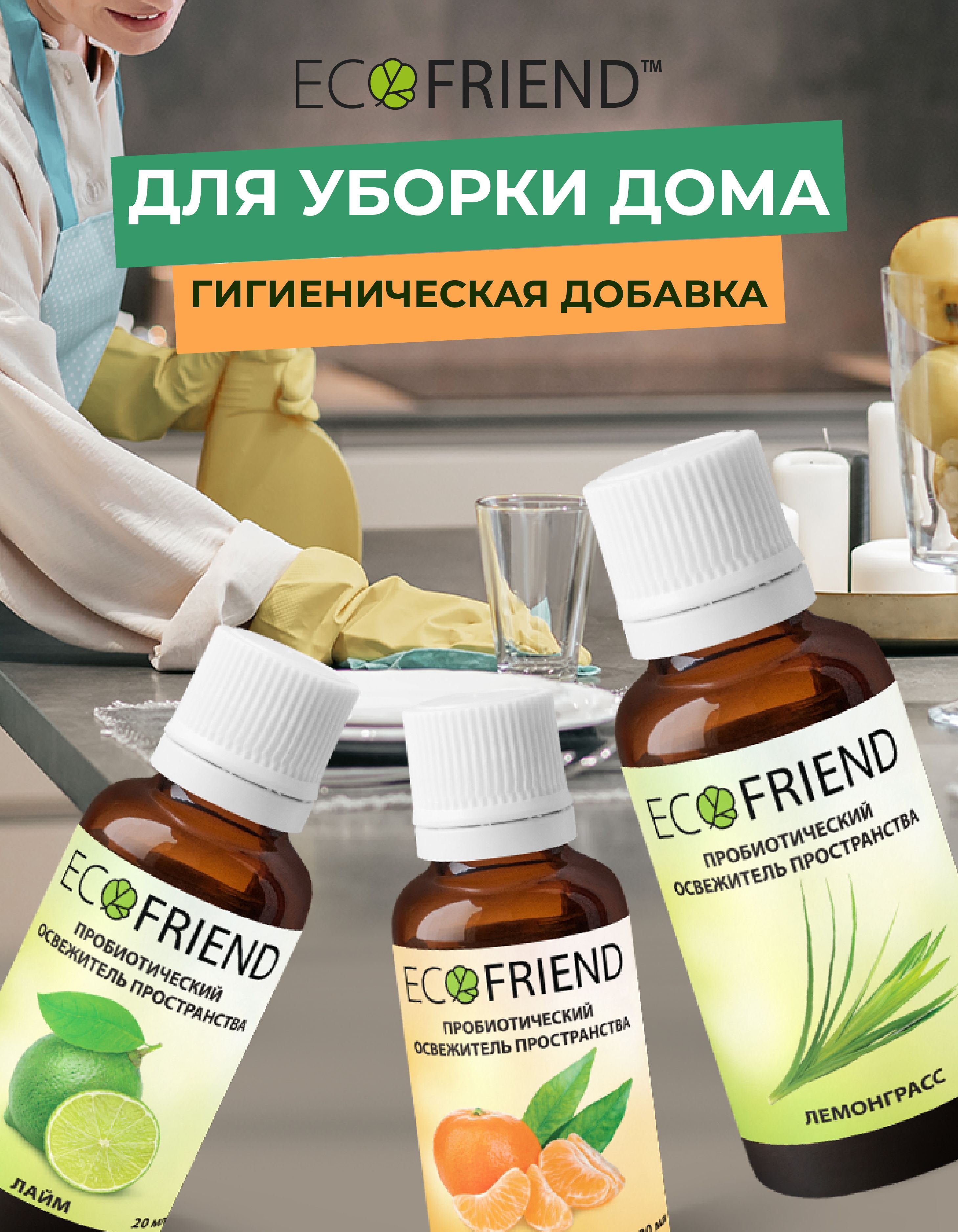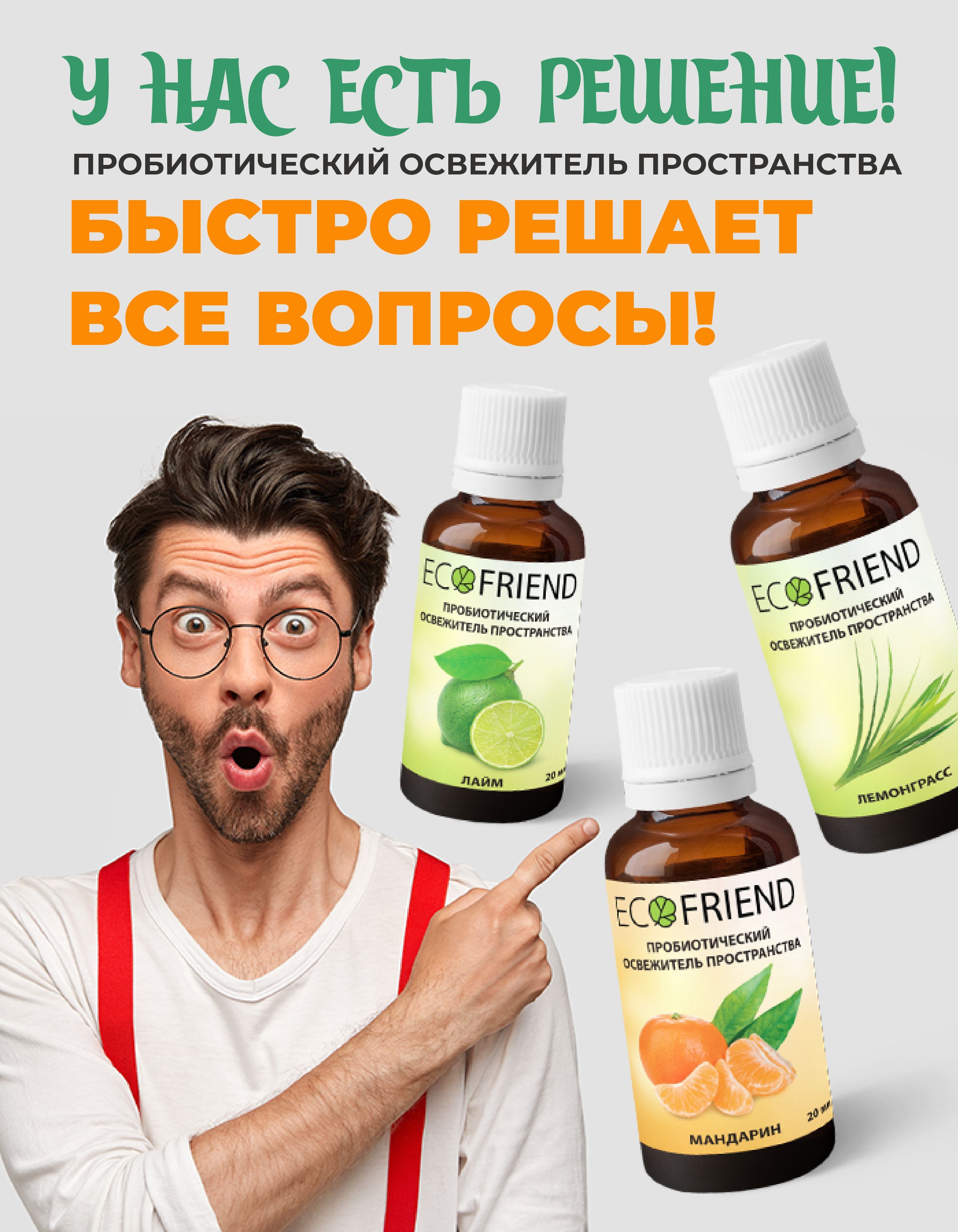 Пробиотический освежитель пространства т.м «ECOFRIEND» - друг в каждой семье. Состав: Экстракт растительных масел, АПАВ<10, НПАВ<10, АмфПАВ <5, пробиотик<0.1, вода