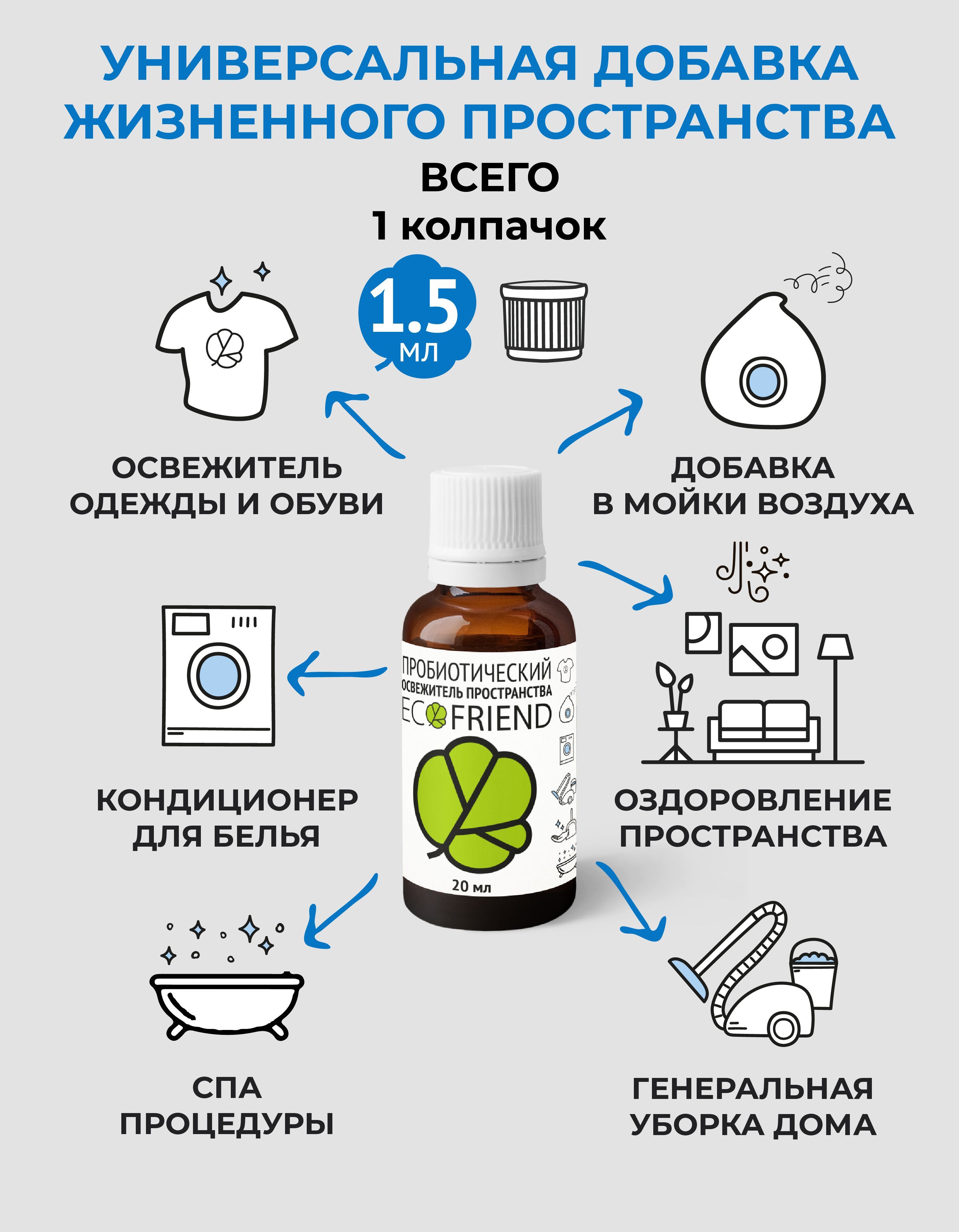 Пробиотический освежитель пространства ТМ «Ecofriend» является многофункциональной добавкой в воду и эффективно используется для: