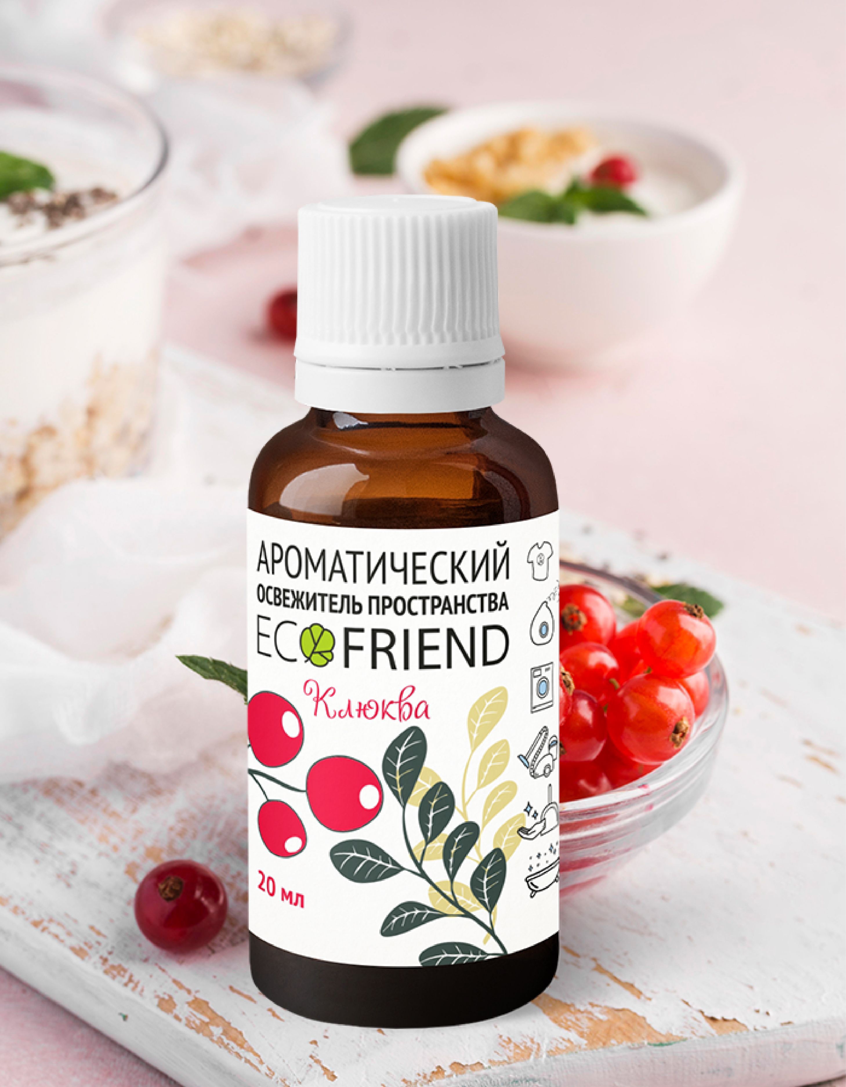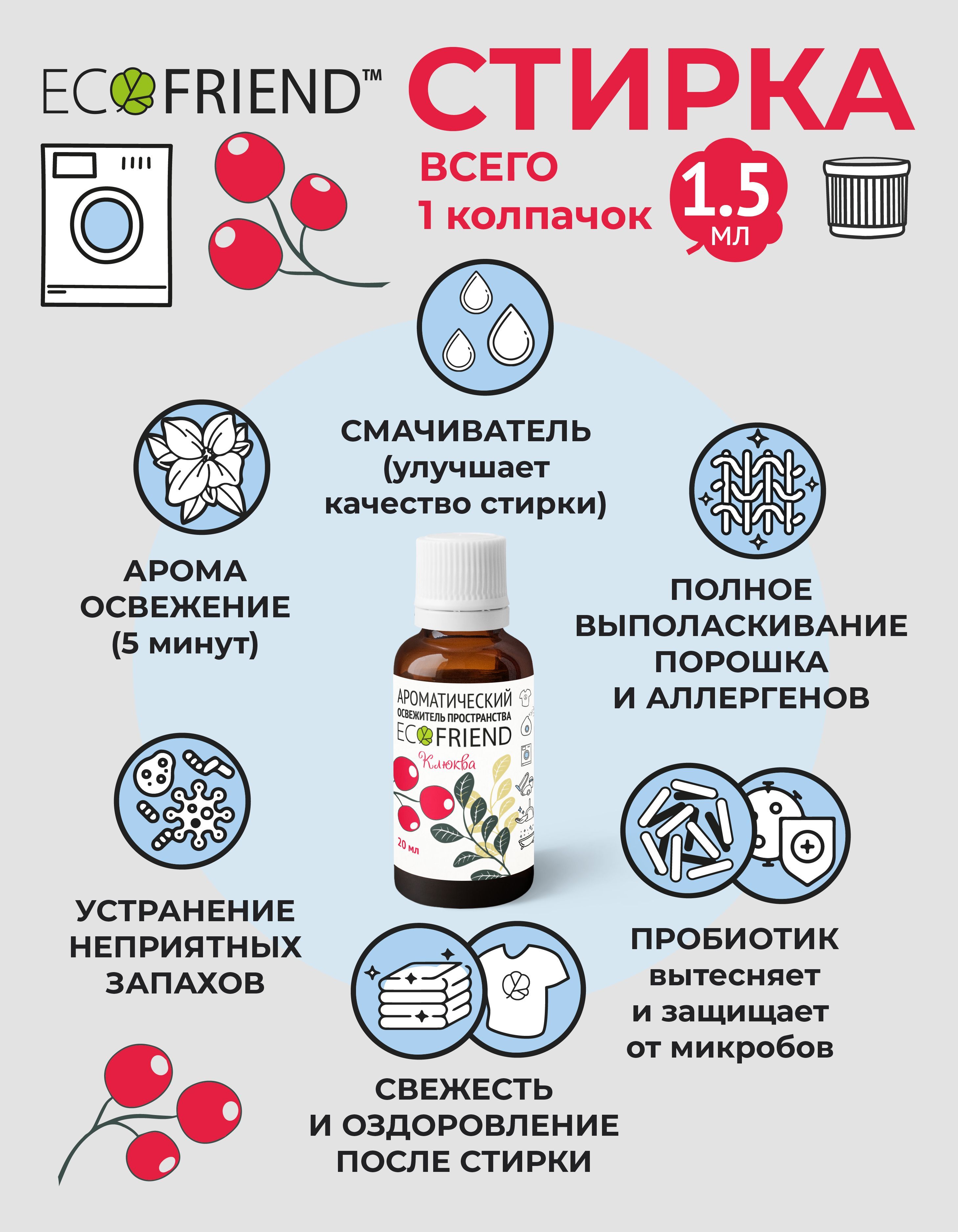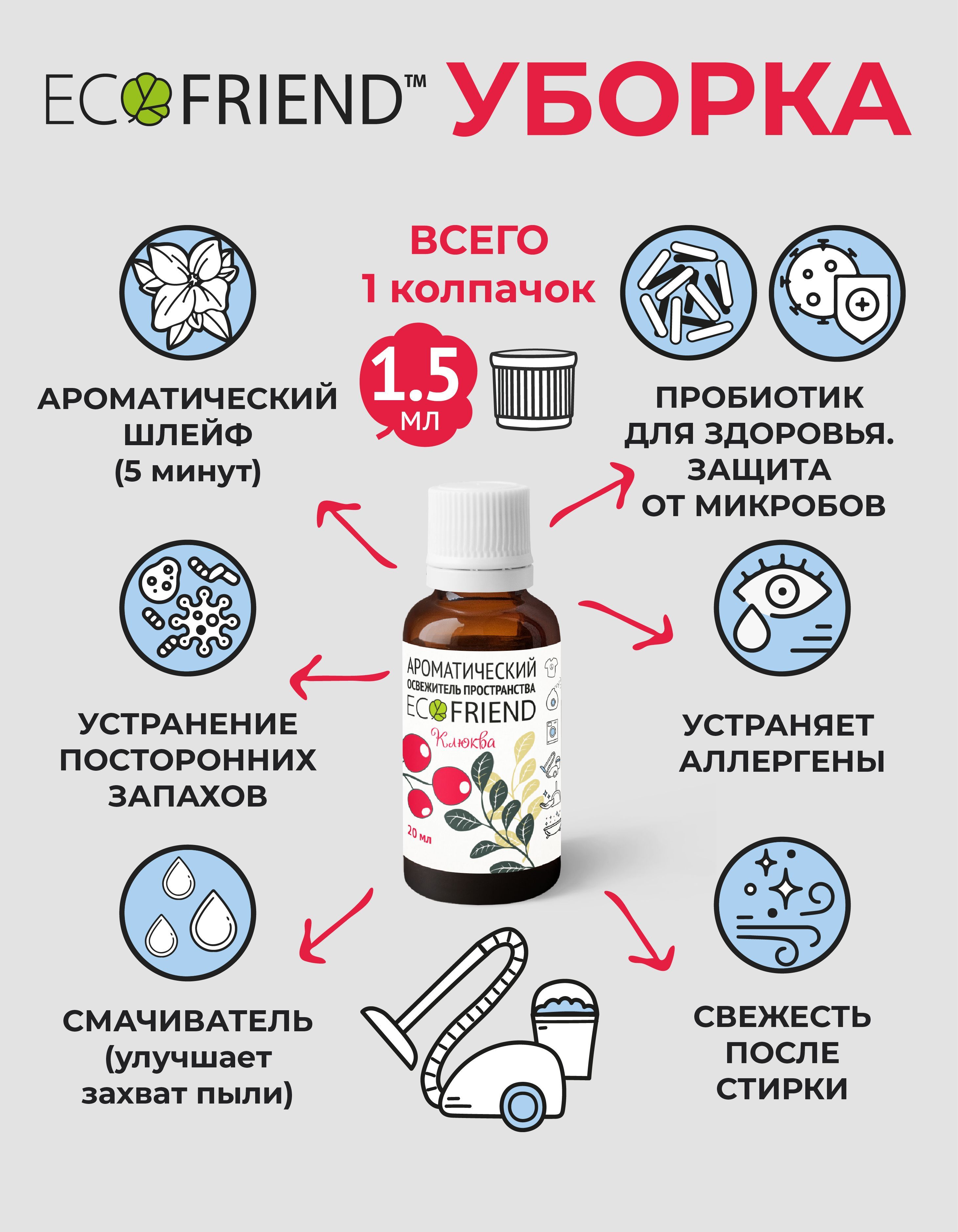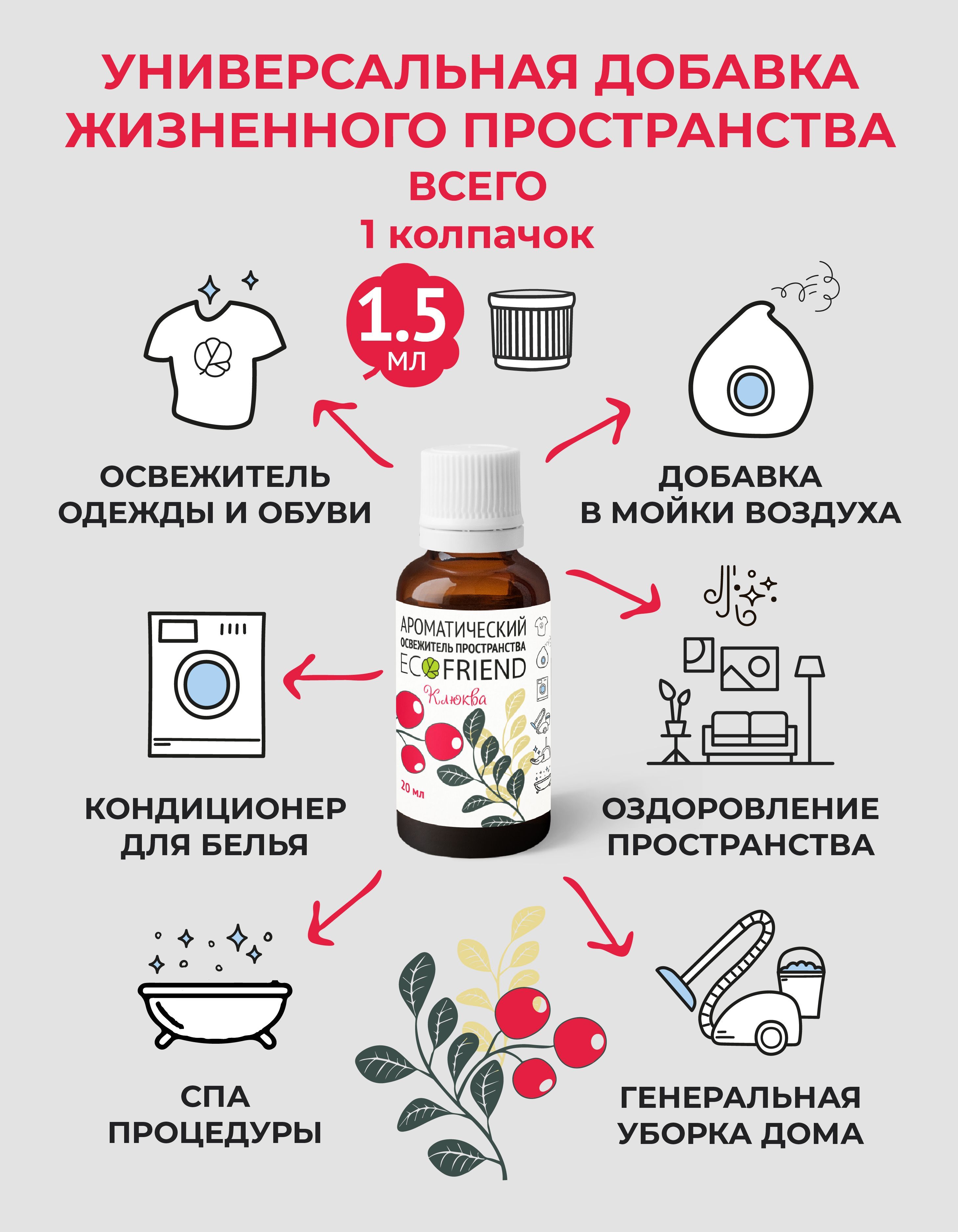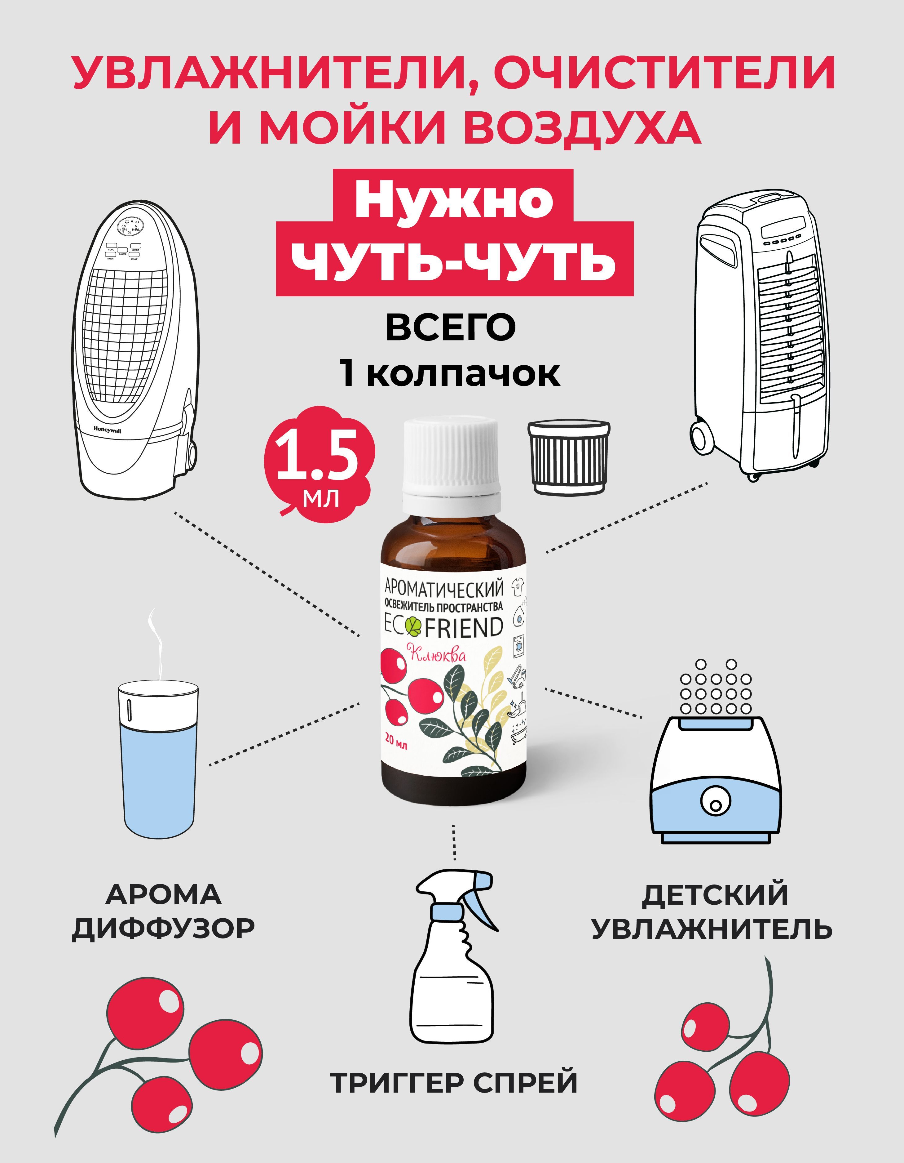 Описание: Ароматическая добавка в воду для увлажнителей и моек воздуха т.м. ECOFRIEND КЛЮКВА направленная, в первую очередь, на оздоровление воздуха и поверхности вокруг человека без применения дизинфектантов.