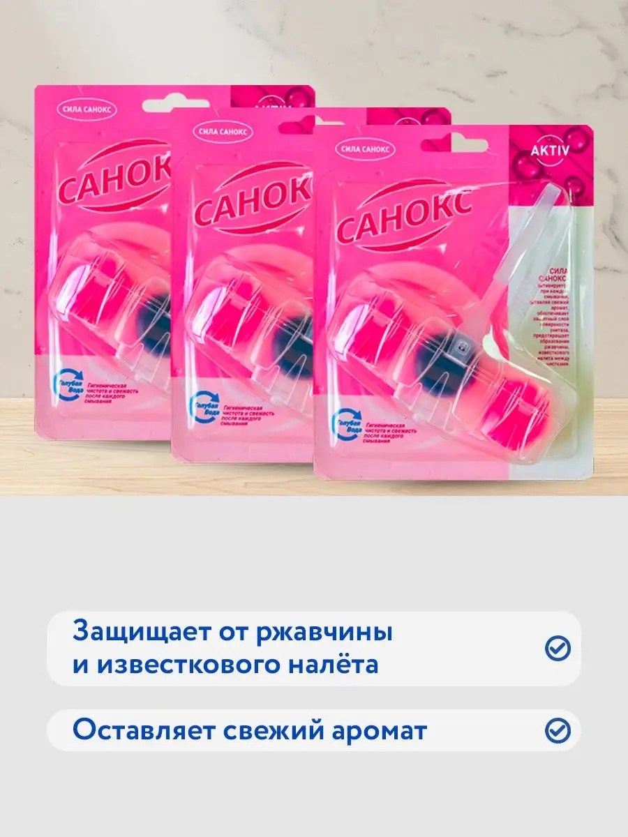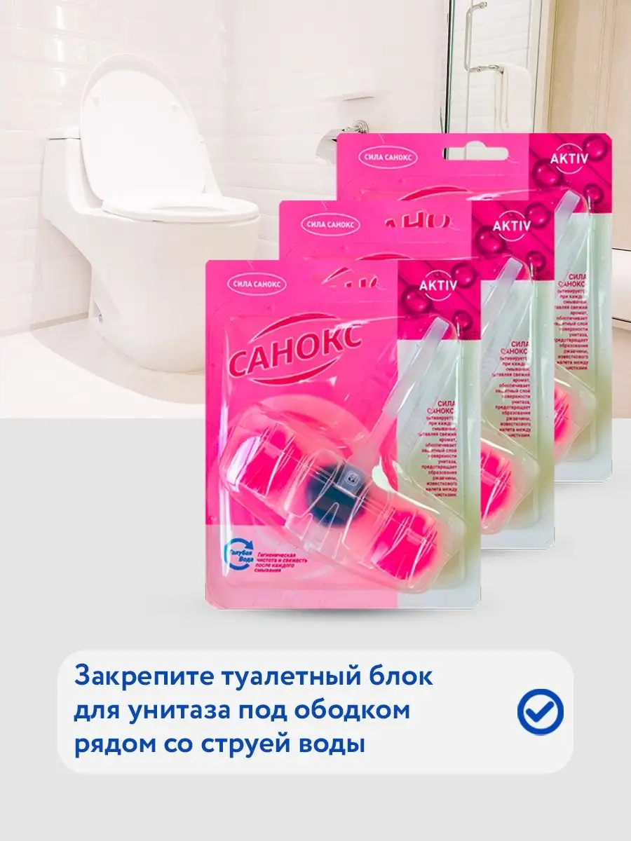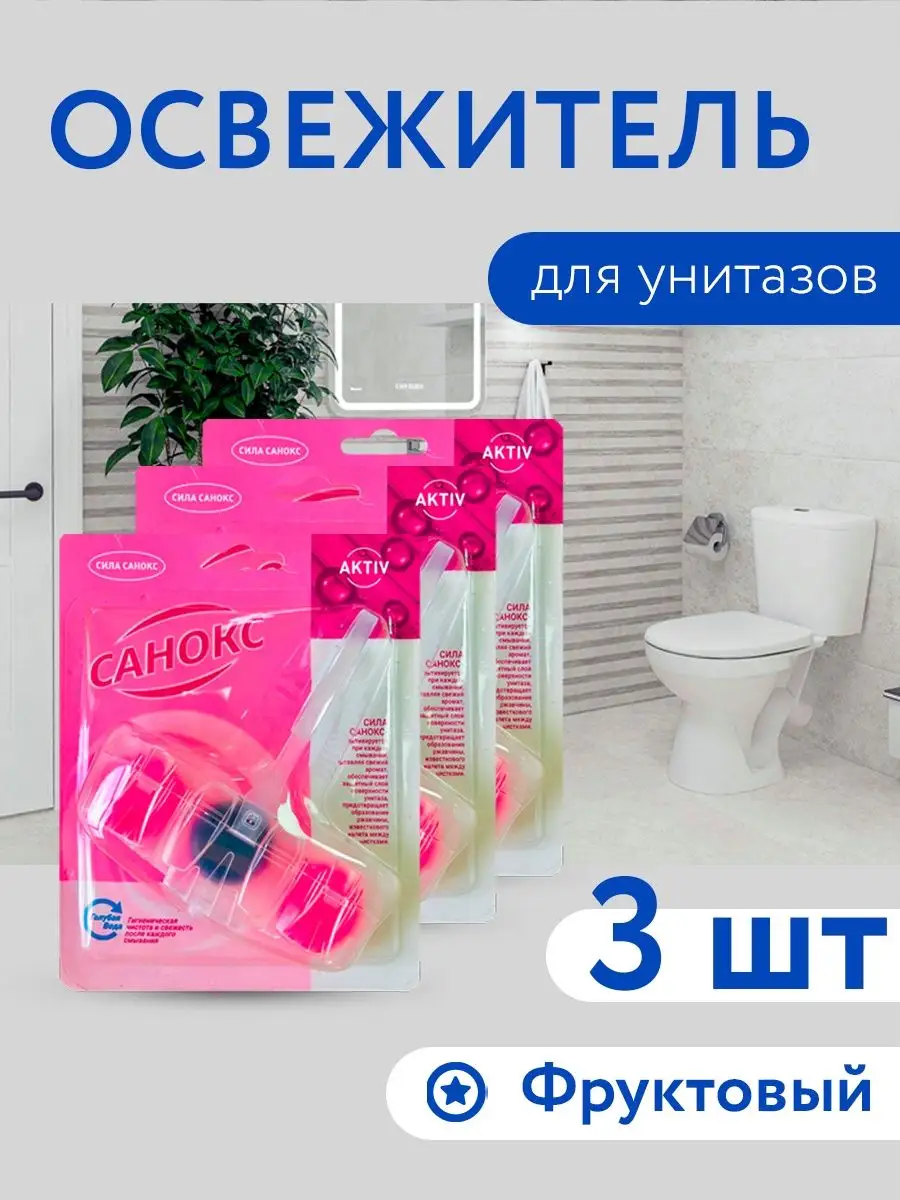 Описание: Средство для очистки унитаза Санокс Color Fresh таблетки в сменных блоках, набор 3шт. Обладает фруктовым ароматом. Современная формула шариков содержит поверхностно-активные вещества и неорганические соли, благодаря чему обеспечивает гигиеническую чистоту, защиту от бактерий. Эффективные растворяющиеся антибактериальные компоненты в составе шариков для унитаза защищают от известкового налета и от болезнетворных микроорганизмов. Использование блока убережет вашу сантехнику от известковых и солевых отложений, ржавчины и надолго продлит эксплуатацию. Блоки шариков содержат растворимый гель с освежающим ароматом. При каждом смывании воздух наполняется приятным ароматом, благодаря двойной силе шариков для унитаза, поэтому нет необходимости пользоваться дополнительными освежителями воздуха в туалете. Дезинфицирующее средство WC Санокс удобно и просто в использовании: снимите защитную пленку, повесьте блок под ободок унитаза в месте наибольшего потока воды; Блистеры для унитаза сэкономят Ваше время на уборку туалета. Блок для очистки унитаза эффективно удаляет любые загрязнения и поддерживает унитаз в чистоте длительное время, сохраняет белизну вашего унитаза. Бытовая химия от отечественного производителя АИСТ обеспечит свежесть и чистоту при каждом смывании!