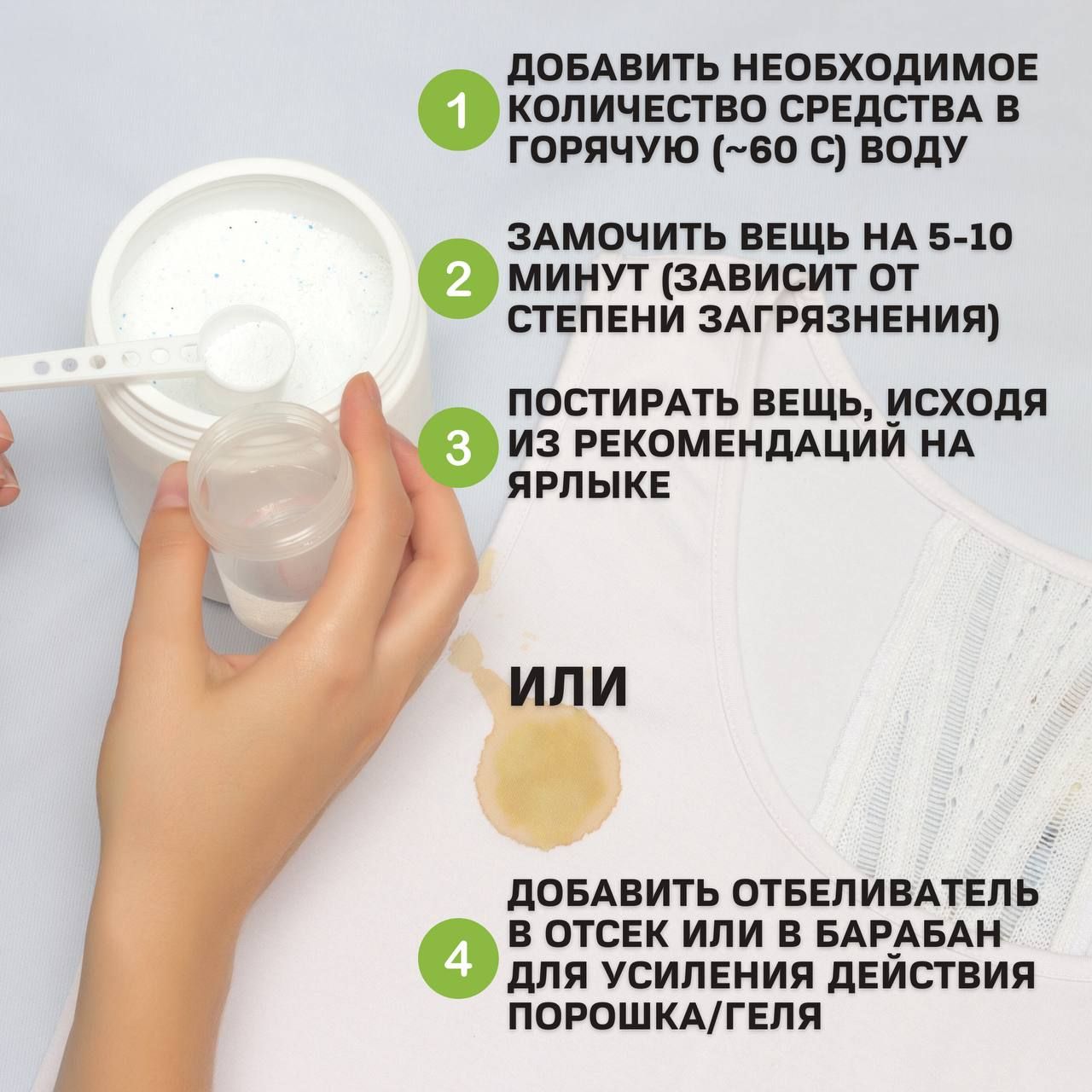 СПОСОБ ПРИМЕНЕНИЯ: универсальное средство добавляется к стиральному порошку для усиления его действия. Всегда следуйте инструкциям по стирке, указанным на ярлыке одежды. Применять в соответствии с назначением.
