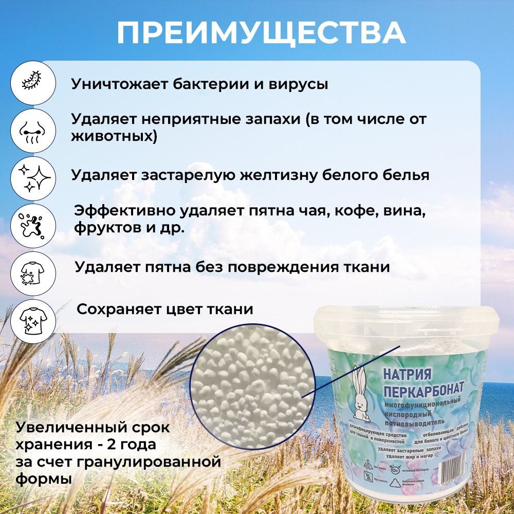 - Большой срок годности – 2 годаЭкологичный пятновыводитель в гранулахПеркарбонат натрия -  экологически чистый кислородсодержащий, отбеливатель и средство для дезинфекции. Именно наша продукция облегчает жизнь миллионам людей, потому что именно благодаря нашему экологически чистому отбеливателю белье в миллионах домашних хозяйствах становится белее, а пятна отстирываются проще. При этом окружающей среде не наносится какой­-либо вред, перкарбонат разлагается на безвредные кальцинированную соду, кислород и воду.