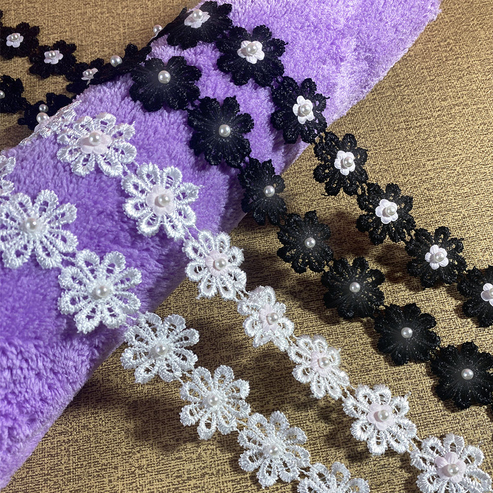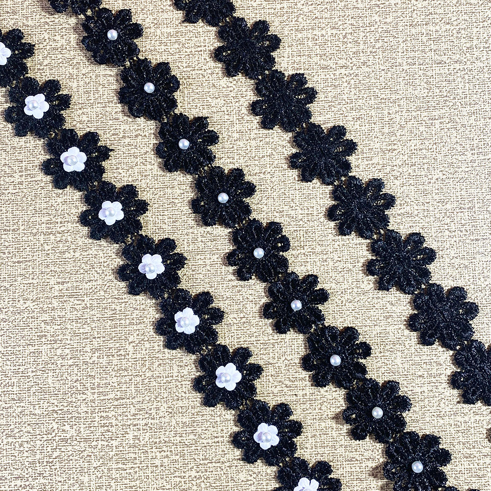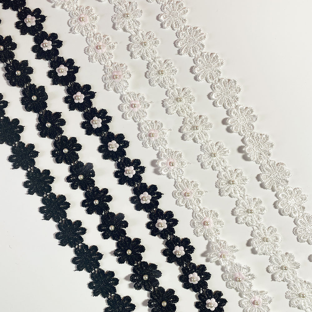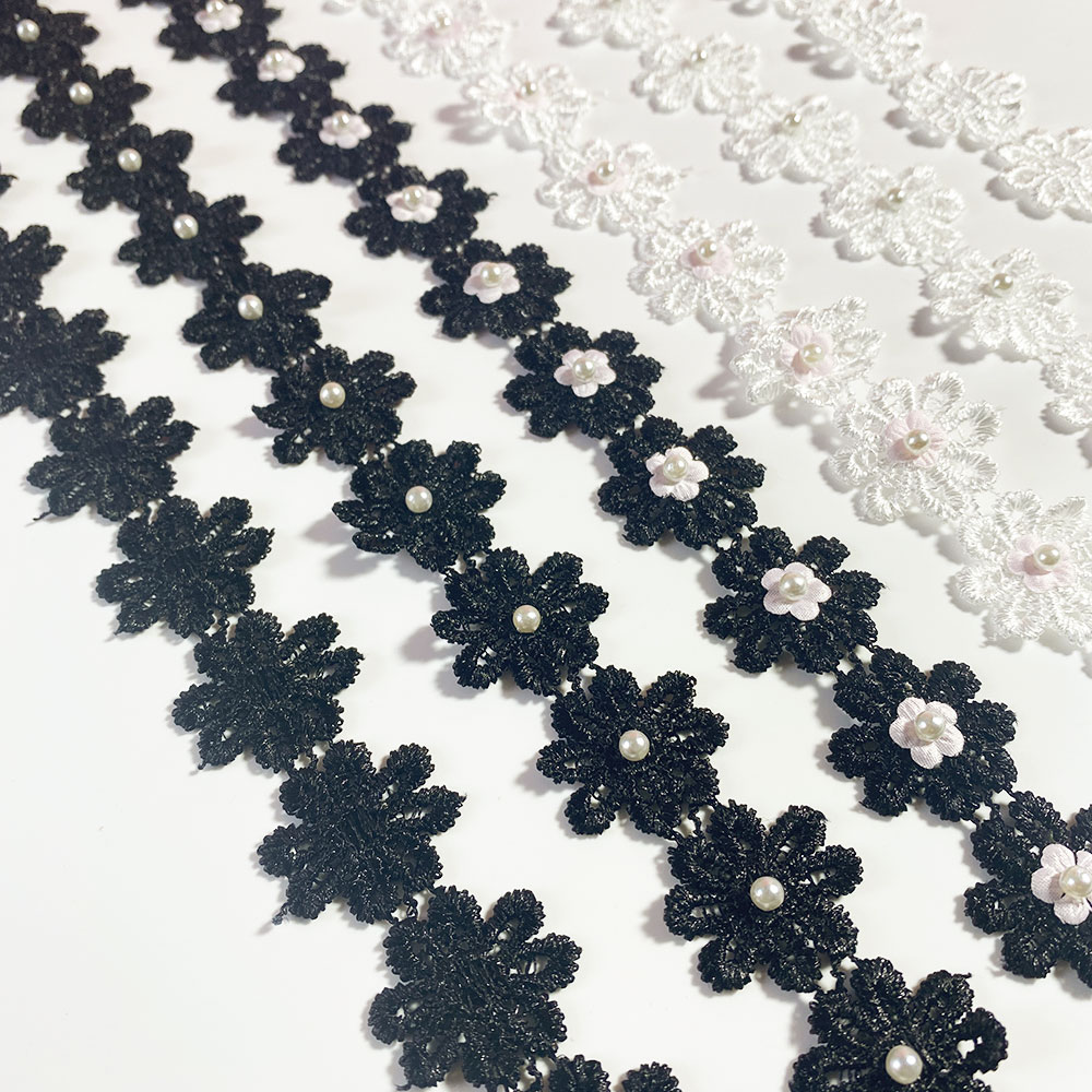 2.5CM Wide White Black 3d Flowers Embroidered Daisy Beaded Lace Trim Dress Collar Sewing Trimming Decor for Crafts Fabric Ribbon