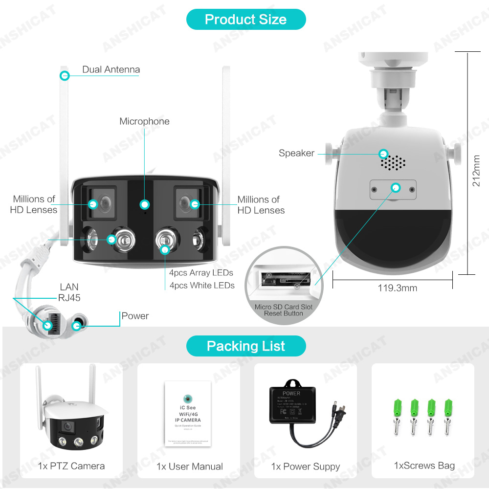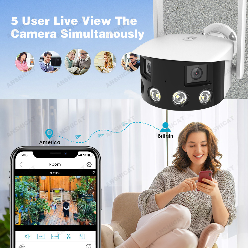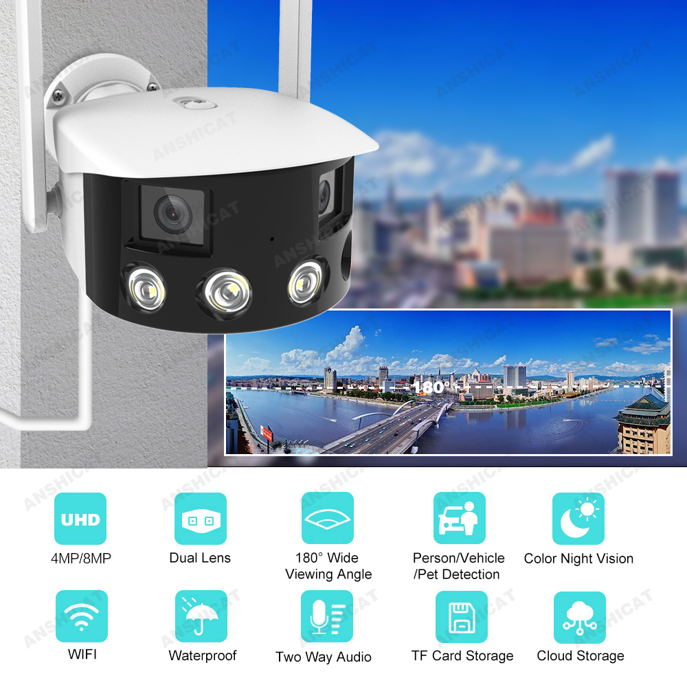 Открытый, IP-камера ANSHICAT, 4K, 8 Мп, 4 МП, 180 °,Двойной объектив, широкий угол обзора WiFi, Ночной полноцветный, Беспроводной , Водонепроницаемый , Обнаружение человека , HD, Аудио,камеры видеонаблюдения