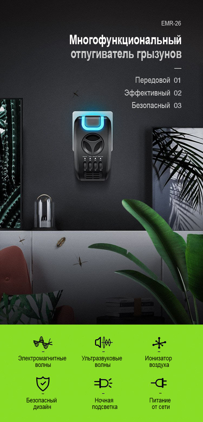 Отпугиватель грызунов EMR-26 (Электромагнитный и ультразвуковой, бесшумный)