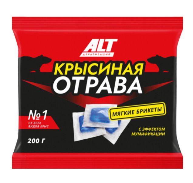 Отрава №1 для мышей и крыс "КРЫСИНАЯ ОТРАВА" ALT, мумифицирующий эффект, яд-приманка в брикетах 200г.