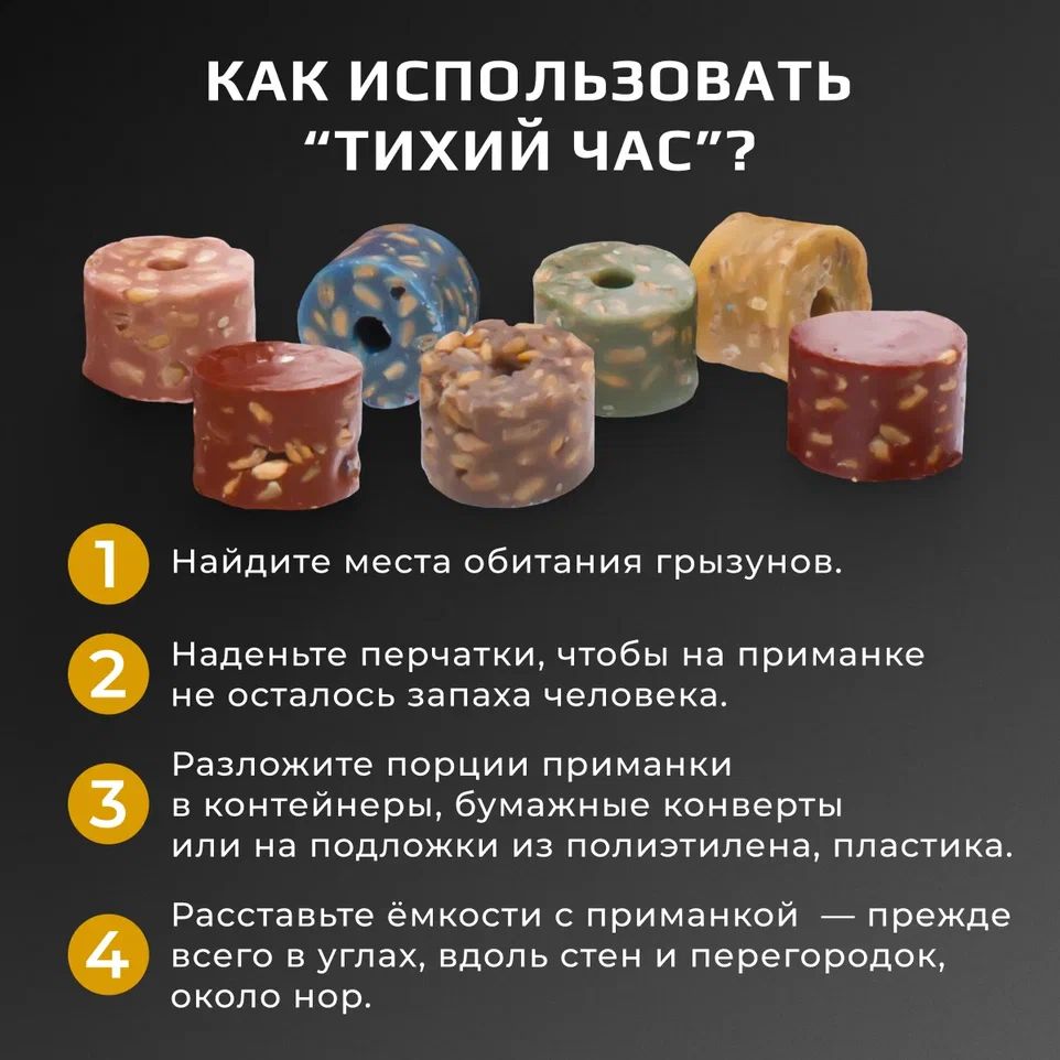 • 7 разных вкусов: ароматизаторы привлекут грызунов в любой сезон года в любых местах обитания, так как подобраны с учетом суточной потребности грызунов в белках, жирах и углеводах