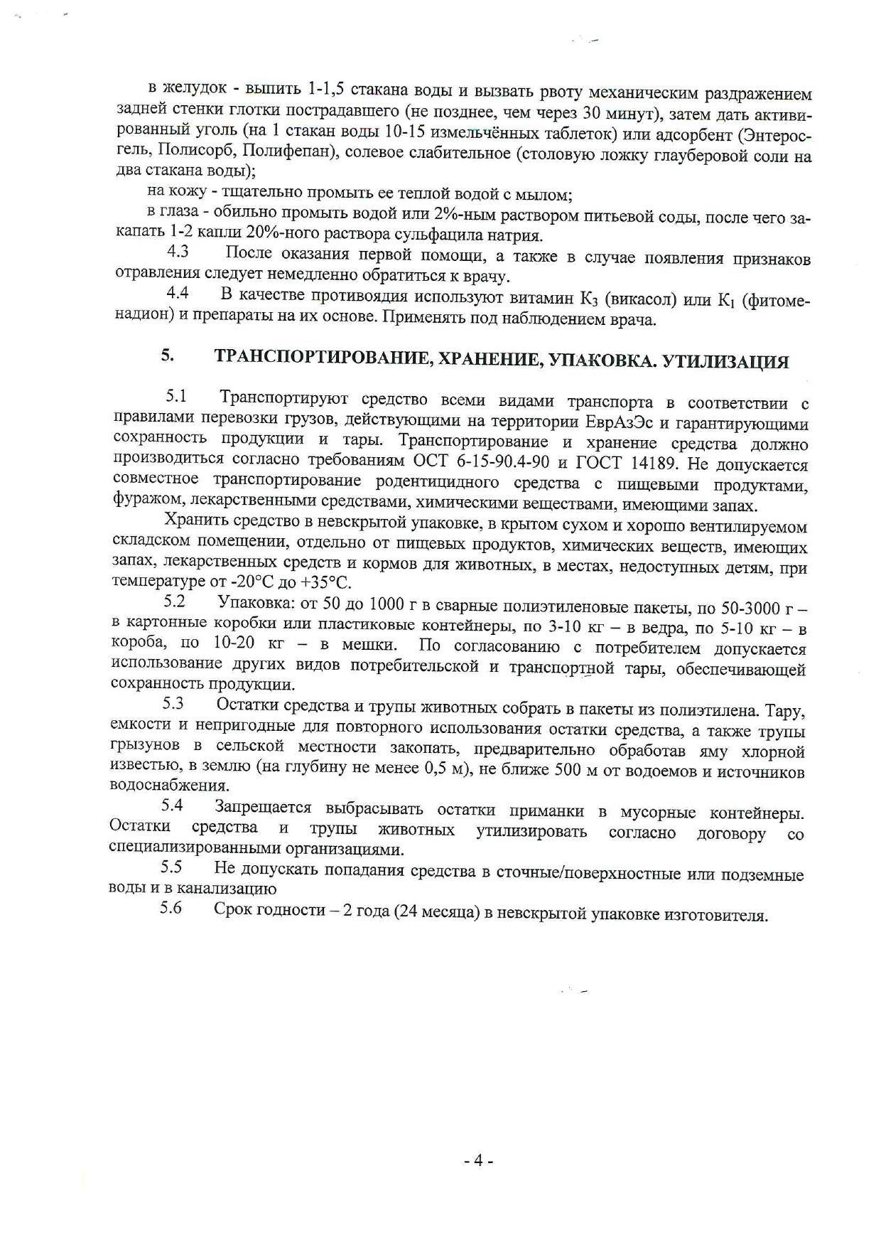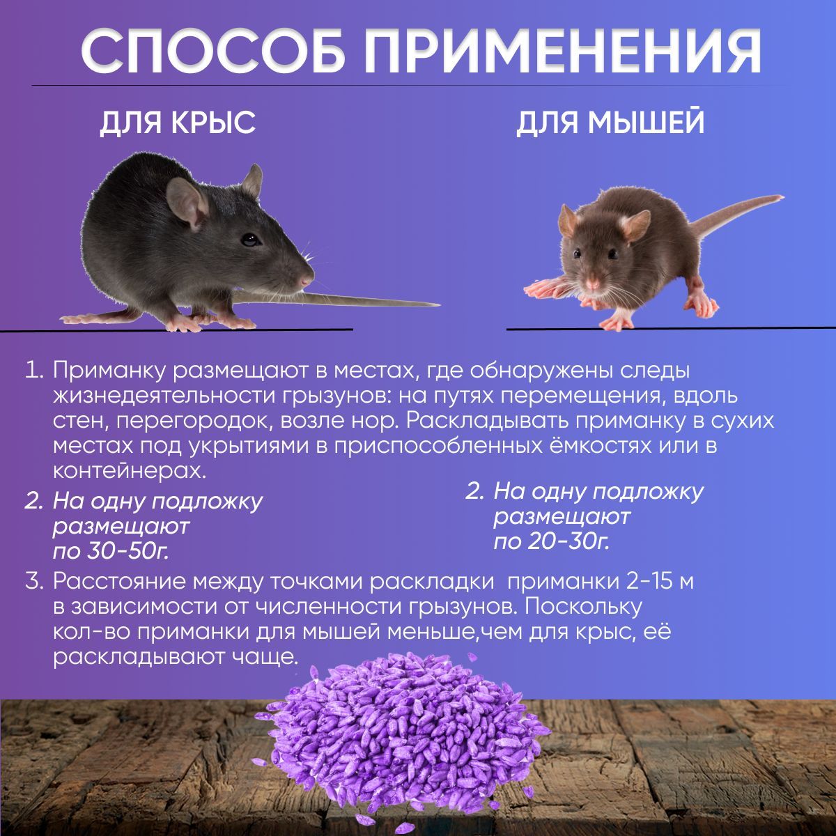 В одной порции приманки размещают 30 зёрен в случае уничтожения мышей, и до 100 – для крыс. Полная гибель животного наступает в течение 3-12 дней даже после одноразового поедания приманки. Отраву можно использовать на влажных и пыльных территориях. Высокая поедаемость мора для борьбы с грызунами гарантирована присутствием специфических аттрактантов. В результате быстрого действия, такая защита вашего хозяйства от мышек и крысенышей действует более надёжно и долговременно, чем простой капкан с липучкой, мышеловка с клеем, клеевая ловушка или ультразвуковой отпугиватель. Большая просьба, к владельцам домашних животных, собак и кошек держать подальше от смертельной
