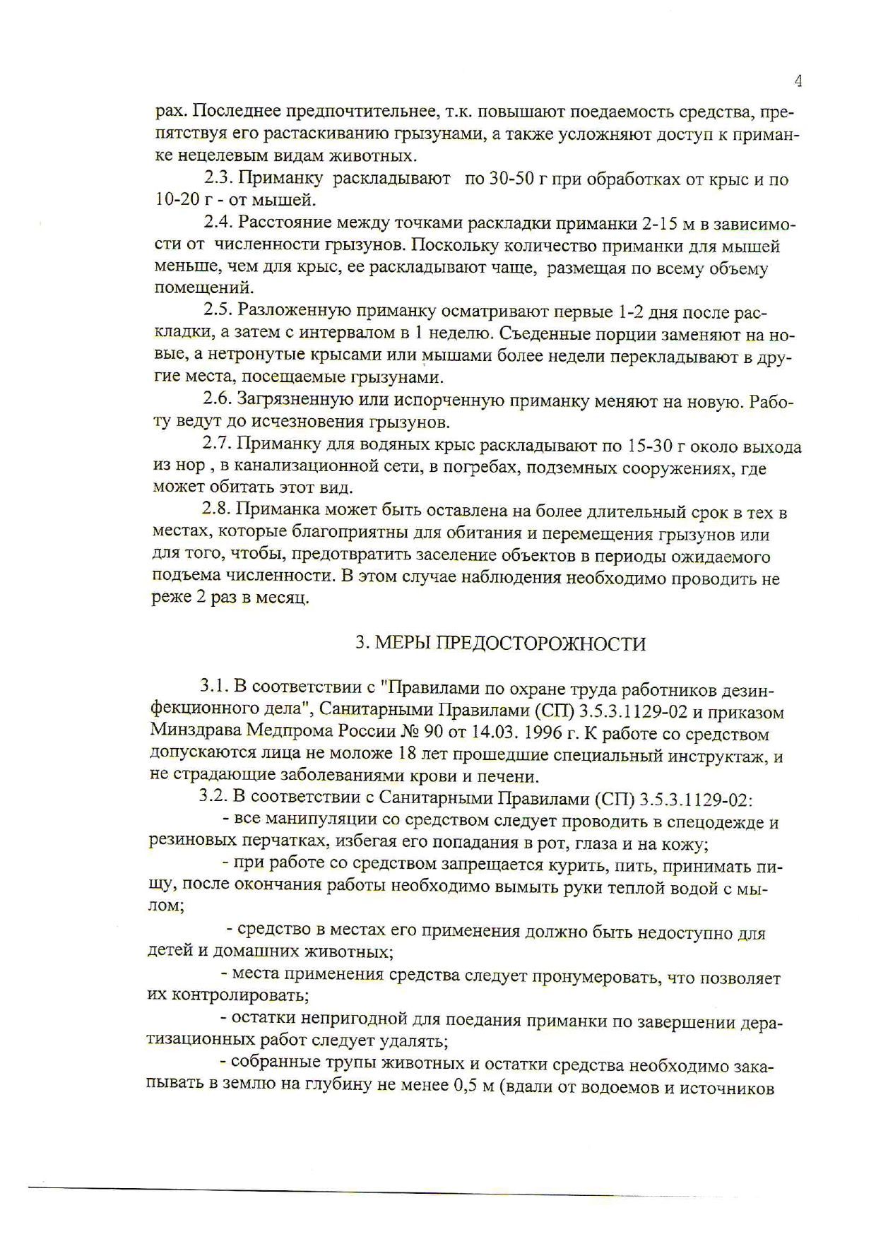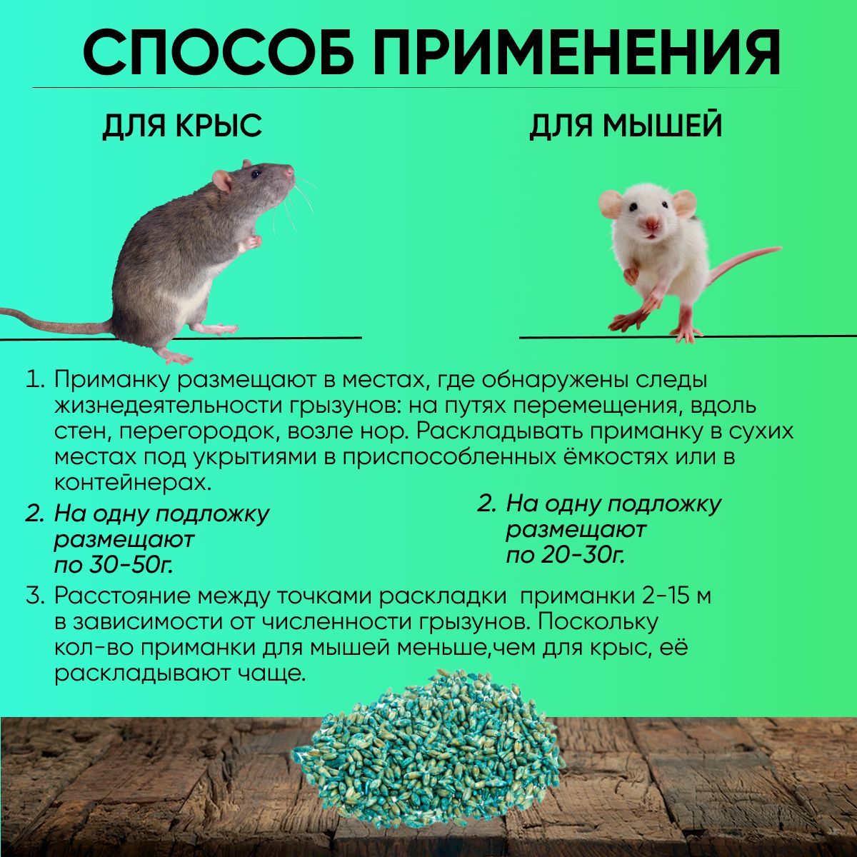 В одной порции приманки размещают 30 грамм в случае уничтожения мышей, и до 100 – для крыс. Полная гибель животного наступает в течение 3-12 дней даже после одноразового поедания приманки. Отраву можно использовать на влажных и пыльных территориях. Высокая поедаемость мора для борьбы с грызунами гарантирована присутствием специфических аттрактантов. В результате быстрого действия, такая защита вашего хозяйства от мышек и крысенышей действует более надёжно и долговременно, чем простой капкан с липучкой, мышеловка с клеем, клеевая ловушка или ультразвуковой отпугиватель. Большая просьба, к владельцам домашних животных, собак и кошек держать подальше от смертельной