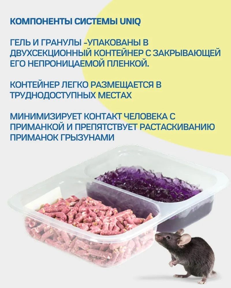 Описание: Текст при отключенной в браузере загрузке изображенийОтрава для крыс UNIQ Уник 250 гUNIQ - Революционная не имеющая аналогов система средств для быстрого и незаметного устранения грызунов. Учитывает пищевые предпочтения мышей и крыс и психологию поведения вредителей ,поэтому высокоэффективен против всех видов грызунов. Однократное поедание приманки системы UNIQ гарантирует гибель грызуна начиная с 3 дня после начала использования системы. Более ранняя гибель вызовет настороженность других грызунов и отказ от поедания приманок! Компоненты системы UNIQ -гель и гранулы -упакованы в специальный двухсекционный контейнер с закрывающей его ароманепроницаемой пленкой. Контейнер удобен в применении, легко размещается в труднодоступных местах ,минимизирует контакт человека с приманкой и препятствует растаскиванию приманок грызунами ,что значительно повышает безопасность использования системы UNIQ. В своем составе содержит Битрекс, что позволяет быть уверенным в безопасности не целевых видов животных и детей! Приманка привлекательна для грызунов даже при наличии обильной кормовой базы; в качестве аттрактантов содержит натуральные специально подобранные пищевые компоненты. Активное вещество - бромадиолон.