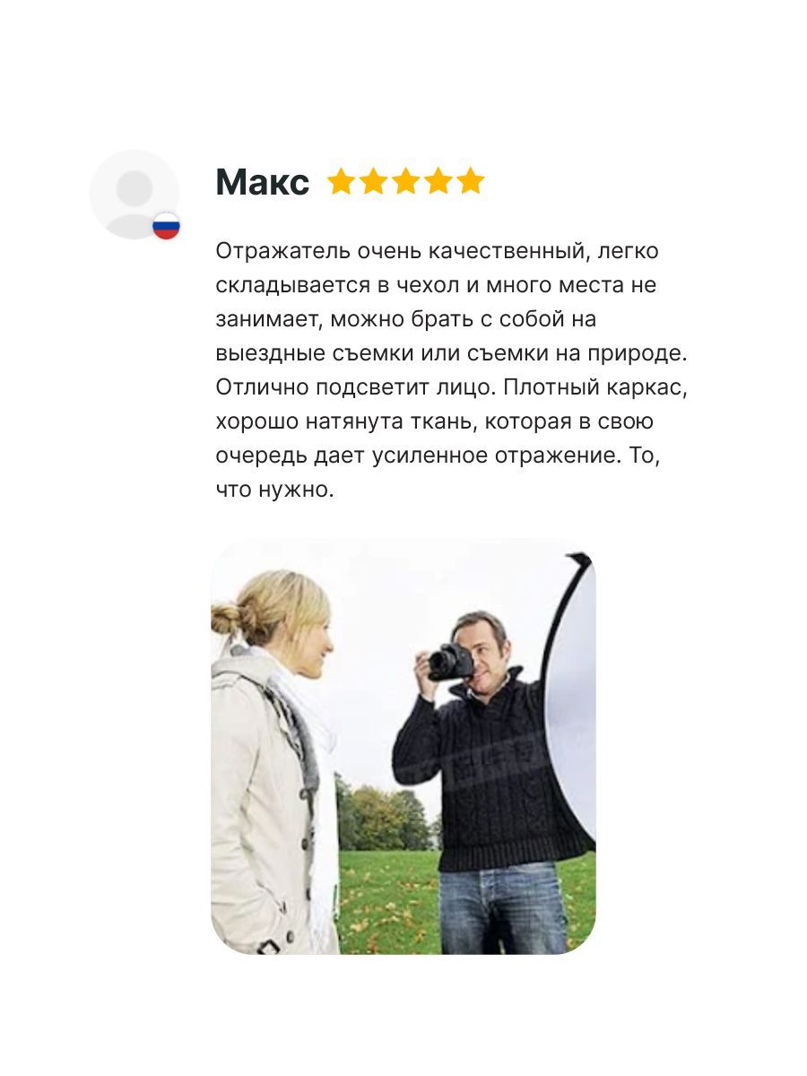 Черная сторона отражателя используется для исключения объекта из зоны освещенности. Также позволяет добавить теней на снимаемый объект при чрезмерно равномерном освещении сцены. Отражатели Raylab легки и удобны в сборке, и устойчивы к износу. Наш светоотражатель для фото имеет прочный и легкий каркас, который покрыт двусторонней тканью. Это позволяет использовать его как в помещении (например, фуд съемка), так и на открытом воздухе. Он имеет различные цветовые стороны, включая белый, отражатель серебристый, отражатель золото и черный, которые позволяют настроить свет в зависимости от ваших потребностей. Это значит, что вы можете выбрать цвет, который наилучшим образом подходит для фотосессии.
