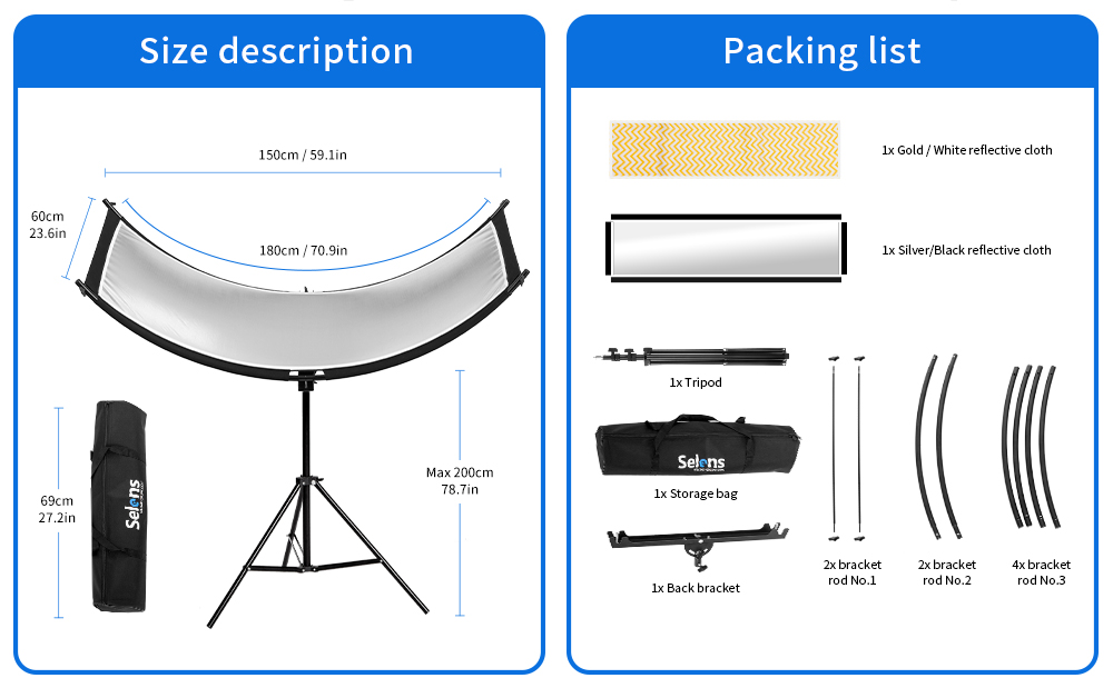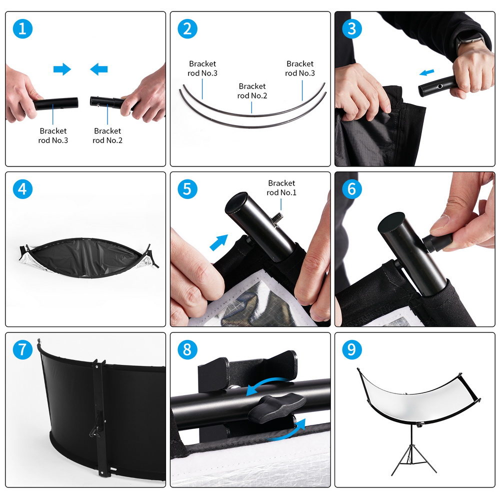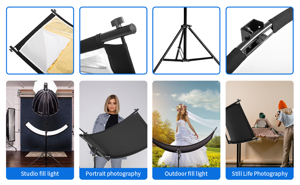 Обладая прочной алюминиевой рамой и отражающей серебряной поверхностью, натяжные стержни используются для натягивания его, максимизируя светоотдачу. Он обеспечивает отражение и привлекательный броский свет для профессиональной портретной съемки. Теперь Портретные Фотографы могут добиться освещения Раскладушки с помощью одного источника света.