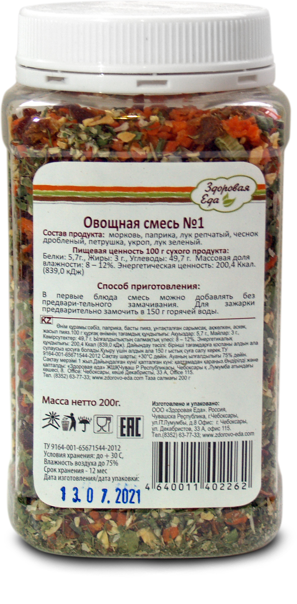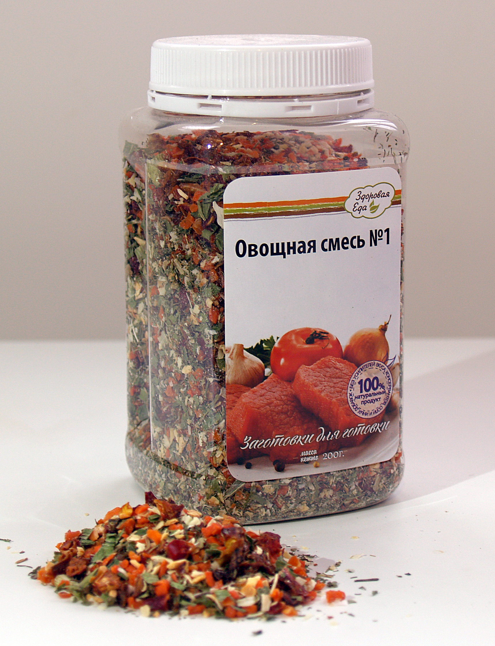 Овощная смесь №1 – это ассорти, в состав которого входят: чеснок сушеный, морковь сушеная, лук сушеный репчатый, паприка, укроп, петрушка, зеленый лук. Мы заботимся о вашем здоровье, поэтому не используем соль, сахар, глютен, усилители вкуса, глутамат натрия и консерванты.