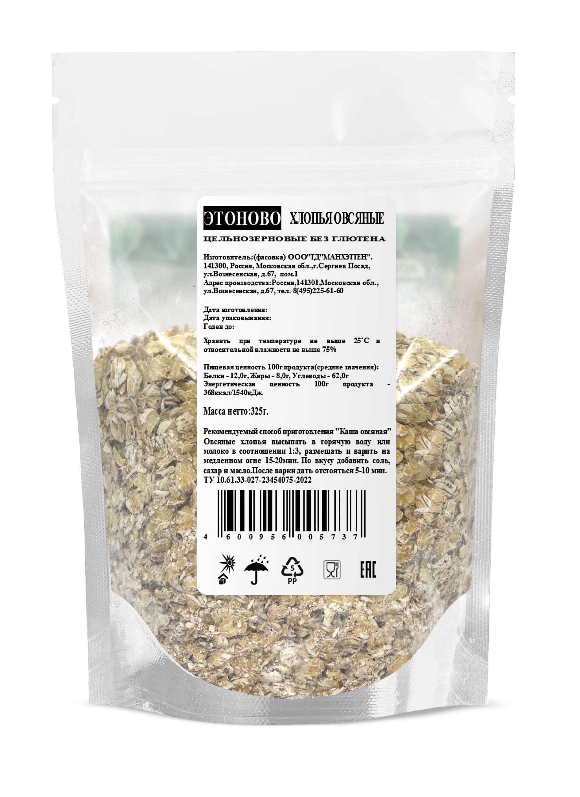 Описание: Овсяные хлопья для завтрака без глютена без сахара цельнозерновые, каша долгой варки 325г. Это уникальный полезный продукт, который можно приготовить на утро детям и себе, для добавления во вторые блюда, в выпечку, делать муку, а также для таких напитков, как кисель, смузи и коктейль. Овсянка органическая-это источник витаминов и минералов. Уникальность крупы заключается в безглютеновом составе, цельности зерна, лучше выводит токсины и очищает желудок. Переваривается долго, что обеспечивает больше сил и энергии. Это позволяет дольше не испытывать голод. Для тех кто на диете, хлопья фитнес для похудения, ПП, ЗОЖ, придерживается правильного питания. Также снижает уровень холестерина и позитивно сказывается не только на сердечно-сосудистую систему, но и на весь организм в целом. Геркулес нежный от ЭТОНОВО – это прекрасный 100% натуральный, задуманный природой: без консервантов, без красителей и добавок. Удобство использования, практичная упаковка типа дой-пак с зип-замком. Прозрачная пленка дает возможность контролировать наполнение. И вовремя сделать заказ. На обороте имеется рекомендованный рецепт. Время готовки занимает около 20 минут. Необходимо высыпать в горячую воду или молоко в соотношении 1 к 3, размешать и варить на медленном огне 15-20 минут. По желанию можно сдобрить солью, сахарозаменителем с Монк фруктом, маслом. Для настроения и хорошего аппетита добавить сухофрукты и ягоды. Вкусная еда для пользы рациона, которая благоприятно влияет на общее состояние здоровья, теперь доступна каждому. Позвольте себе легкость!