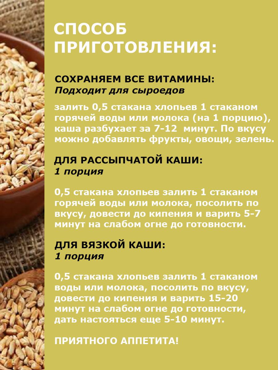 Для приготовления рассыпчатой каши (1 порция): 0,5 стакана хлопьев залить 1 стаканом горячей воды или молока, посолить по вкусу, довести до кипения и варить 5-7 минут на слабом огне до готовности.