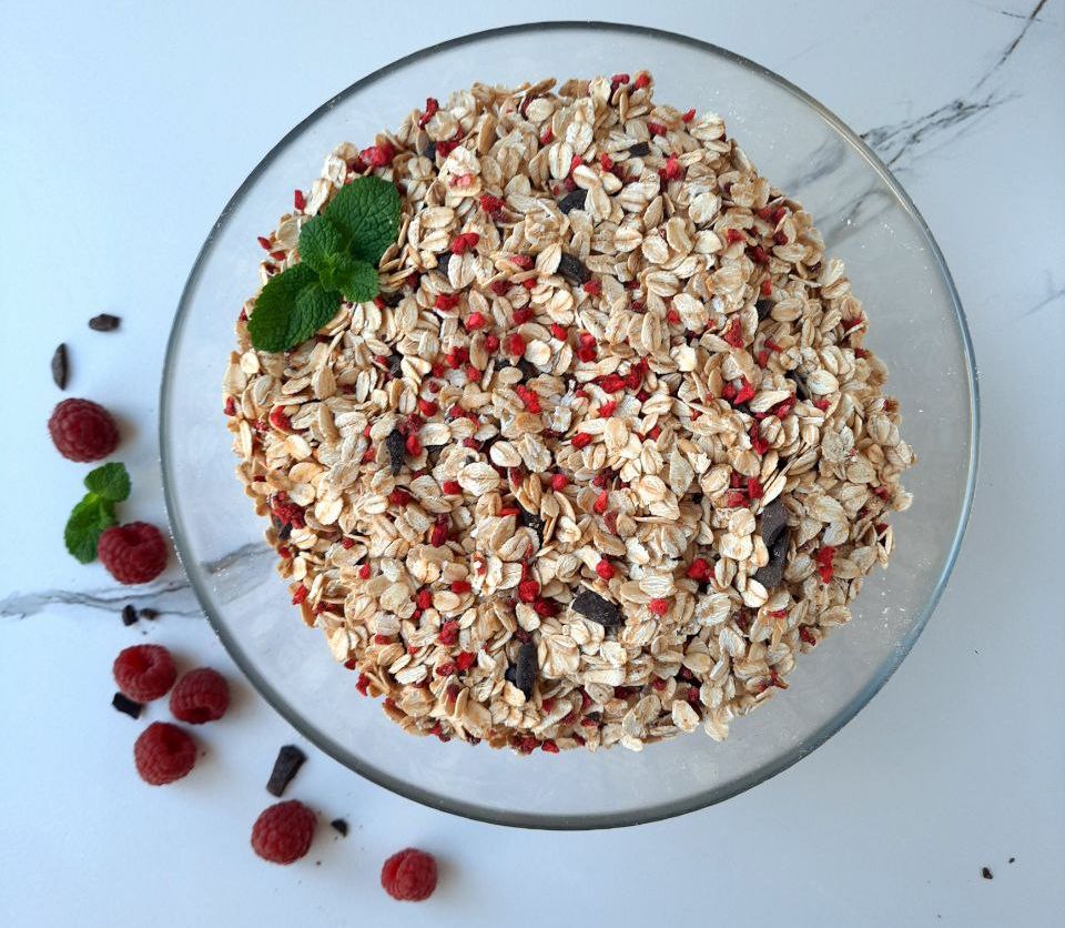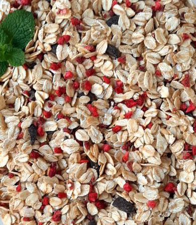 Овсяные хлопья, крои-порошок мята, какао тёртое, малина сублимированная кусочки, пребиотик(инулин).