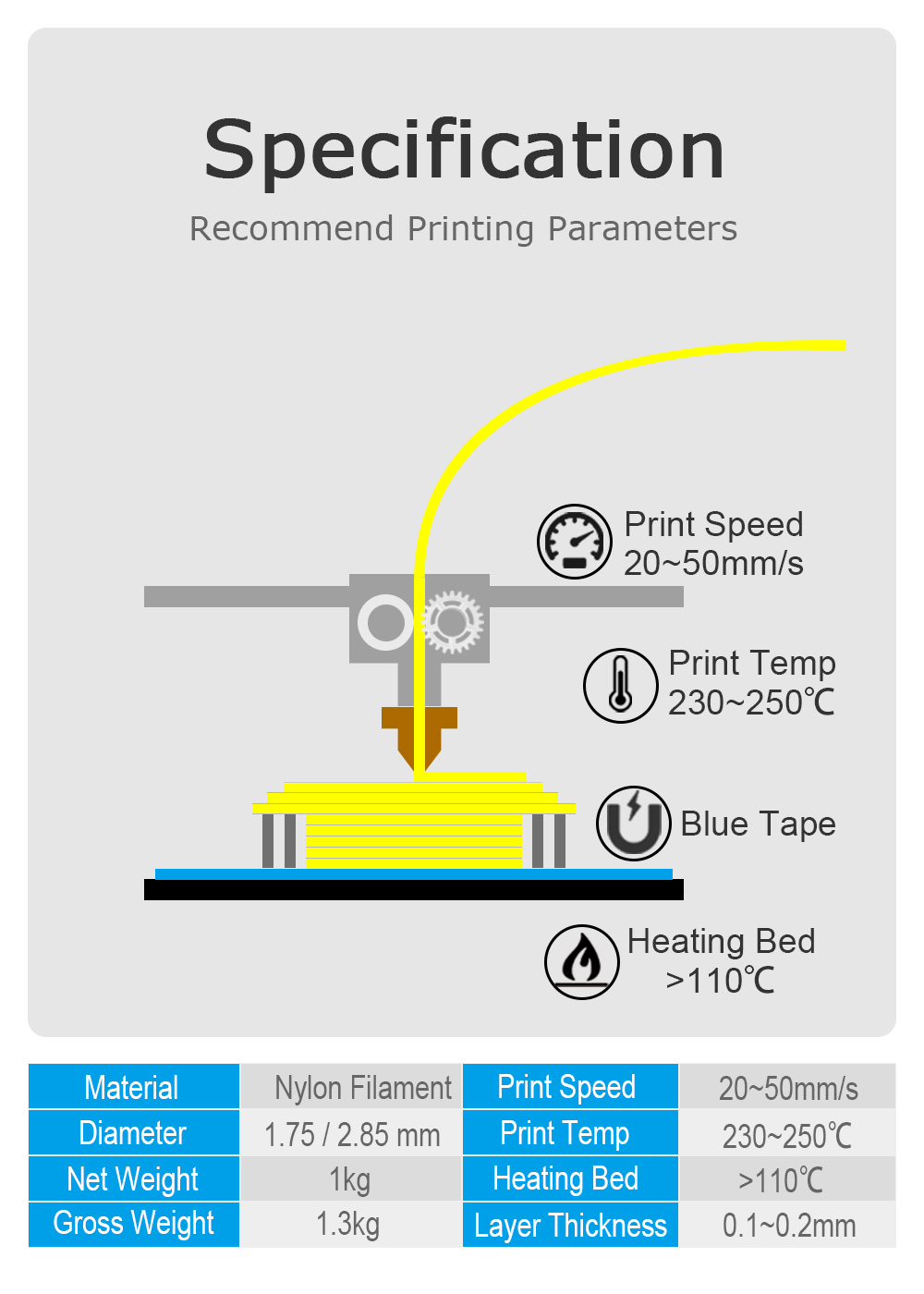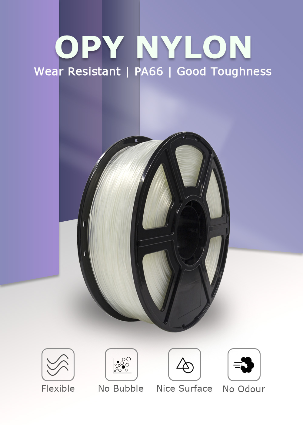 Нейлон обладает большими механическими свойствами и, в частности, лучшей ударопрочностью для негибкой нити. Однако адгезия слоя и впитывает влагу может быть проблемой.