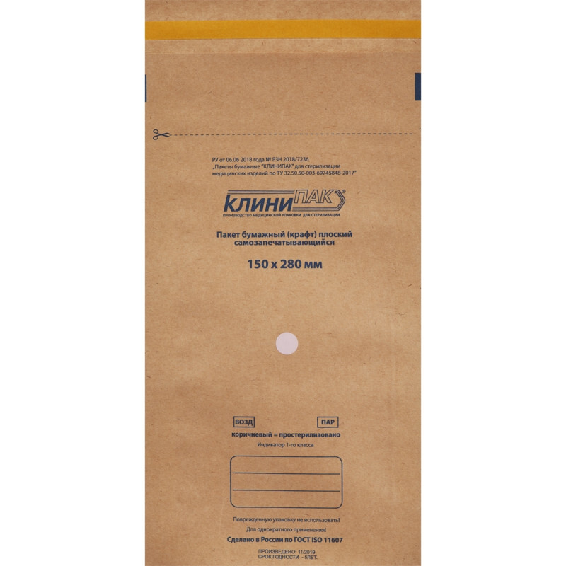 Описание: Пакет д/стерил.бум. 150 х 280 мм крафт самокл. 100 шт/уп Клинипак Пакеты для стерилизации 'Клинипак' изготовлены из специальной влагопрочной крафт-бумаги, плотностью 70 г/м. кв., имеют термоклеевые боковые швы. На выступающий клапан пакета нанесена полоска клеевого слоя, защищенная антиадгезивной бумажной полоской желтого цвета, предотвращающей высыхание клея. Пакеты 'Клинипак' предназначены для стерилизации воздушным методом (при температурах стерилизации 160 °С - 180 °С) и паровым (при температурах стерилизации 121 °С- 134 °С) методом в стерилизаторах, разрешенных к применению в Российской Федерации в установленном порядке. Пакеты предназначены для однократного применения. Срок хранения изделий медицинского назначения, простерилизованных в пакетах 'Клинипак', составляет 50 дней. На лицевой стороне пакета нанесены следующие обозначения: Торговая марка, размер пакета в мм, запрещение использовать упаковку в случае повреждений, информация об однократном применении пакета, индикатор воздушной и паровой стерилизации в виде стикера белого цвета. Индикатор является химическим индикатором 1 класса (ГОСТ Р ISO 11140-1-2000) и предназначен для 2-х видов стерилизации - паровой и воздушной. Исходный цвет индикатора - светло-серый. При стерилизации воздухом индикатор меняет свой цвет на светло-коричневый, при стерилизации паром - на темно-розовый. Пунктирной линией обозначается линия отреза при вскрытия пакета после стерилизации. Пакеты 'Клинипак' соответствуют требованиям технических условий производителя (ТУ 9398-019-52582566-2009) и требованиям ГОСТ Р ISO 11607-2003. Срок годности упаковок с момента их изготовления составляет 3 года при условии хранения упаковок при температуре от плюс 10 °С до плюс 30 °С и относительной влажности 30-50%. Размер изделия: 150x280 мм. Количество в упаковке: 100 шт.