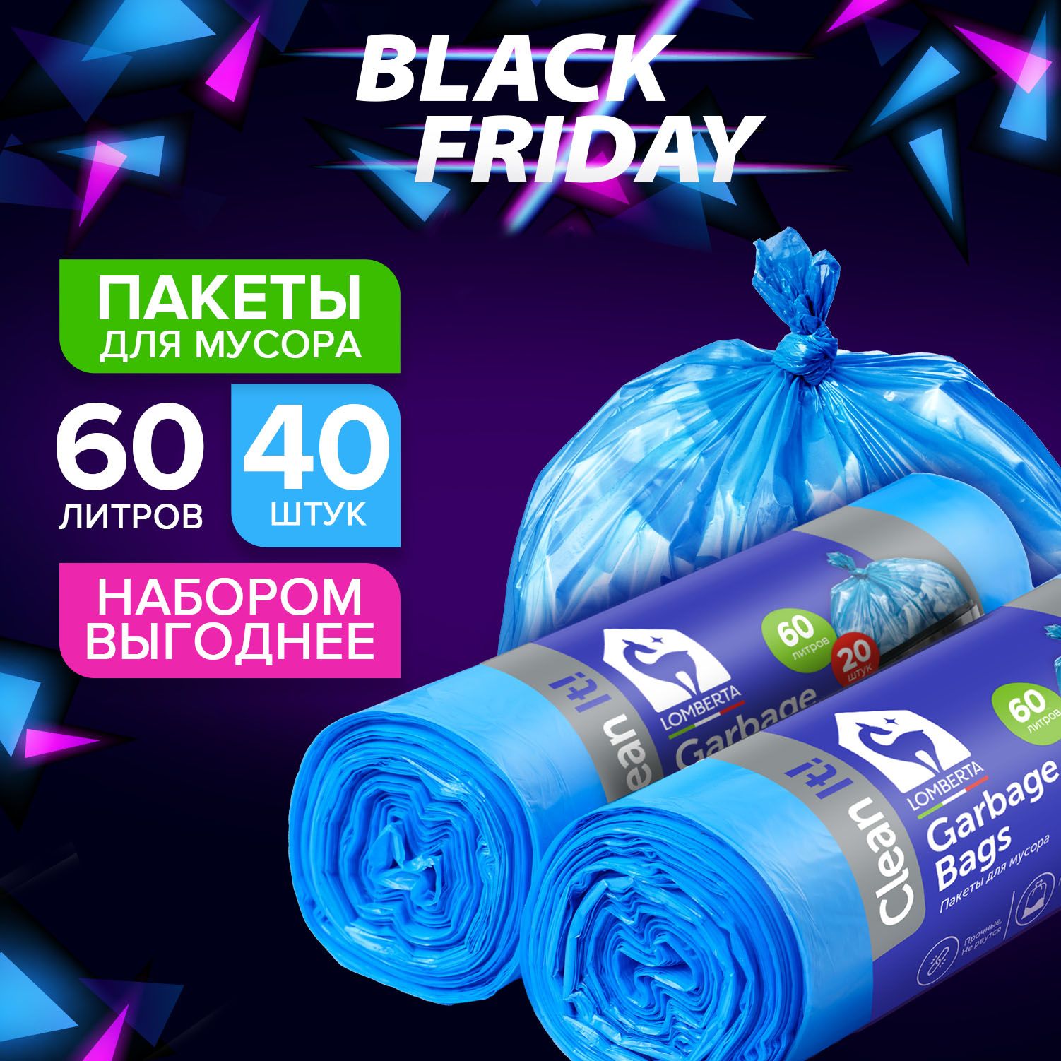 Пакеты для мусора Lomberta 60л, мешки для мусора 20 шт, 2 упаковки