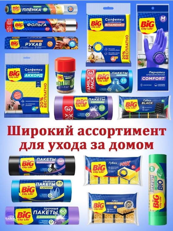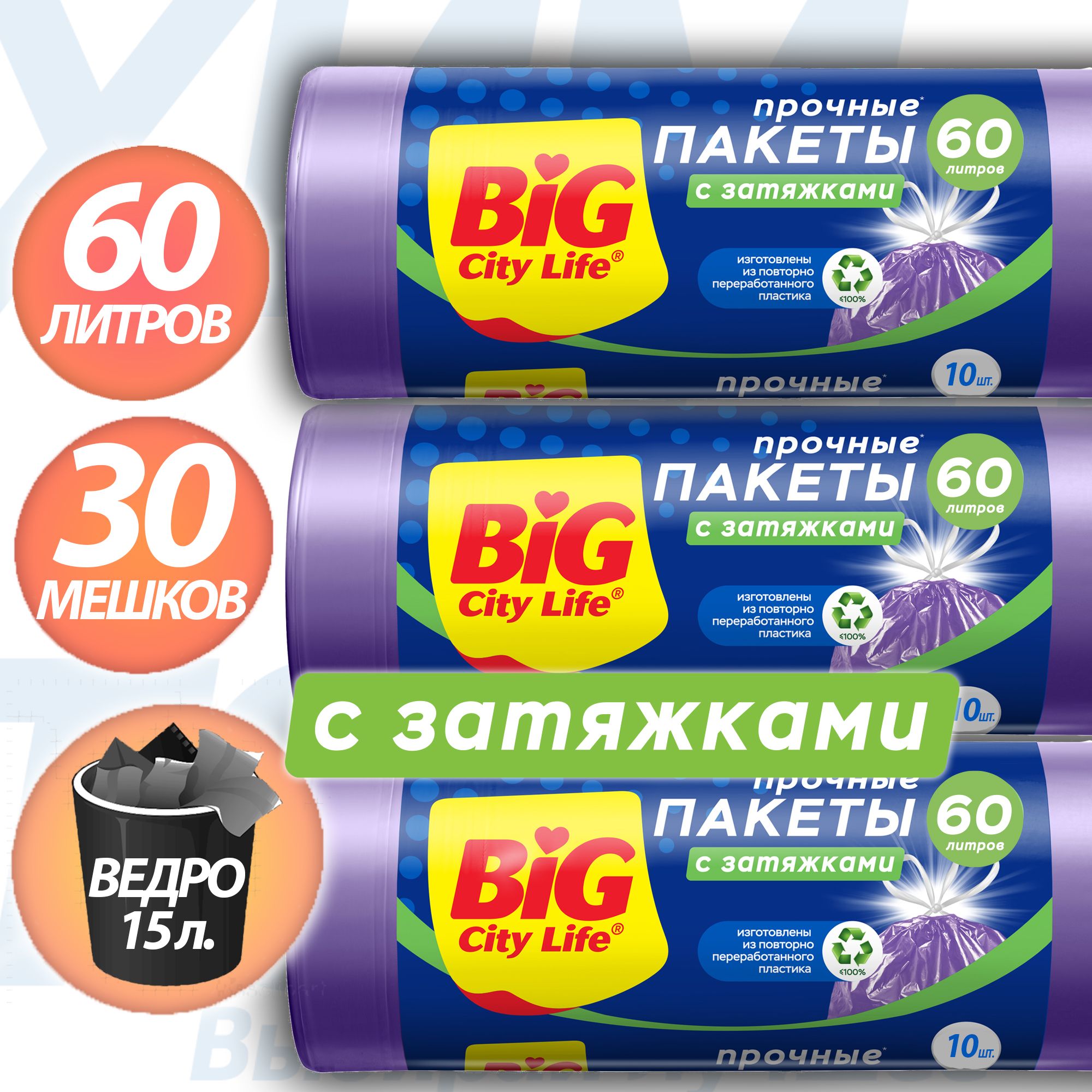 Комплект содержит в себе: Пакеты для мусора BIG City, с завязками, 60 л, 10 шт-3 шт. *В упаковке допускается дополнительное вложение