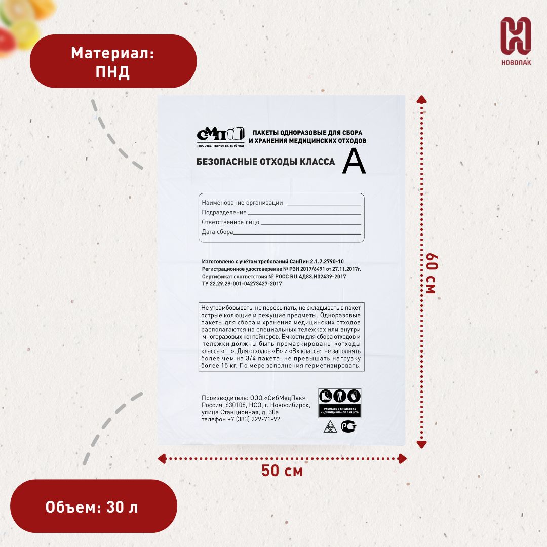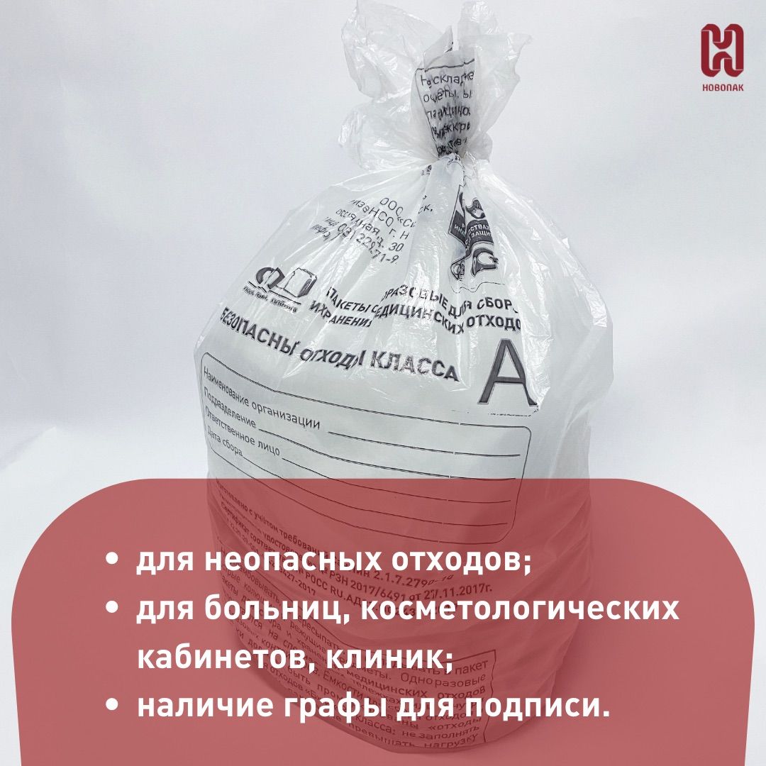 Описание: Пакеты (мешки) для утилизации медицинских отходов класса А - специальные одноразовые мешки для сбора, хранения и транспортировки использованных косметологических, медицинских отходов.