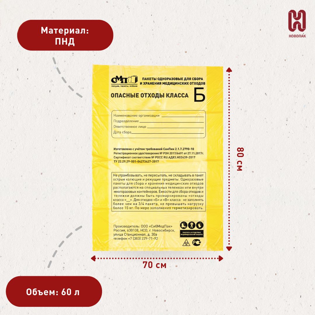 Пакеты для сбора и хранения медицинских отходов класса Б, 700х800 мм, 60 л, жёлтый, 50 шт.