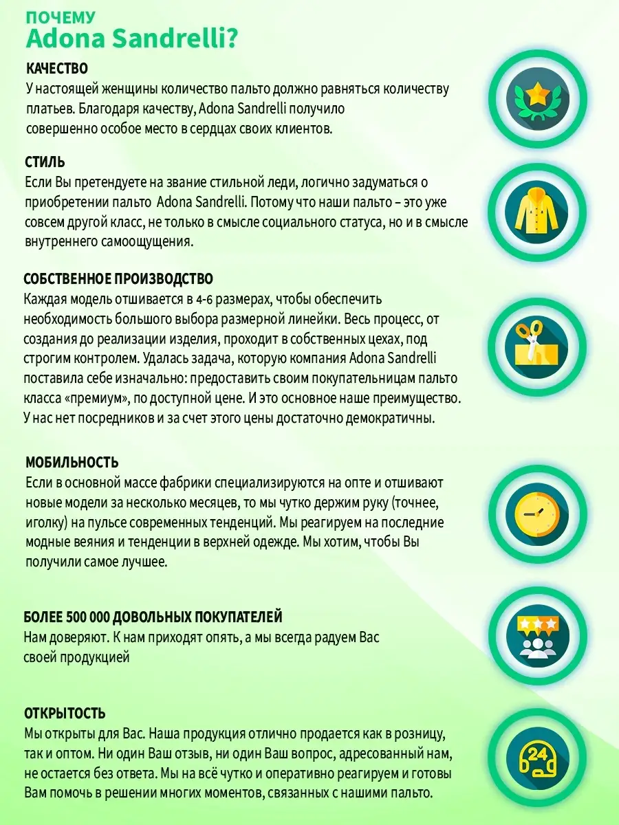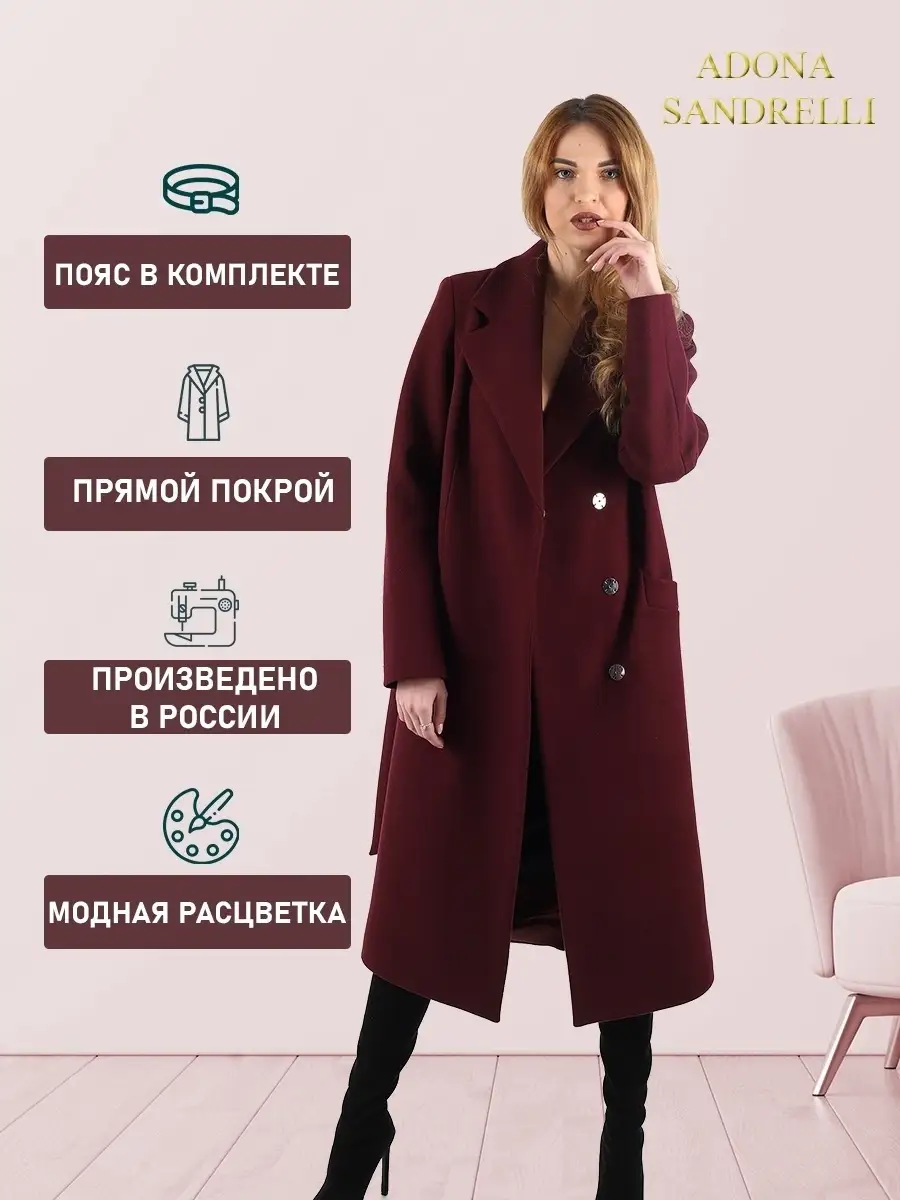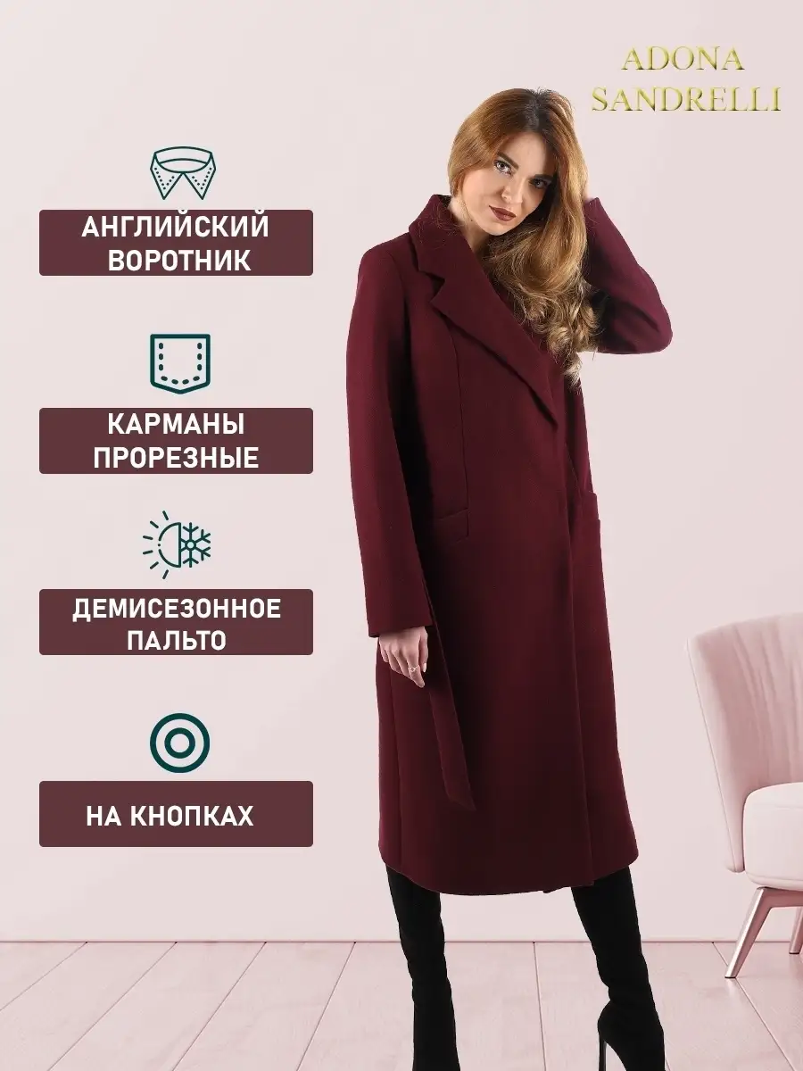 Описание: Универсальное и функциональное пальто-халат станет неотъемлемой вещью в осенне-весенний период. Длина пальто по спинке, для всех размеров 112 см. (+ - 3%). Температурный режим от +10 до -5 градусов. Особенностью модели является дышащий материал. Выполнено из драпа. Застежка на кнопки. Прямой лаконичный силуэт с прорезными карманами и отложным воротником. Шлица для удобства ходьбы. Рост девушки модели 174 см. Дорогие наши покупательницы! Мы, производитель пальто Adona Sandrelli, не торгуем со своего склада. Все наши пальто хранятся на складах WB и уже оттуда отправляются к Вам, на основании заявок от Вас. Мы не задерживаем отправку к Вам наших пальто, так как не можем на это повлиять. При отправке товара мы не путаем наши пальто с чужими товарами, так как у нас нет других товаров, кроме наших пальто. Мы не делаем пересортицу по моделям, размерам и расцветкам пальто, так как мы не формируем отправки к Вам. Мы не производим переупаковку наших пальто на складах WB в комок, замотанный скотчем, так у нас нет доступа к складам WB. Мы не удерживаем с Вас стоимость возвратов, точно так же, как и не выдаём Вам чек о покупке нашего пальто, так как это не мы продали Вам пальто Adona Sandrelli. Мы не теряем наши пояса, потому что перед отправкой в WB наша продукция проходит ОТК. Мы не пачкаем наши пальто перед отправкой. Мы не отрываем пуговицы «с мясом» от наших пальто. Мы не эксплуатируем наши пальто перед отправкой в WB. Надеемся, в случае возникновения проблем, Вы оформите пальто как брак, для изъятия из оборота, или как минимум, напишите обращение в техподдержку WB, иначе оно отправиться к другому покупателю. Для нас важно, чтобы каждая наша покупательница осталась довольна покупкой и собой. Со склада производителя Adona Sandrelli, пальто отправляются в полной комплектации и в идеальном виде - отпаренные и упакованные в запаянные полиэтиленовые чехлы, с индивидуальной вешалкой, в состоянии «получила, надела, ушла с улыбкой».