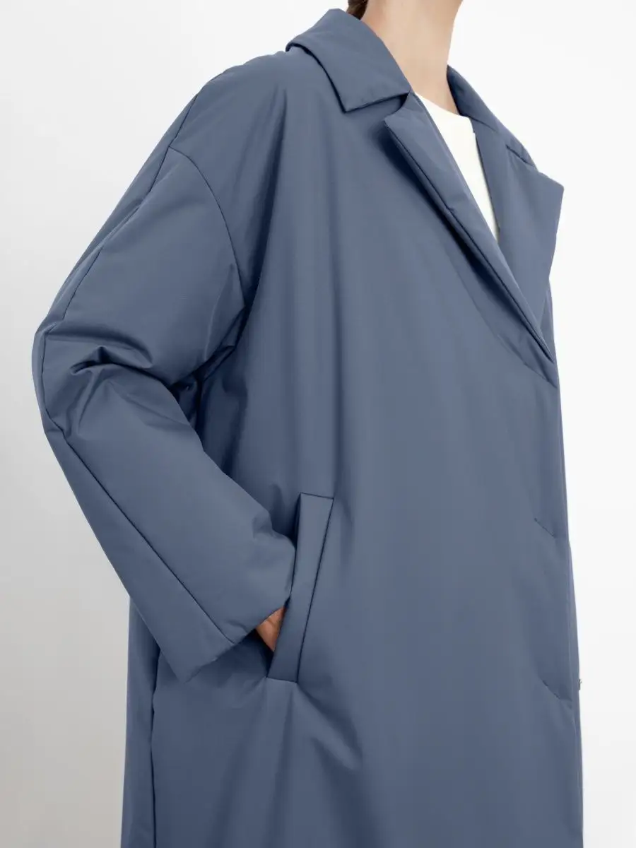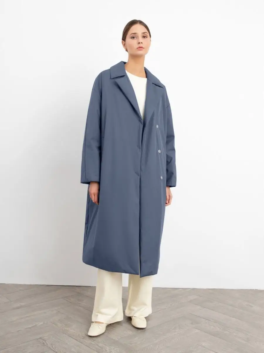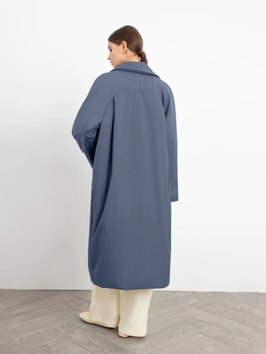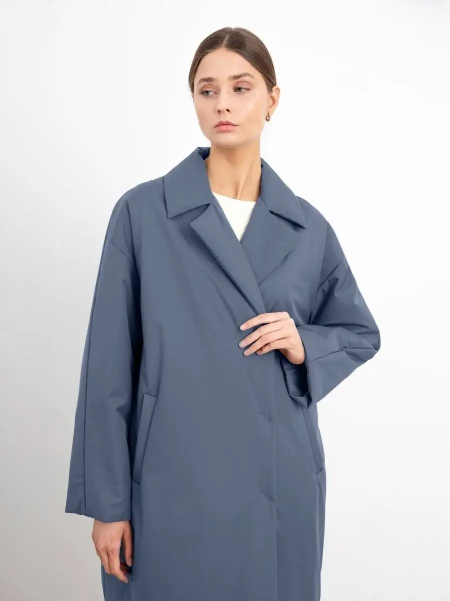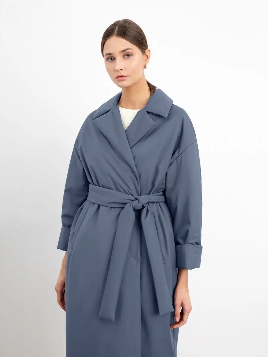 Описание: Дутое женское пальто-кокон утепленное прямого свободного силуэта. Универсальная длина ниже колена. Выполнено из плащевой ткани глубокого серо-голубого цвета. На пальто английский воротник, рукав полной длины: спереди - рубашечный, сзади - реглан, переходящий в кокетку спинки. По низу рукава сделан отворот. Карманы-листочки, застежка на пришивные кнопки. За счет пояса создается более женственный и мягкий силуэт. Дополнит гардероб: классический, офисный, casual, спортивный. Произведено в Санкт-Петербурге с использованием запатентованной высокотехнологичной мембраны Raft Pro, надежно защищающей от ветра и влаги. Станет хорошим подарком на праздник, День Рождения, Новый год, 14 февраля и 8 марта маме, сестре, бабушке или любимой подруге. Модную верхнюю одежду Pompa весна осень зима можно найти по запросам: пальто утепленное, полупальто, пуховики зимние, на свадьбу, куртка, плащ, тренч, ветровка, шуба меховая короткая с капюшоном, пиджак оверсайз.