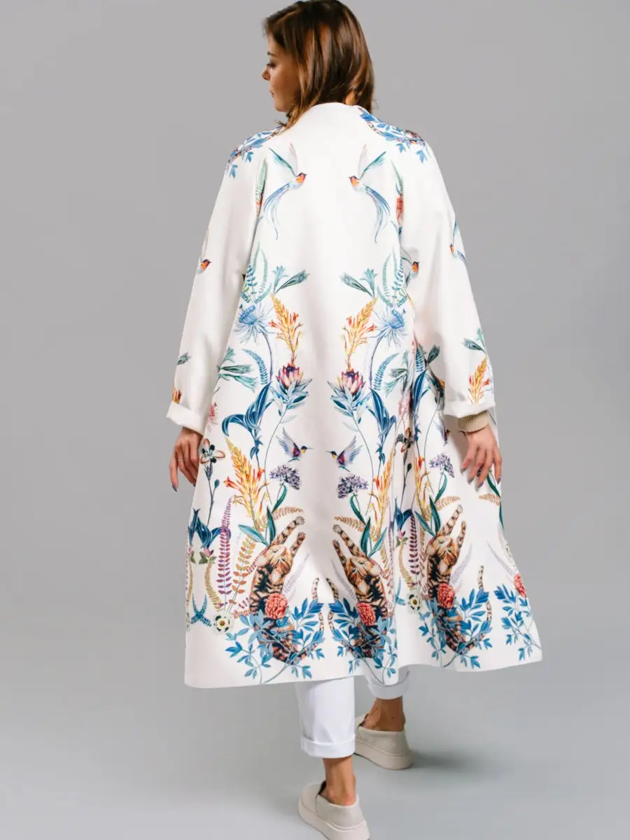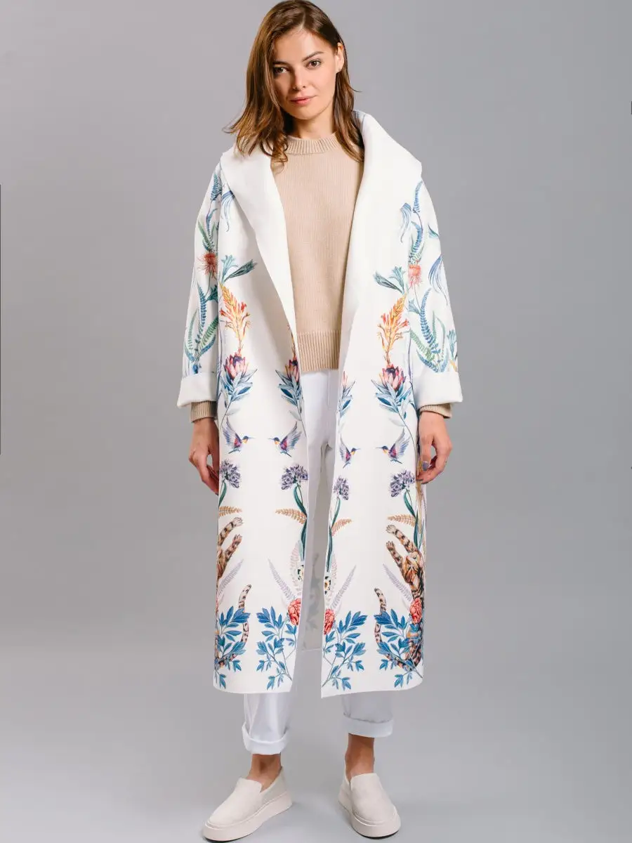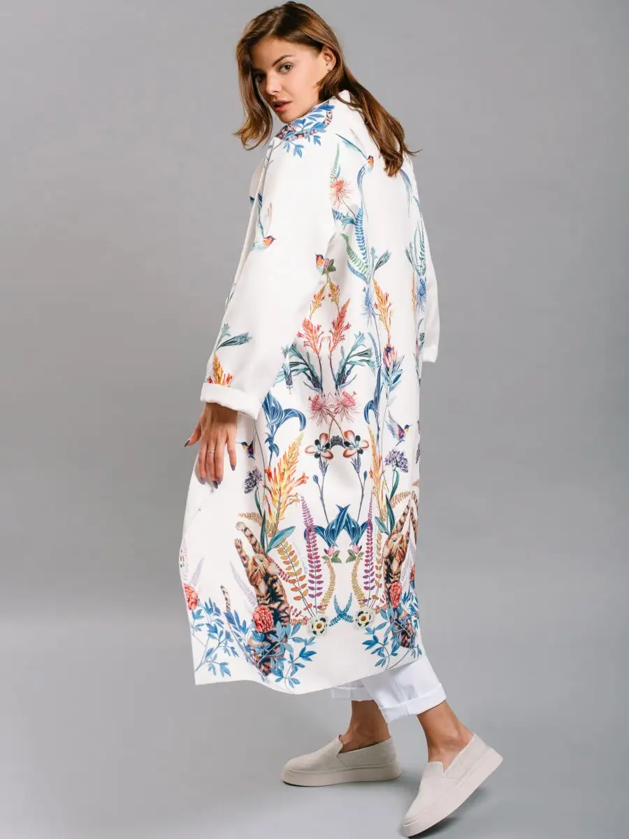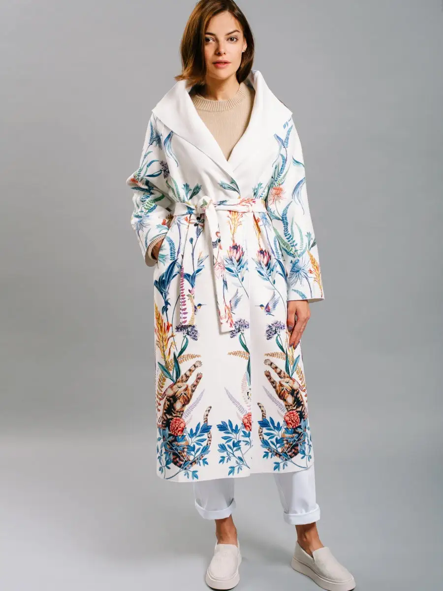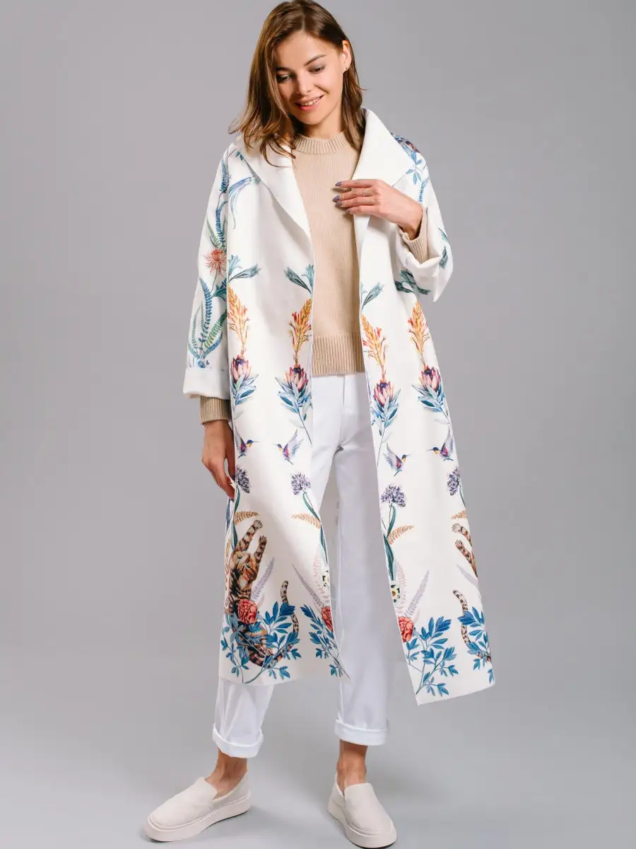 Описание: Легкое женское пальто кроя оверсайз из вискозы на лето, теплую весну и осень. Ткань мягкая приятная на ошупь, но плотная. Края пальто окантованы нитью. Есть карманы, пояс в комплекте. На ткани фирменный принт Yadviga Locika с котиками и цветами. Можно стирать в стиральной машине. Пальто отлично подойдет с кроссовками, кедами и туфлями, брюками и юбками, можно носить в офис, на прогулку, на праздник или свидание. Состав: 50% вискоза, 50% полиэстер. Есть похожая модель арт. 13143174. На рисунке кошки, растения, цветы, птицы, листья.