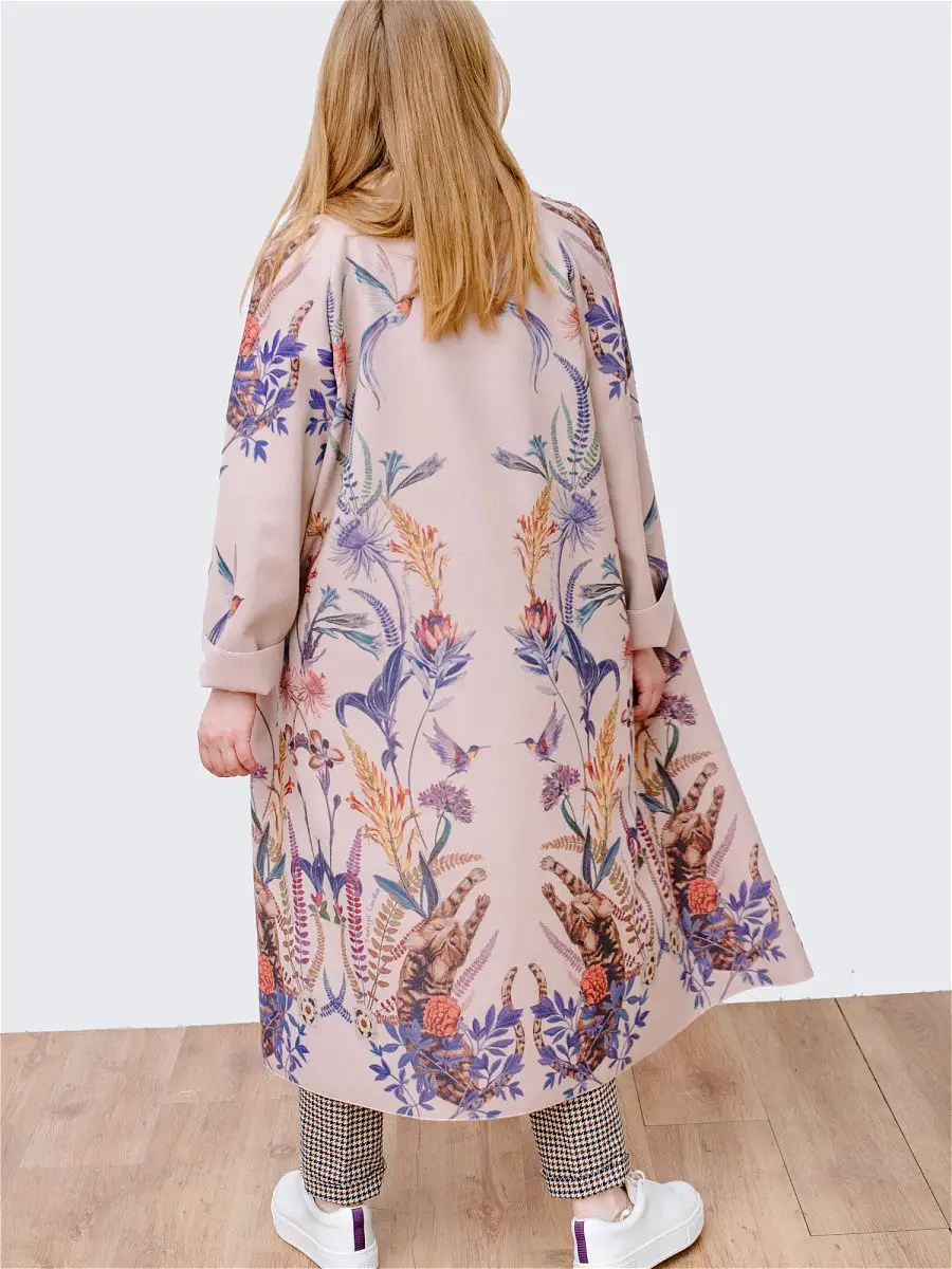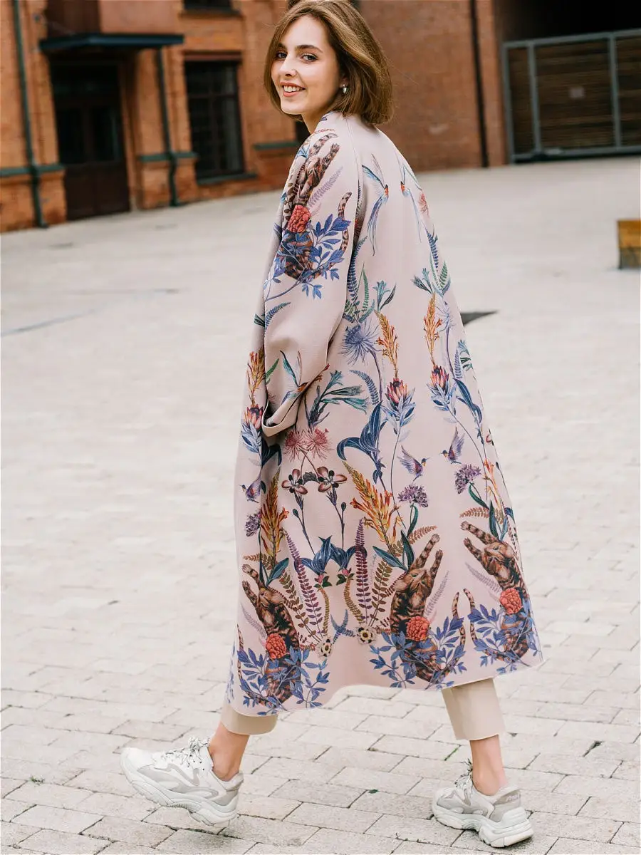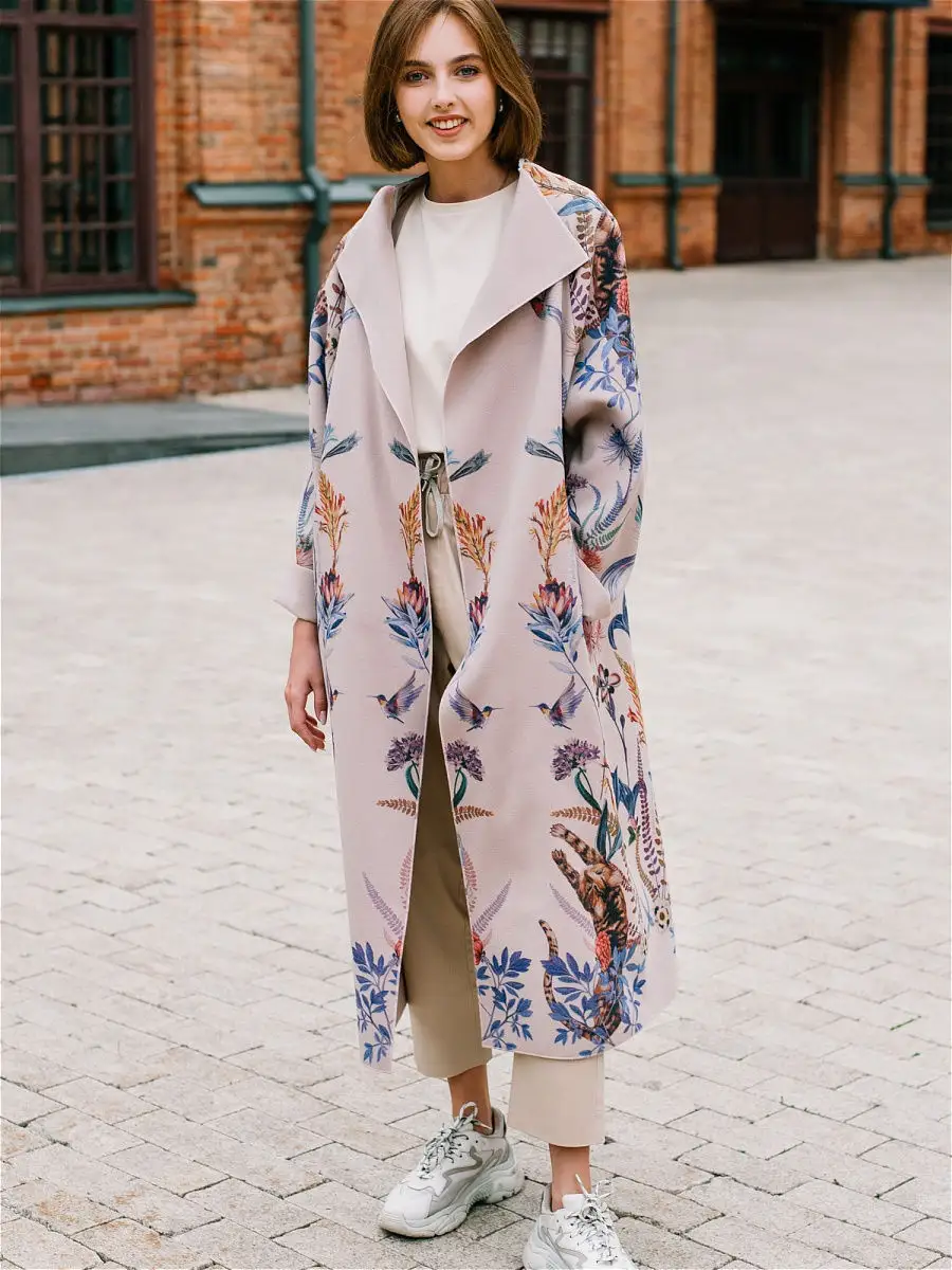 Описание: Легкое женское пальто кроя оверсайз из вискозы на лето, теплую весну и осень. Ткань мягкая приятная на ошупь, но плотная. Края пальто окантованы нитью. Есть карманы, пояс в комплекте. На ткани фирменный принт Yadviga Locika с котиками и цветами. Можно стирать в стиральной машине. Пальто отлично подойдет с кроссовками, кедами и туфлями, брюками и юбками, можно носить в офис, на прогулку, на праздник или свидание. Состав: 50% вискоза, 50% полиэстер. Есть похожая модель арт. 13143174. На рисунке кошки, растения, цветы, птицы, листья.