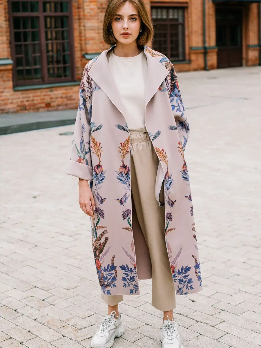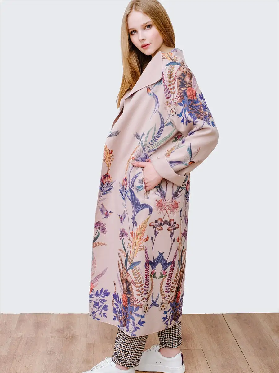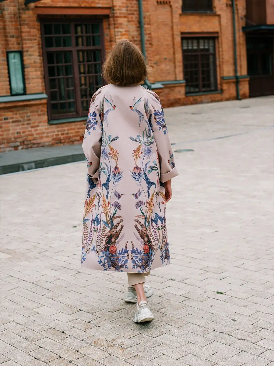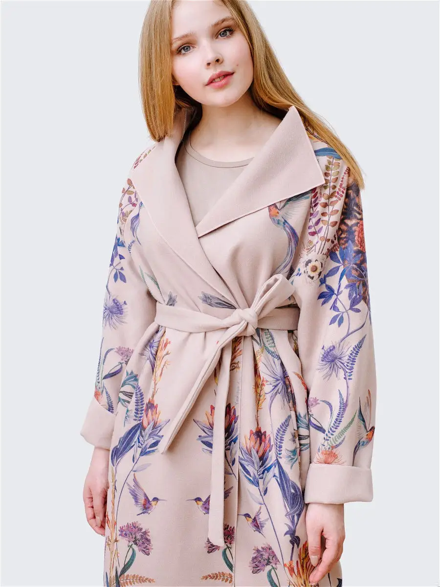 Описание: Легкое женское пальто кроя оверсайз из вискозы на лето, теплую весну и осень. Ткань мягкая приятная на ошупь, но плотная. Края пальто окантованы нитью. Есть карманы, пояс в комплекте. На ткани фирменный принт Yadviga Locika с котиками и цветами. Можно стирать в стиральной машине. Пальто отлично подойдет с кроссовками, кедами и туфлями, брюками и юбками, можно носить в офис, на прогулку, на праздник или свидание. Состав: 50% вискоза, 50% полиэстер. Есть похожая модель арт. 13143174. На рисунке кошки, растения, цветы, птицы, листья.