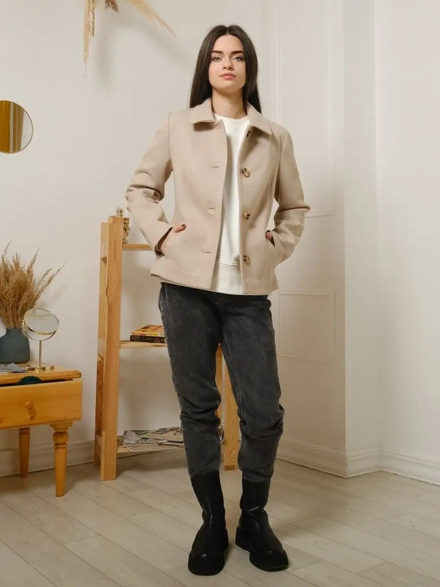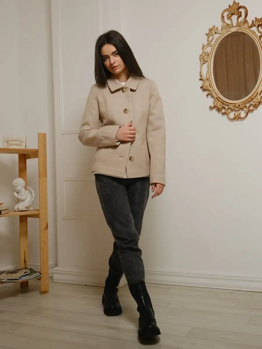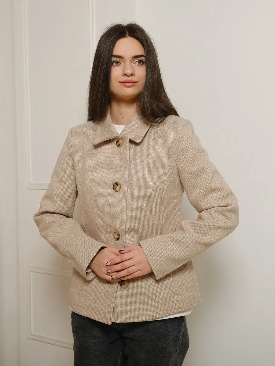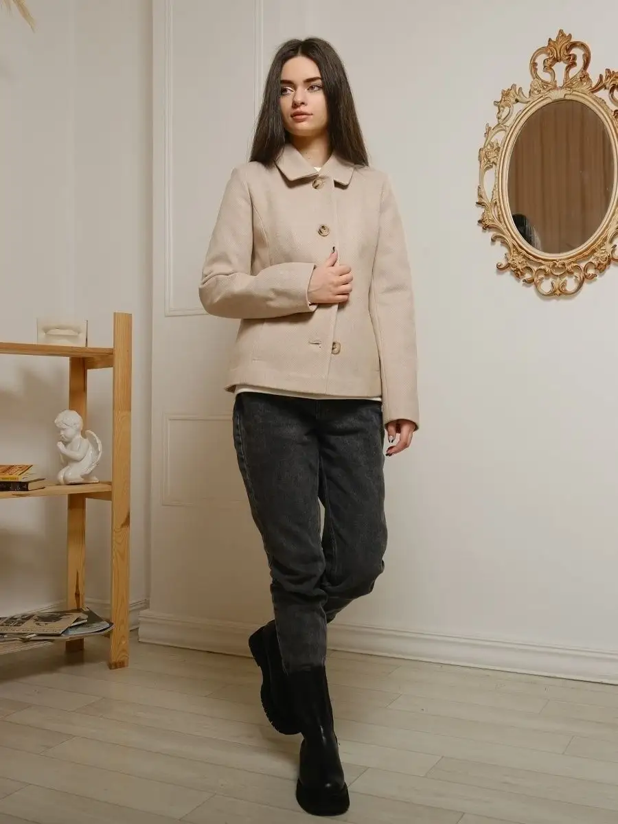 Описание: РЕКОМЕНДУЕМ брать НА РАЗМЕР БОЛЬШЕ своего. Демисезонное весеннее короткое однобортное пальто - жакет, драповое шерстяное укороченное пальто - пиджак. Модель "Злата". Посадка по фигуре, полуприлегающая. Материал верха - плотный драп премиального качества (шерсть 55%), подклад из поливискозы. Воротник отложной. Вертикальные прорезные карманы. Длина по спинке 60 см. Рукава прямые втачные. Сезон весна - осень. Ростовка рассчитана на рост 162-168 см. Комфортно при температуре от +15 до +5 градусов.