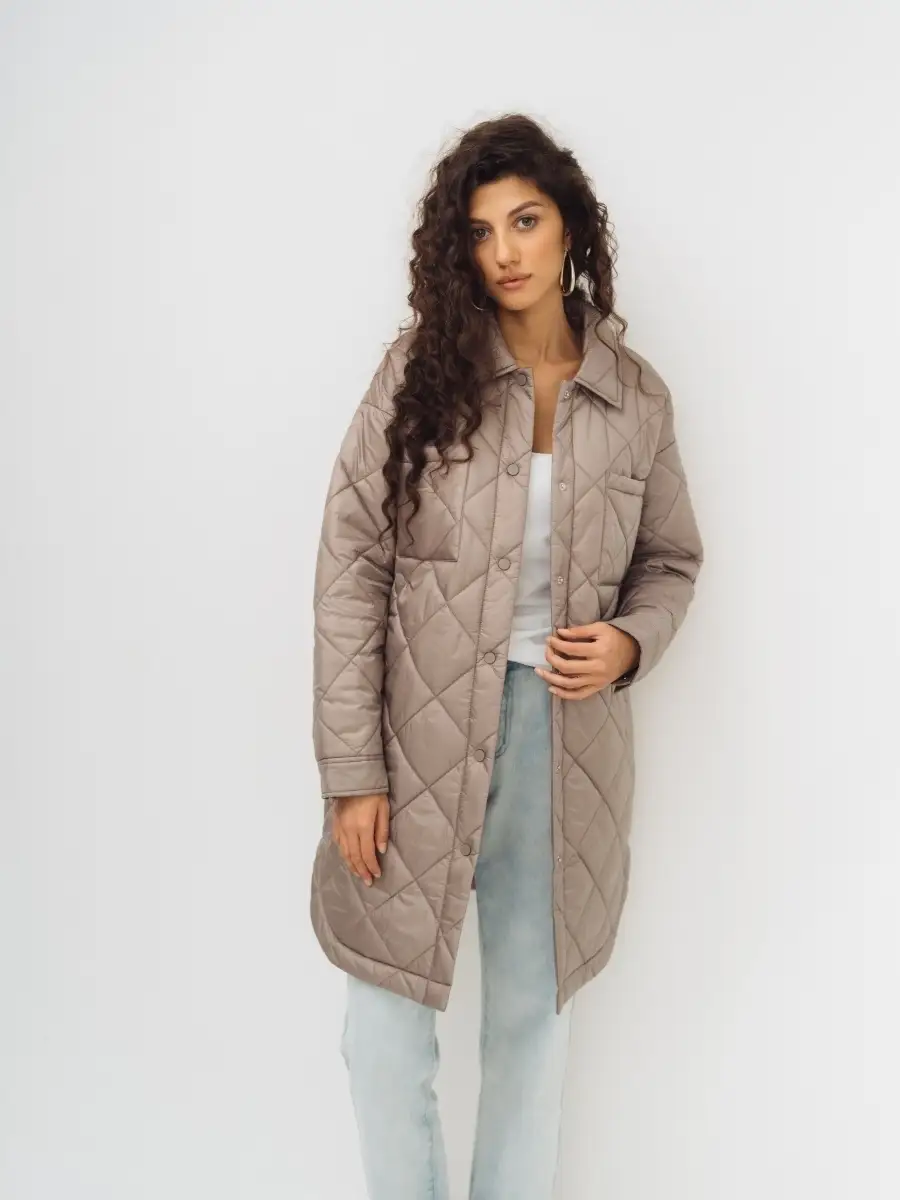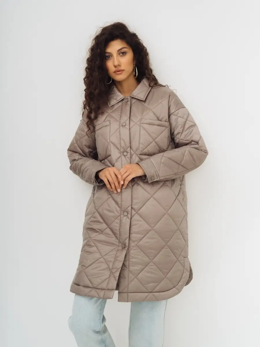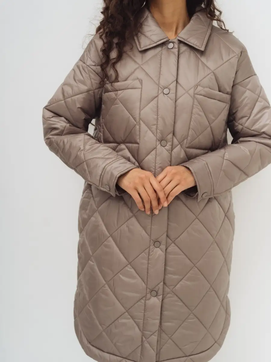 Описание: Стеганное пальто-рубашка оверсайз, на синтепоне из нейлоновой ткани. Стежка ромбами. Пальто свободного прямого силуэта, длина выше линии колен, по бокам скругленная линия низа. Застежка на кнопки в цвет ткани, отложной воротник, без капюшона. Карманы верхние накладные, нижние в боковых швах. По низу рукавов манжеты с кнопкой. Представлено в бежевом и графитовом цветах.