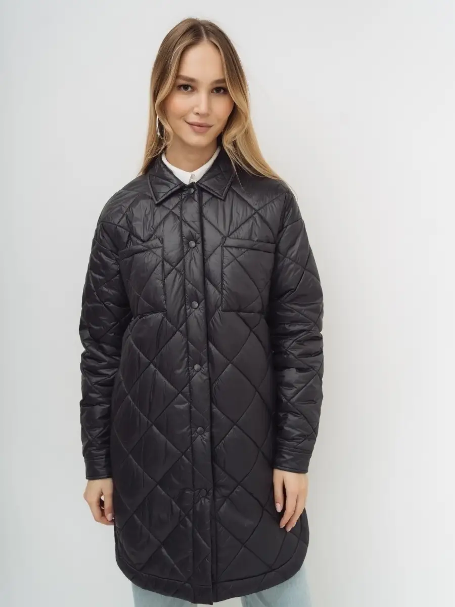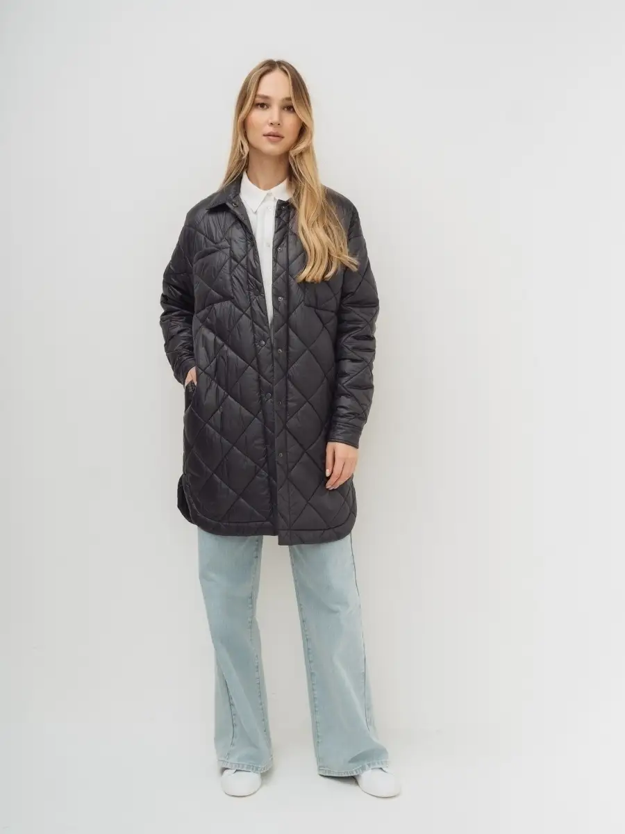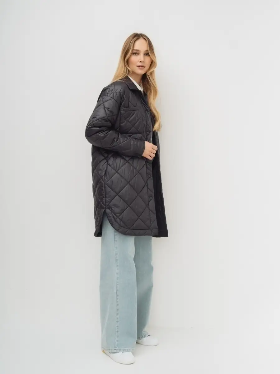 Описание: Стеганное пальто-рубашка оверсайз, на синтепоне из нейлоновой ткани. Стежка ромбами. Пальто свободного прямого силуэта, длина выше линии колен, по бокам скругленная линия низа. Застежка на кнопки в цвет ткани, отложной воротник, без капюшона. Карманы верхние накладные, нижние в боковых швах. По низу рукавов манжеты с кнопкой. Представлено в бежевом и графитовом цветах.