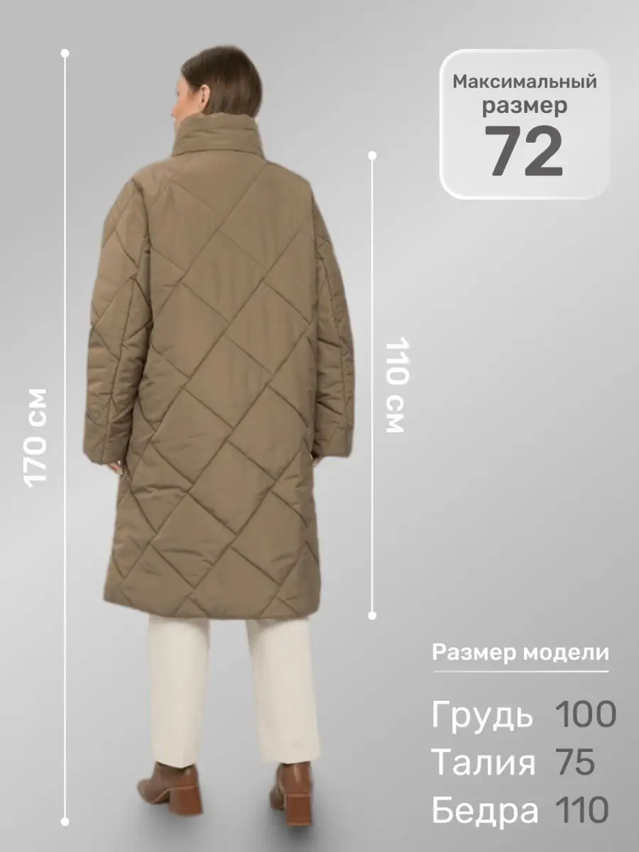 Описание: Пальто стеганое является альтернативой длинной куртки и шубе. Тепло зимой как будто одел пуховик женский зимний длинный. Пальто из стеганой, плащевой ткани и плащевой глади. Без капюшона и без меховой опушки. Длина изделия ниже колена по спинке 110 см. Покрой прямого силуэта без разрезов длинна ниже колена. Двубортное, борта прямые. Застежка на молнию и кнопки Карманы расположены в шве. Рукава втачные, длинные, с манжетам. Утеплитель синтепон 200 г на кв.м. До -15 градусов. Подкладка полиэстер 100%. Дышащая ткань Идеальная посадка по фигуре. Размеры соответствуют ГОСТ. Большой размерный ряд. Большие размеры женщинам. Возможен цвет черный. Может подойти как пальто для беременных весна