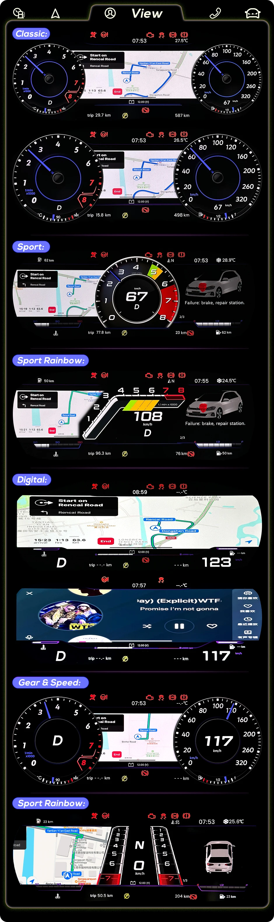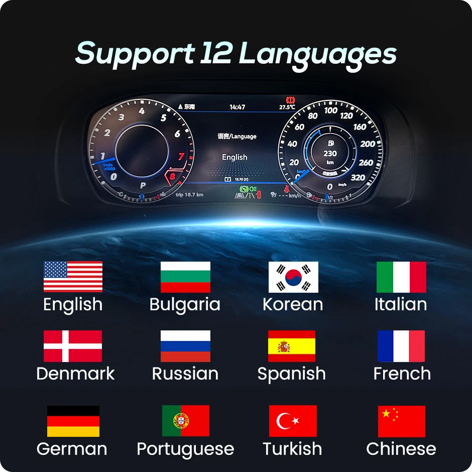 Этот продукт способен заменить оригинальную автомобильную приборную панель более совершенным и современным дисплеем, обеспечивая при этом более точную и четкую информацию о транспортном средстве, такую как скорость, обороты и уровень топлива. Кроме того, он может настраивать содержимое и стиль отображения в соответствии с потребностями различных пользователей.