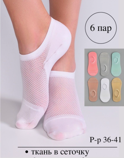 Описание: Короткие носки из легкой ткани, отличный женский выбор для девушки и девочки, которые любят спорт, комфорт и удобство во всем: тонкие, едва заметные на ноге, следки женские помогут избежать дискомфорта даже в очень жаркую погоду. Модель выполнена из сетчатого материала с усилением на носке и пятке: спортивные летние носки с аккуратной резинкой собирают только восторженные женские и мужские отзывы, которые всегда в поисках качественных изделий. Набор носков имеет в составе хлопок c добавлением лайкры: подследники идут с мягкой резинкой и с силиконом на пятке, что дает возможность зафиксировать носок на ноге и не дает ему слезть.