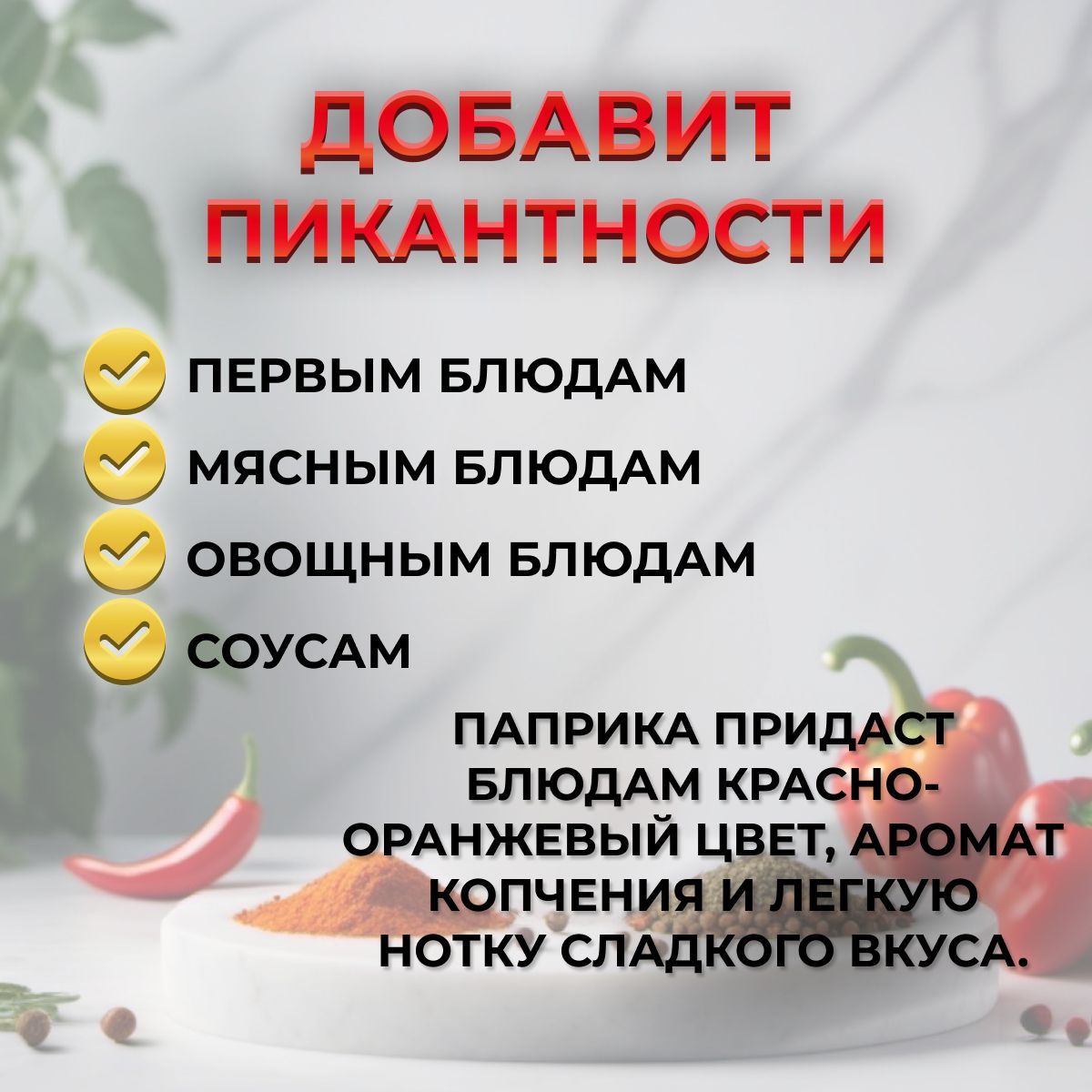 • Эта специя имеет ярко-красный цвет, который делает блюда визуально привлекательными.
