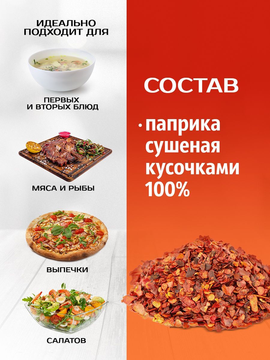 Описание: Паприка красная сушеная резаная станет отличительной чертой для вашей пищи. Это незаменимый компонент в мировых национальных кухнях и идеальное дополнение как для первых и вторых блюд так и для выпечки. Кроме того, паприка обладает огромным количеством полезных компонентов - витаминами и минералами. Не содержит консерватов и красителей. Противопоказания: индивидуальная непереносимость компонентов.